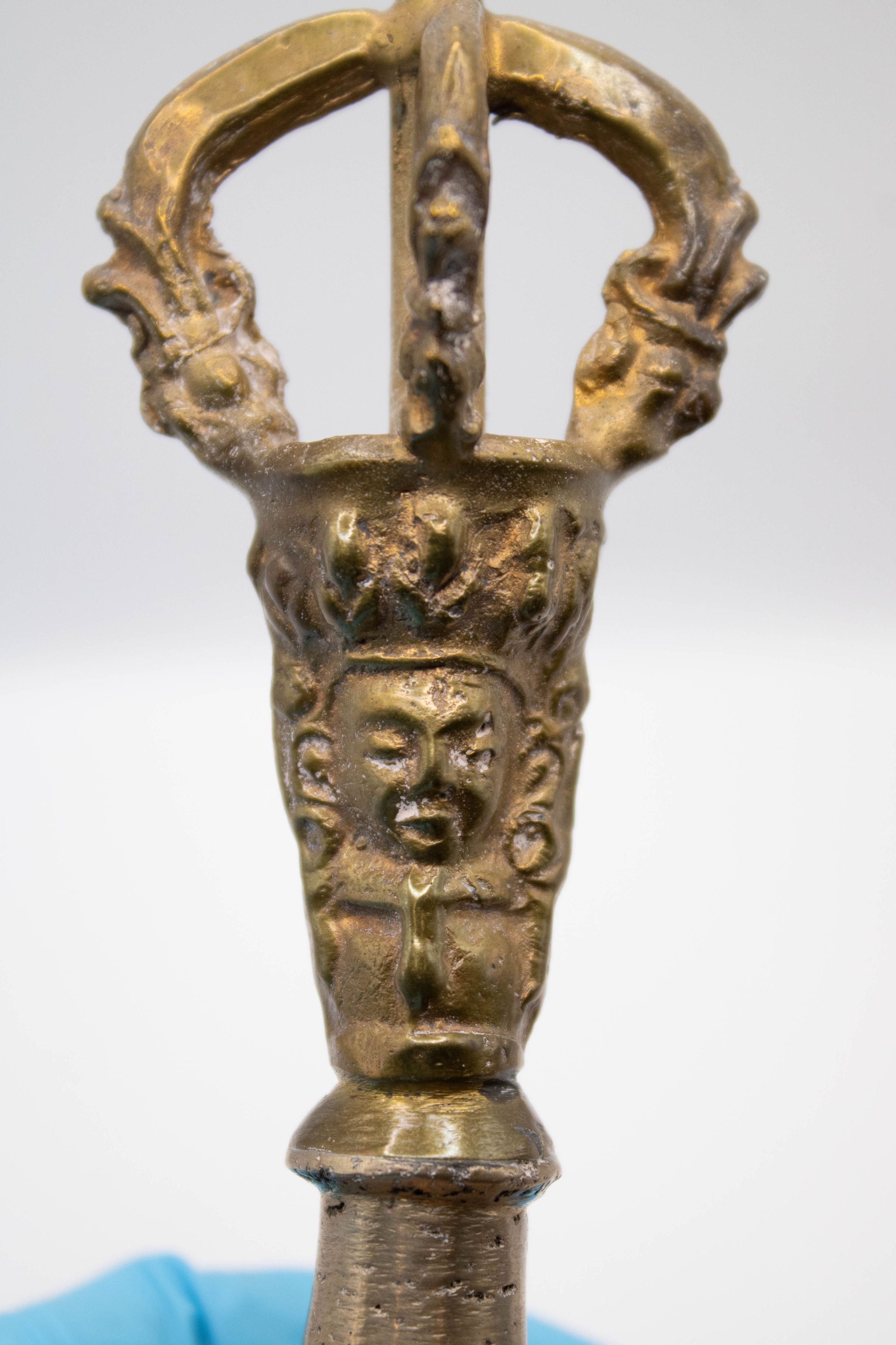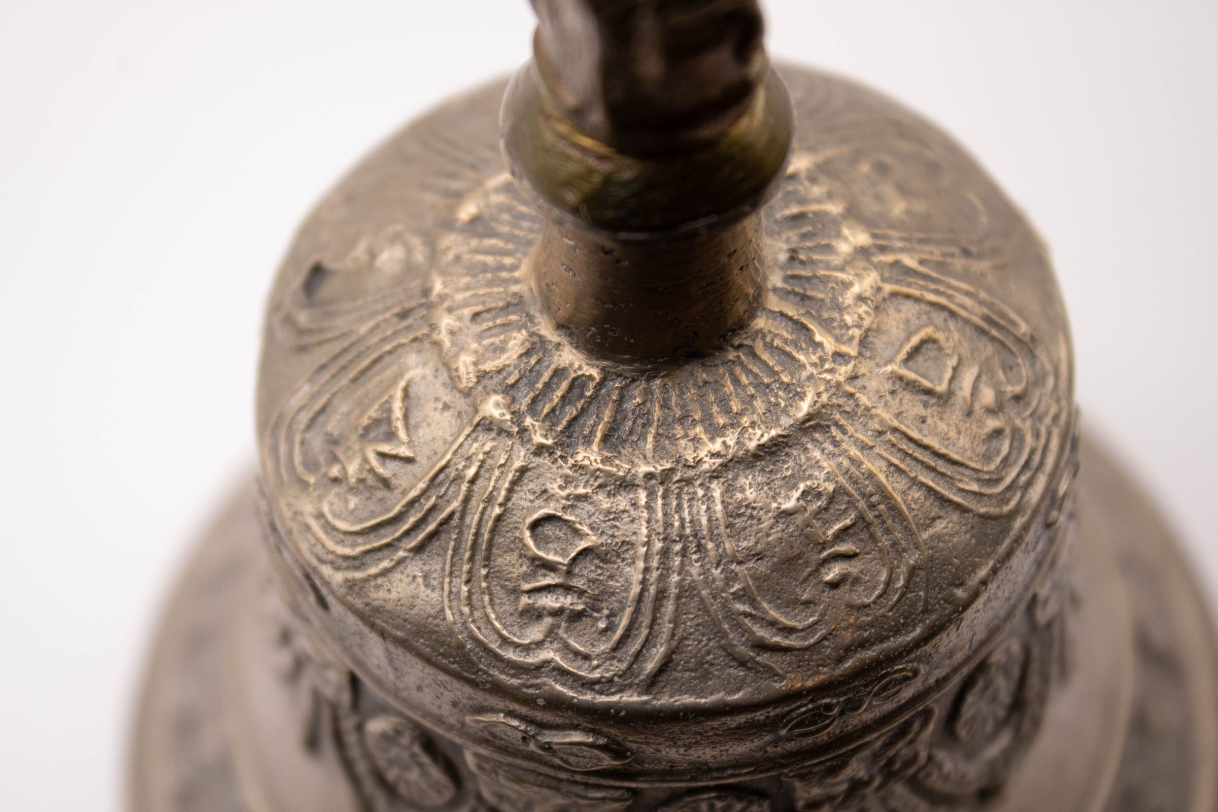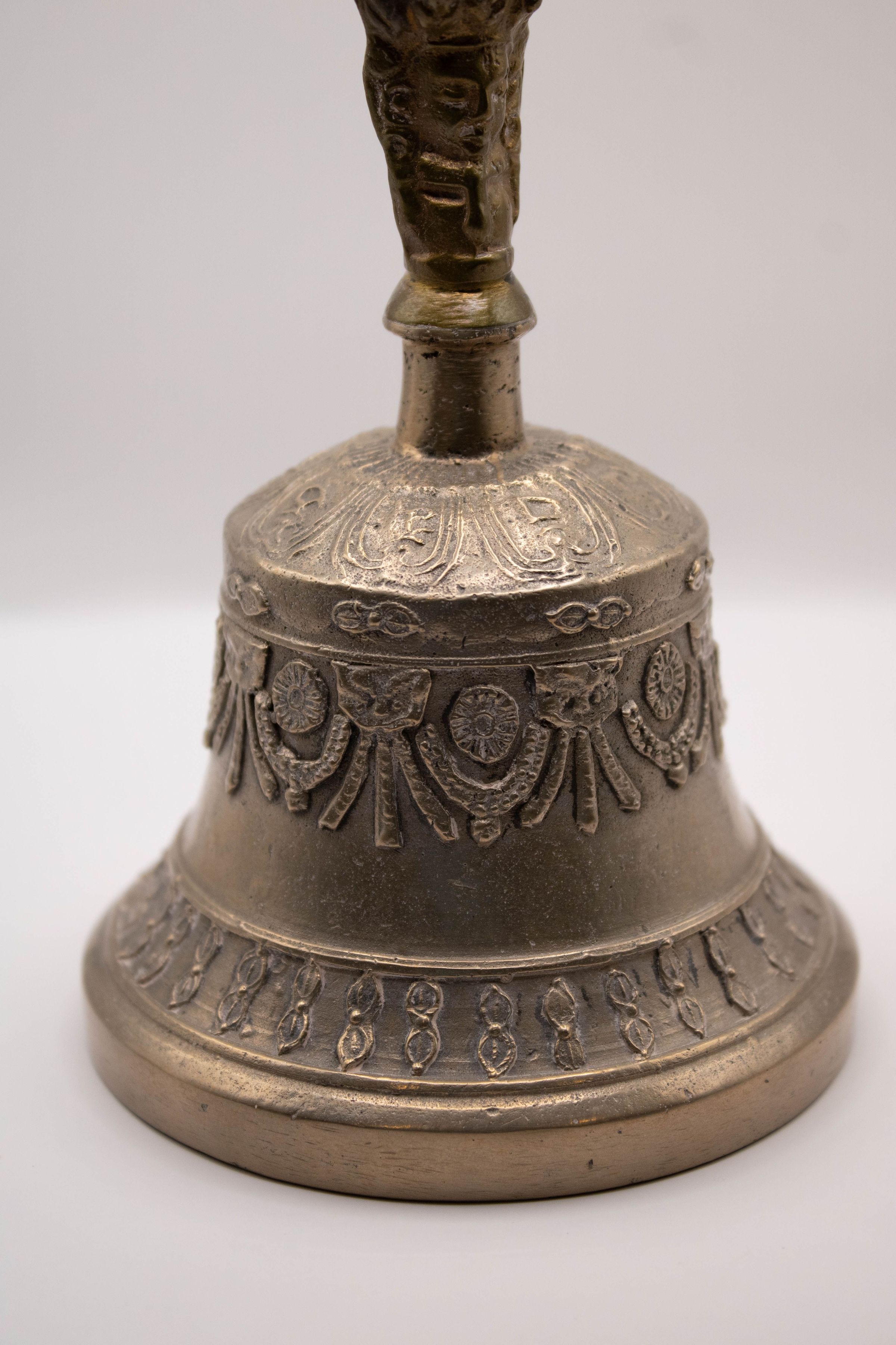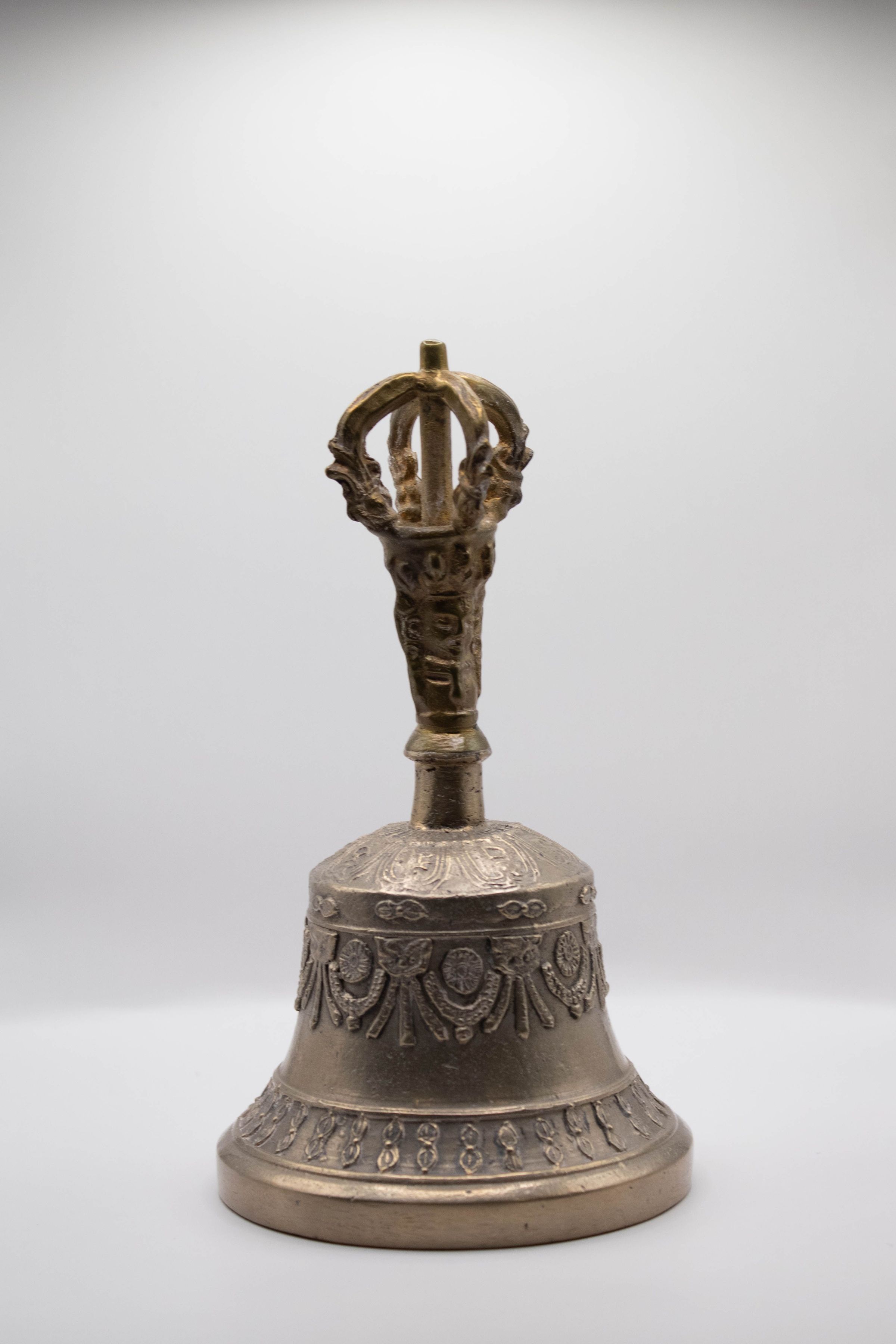 The Tibetan brass prayer bell features intricate designs and a crown-shaped handle on top.