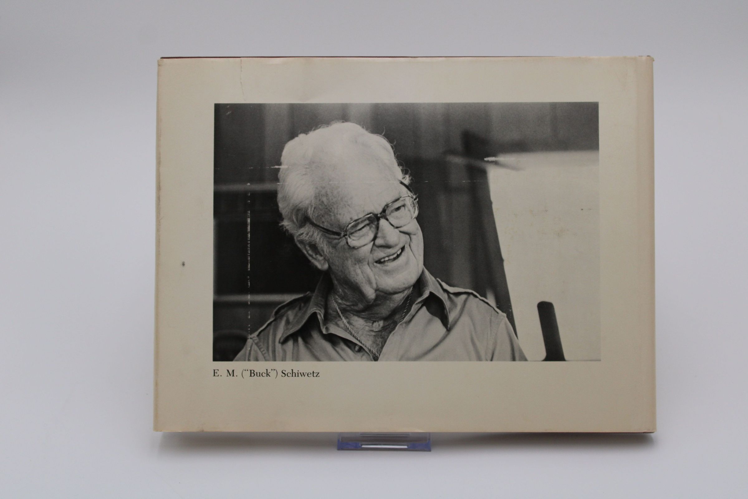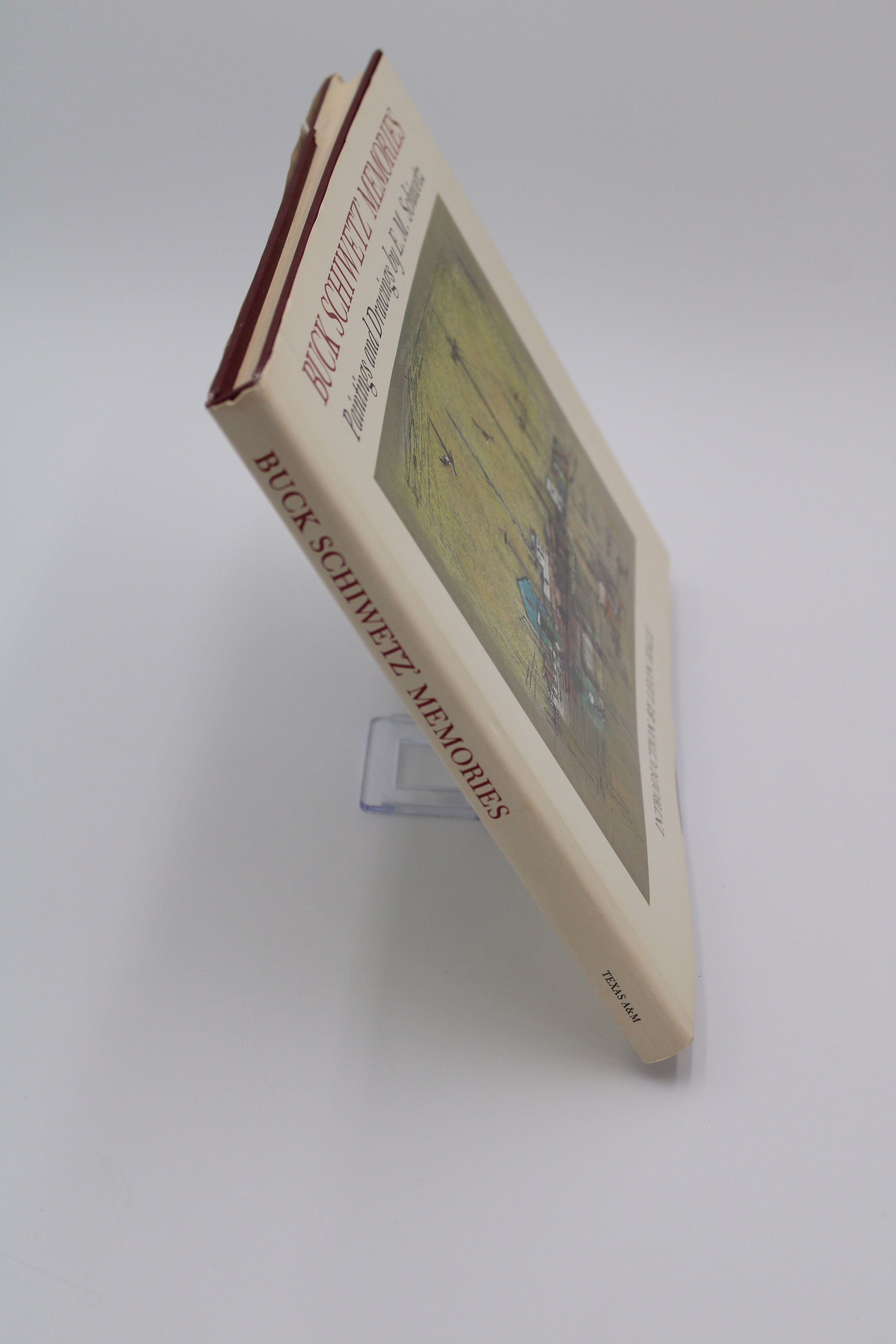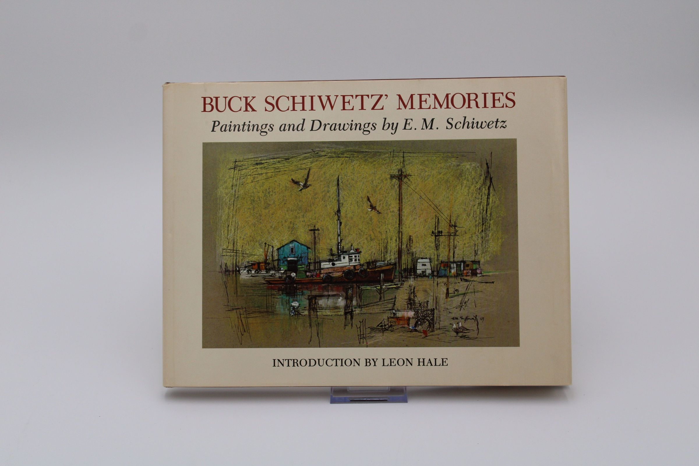 The front cover of “Buck Schiwetz' Memories” features a Schiwetz painting of a shipyard in the middle. The top of the book has the title and subtitle of "Paintings and Drawings by E.M. Schiwetz" in a serif font. The book is landscape and is an off-white color.