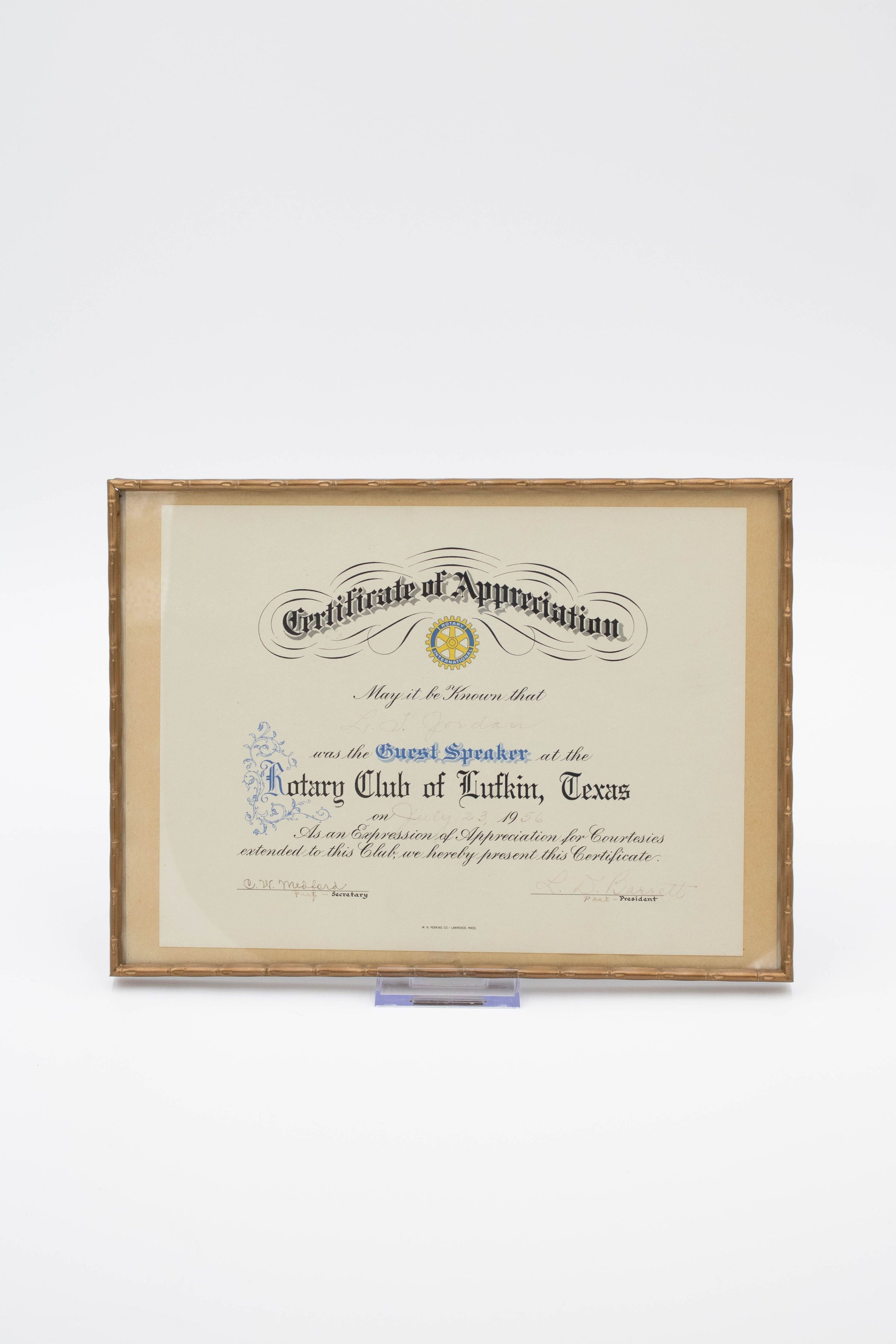Image of a framed Certificate of Appreciation from the Rotary Club of Lufkin, Texas. The certificate is to commemorate L.T. Jordan on making a guest speaker appearance. The frame is thin and made of a polished wood.