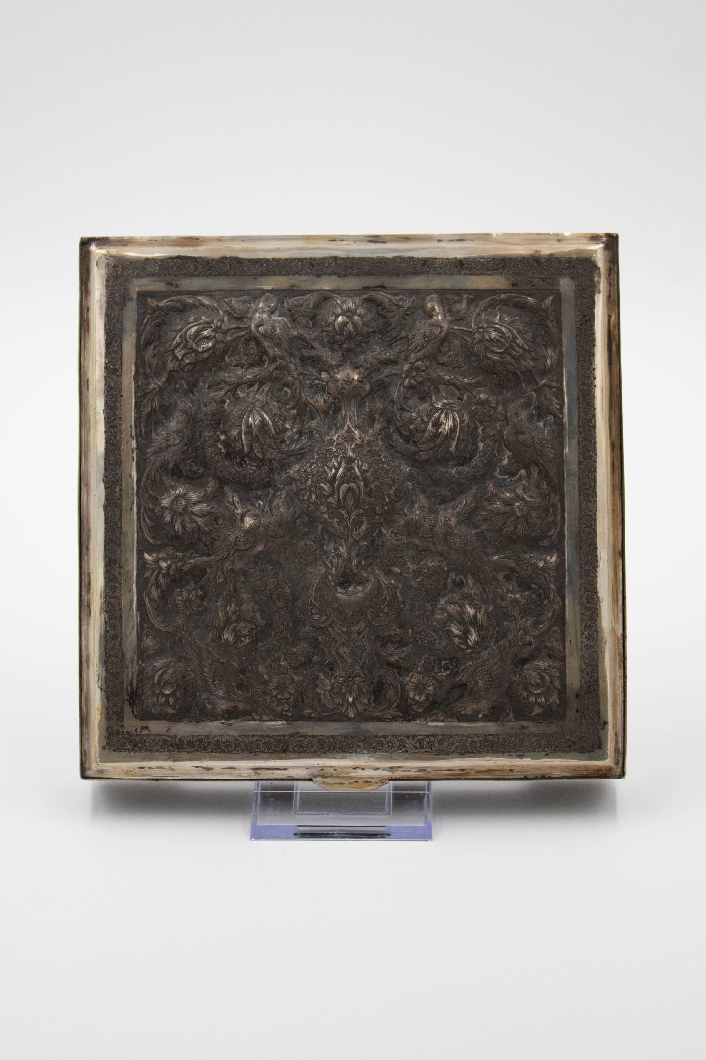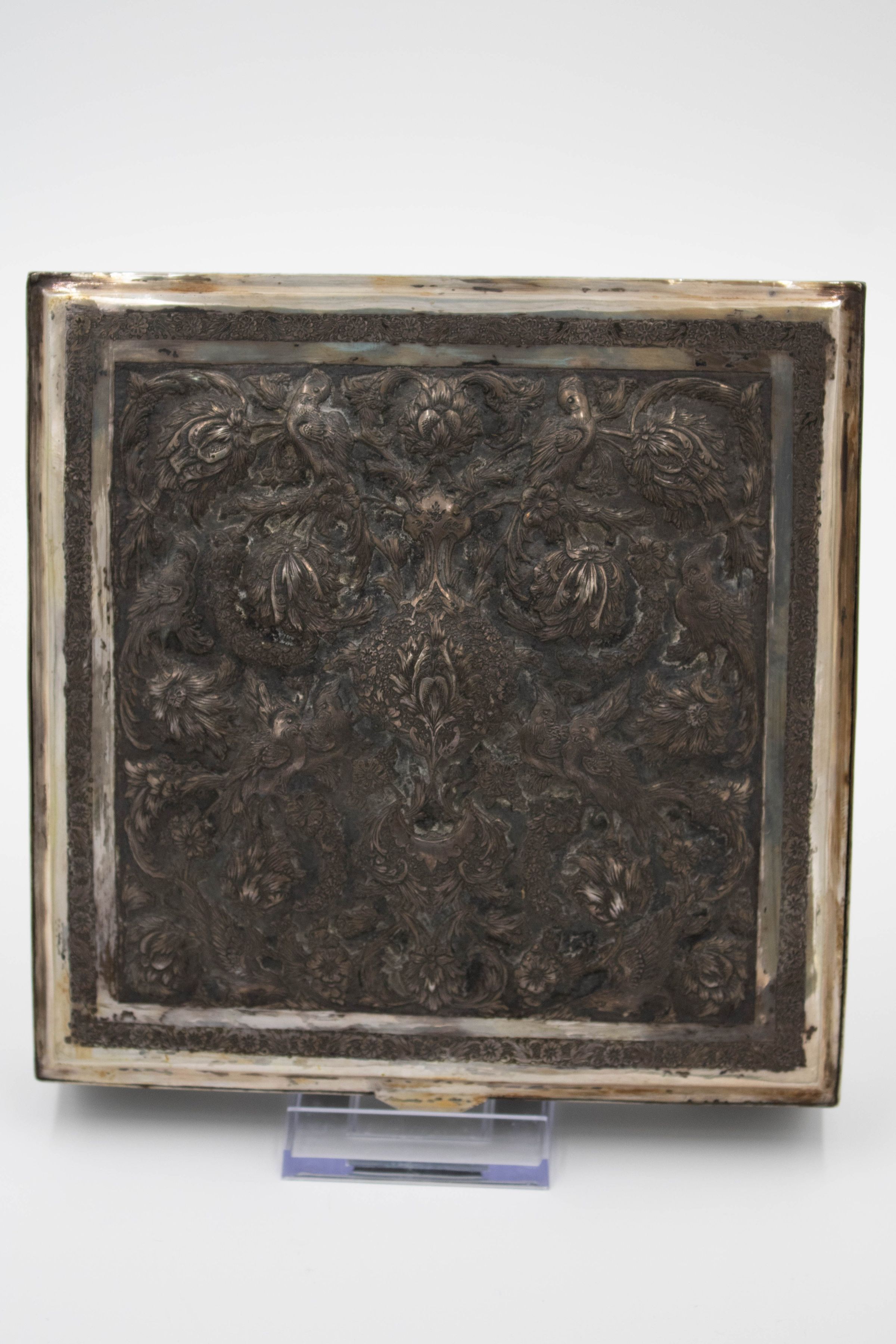 Large Persian silver shallow square box with lid. The box is decorated with an etched flowers and leave motif.Context