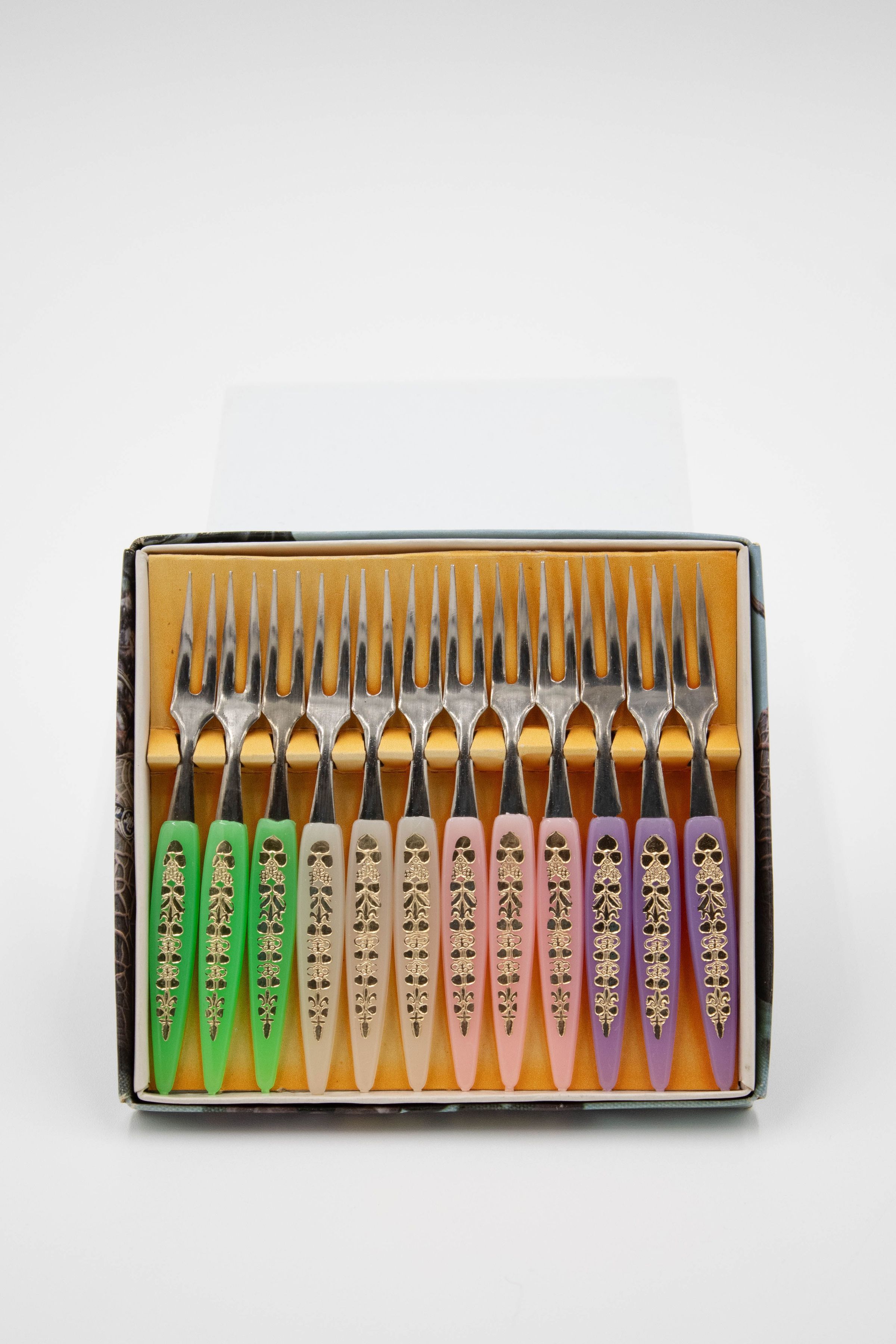 Set of twelve little forks were made in Japan and come in purple, pink, white, and green handles. They were produced during the mid-20th century.Context