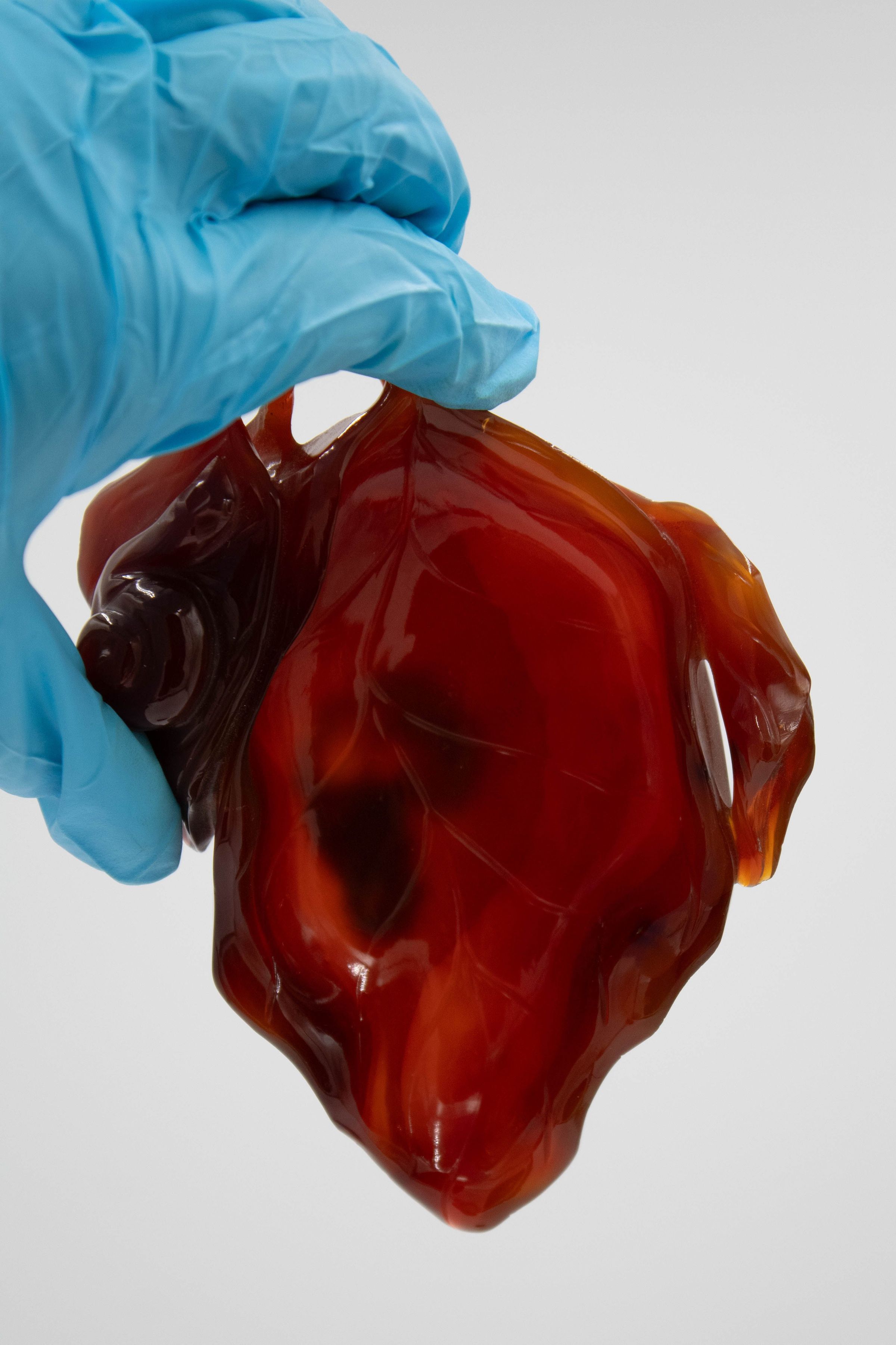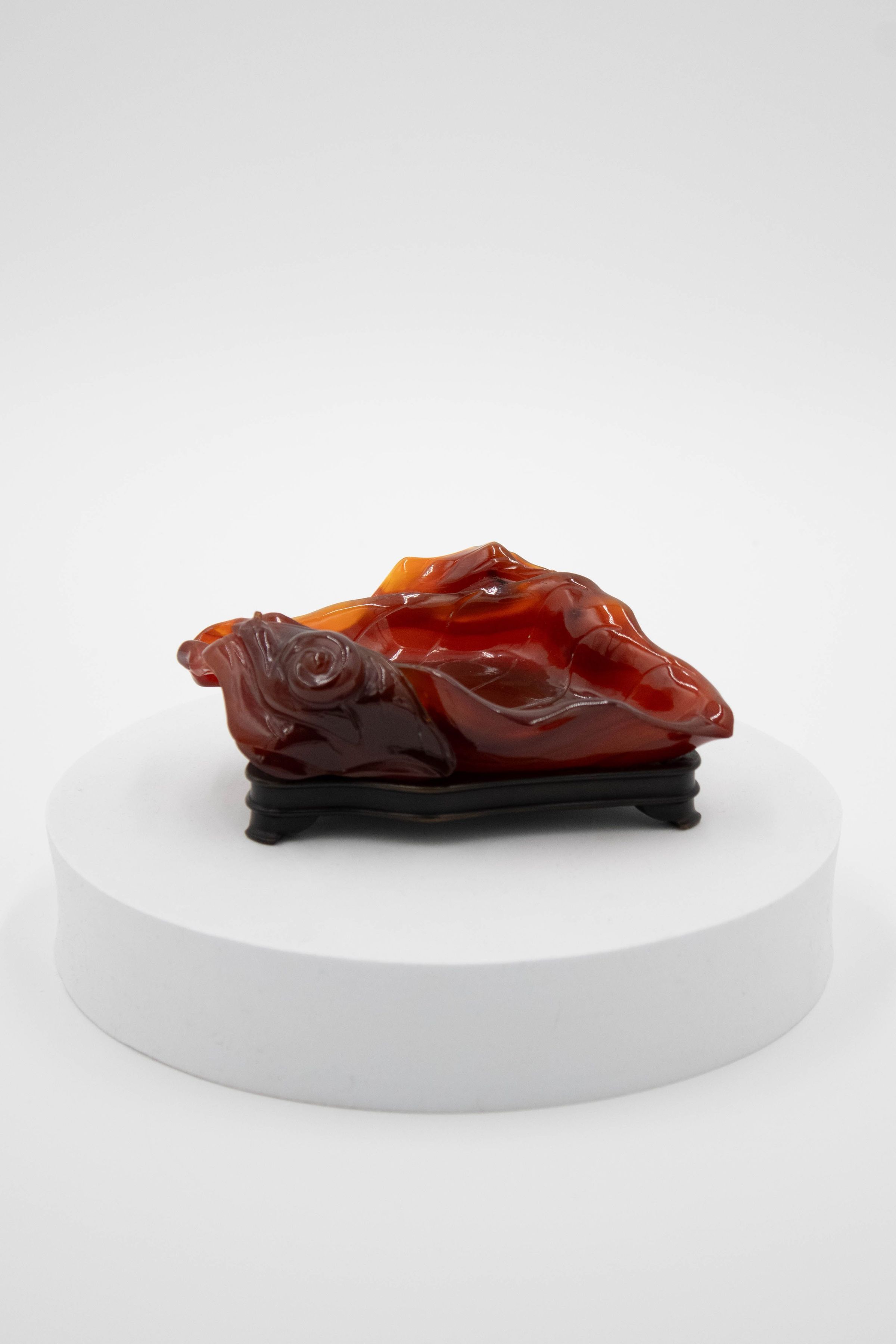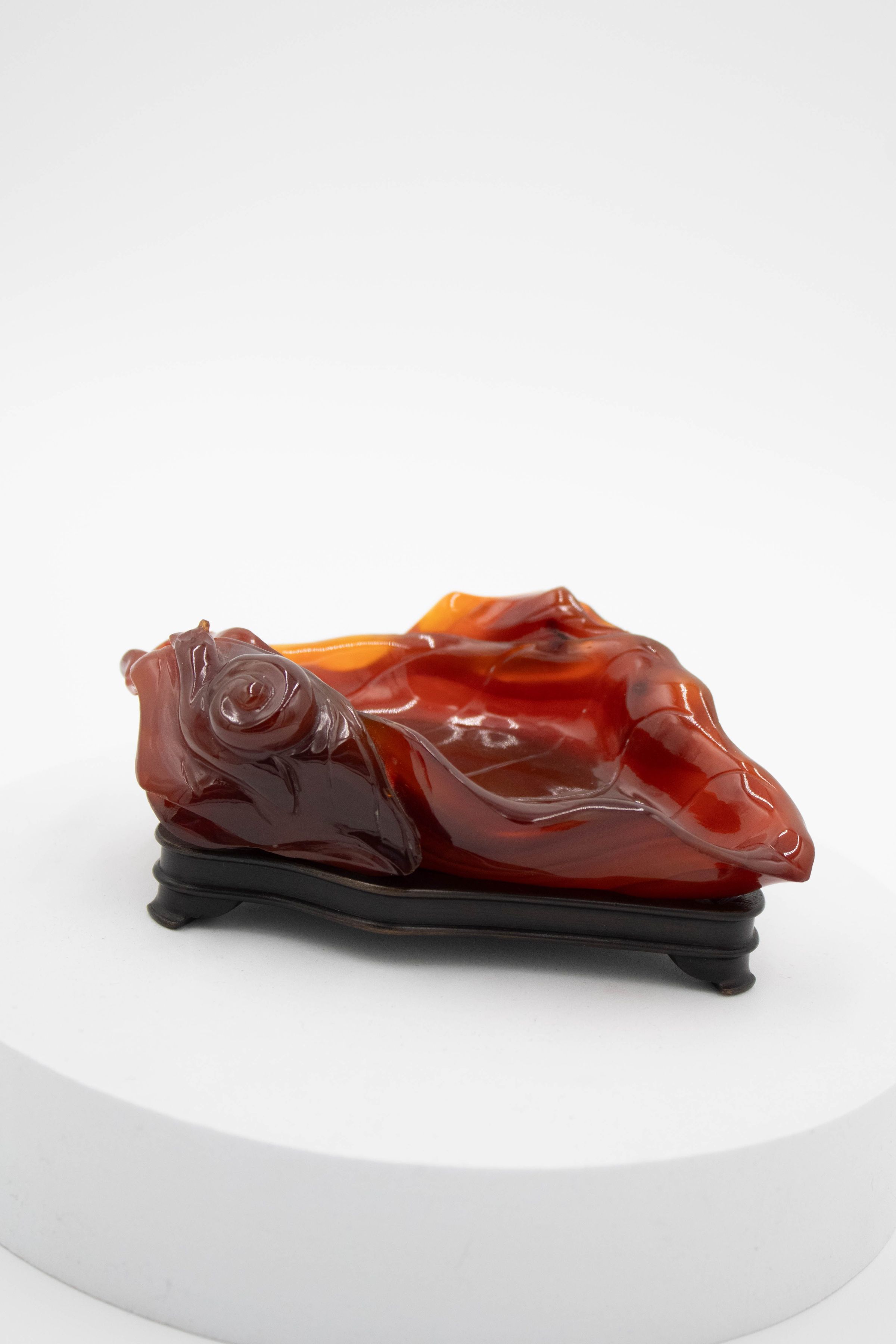 Carved amber dish in leaf design on wooden base. The leaf is made of red-colored amber and the base is ebony wood.Context