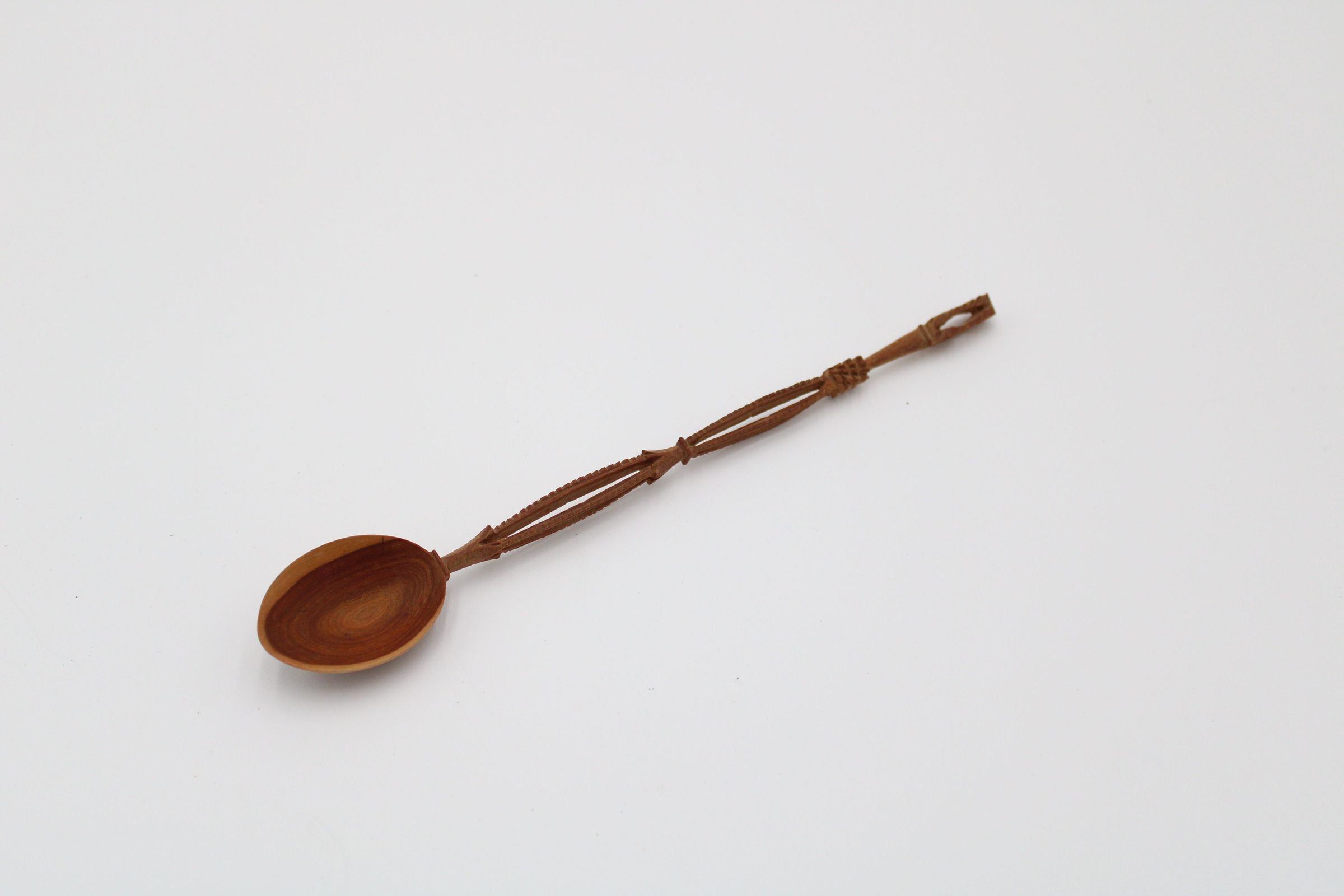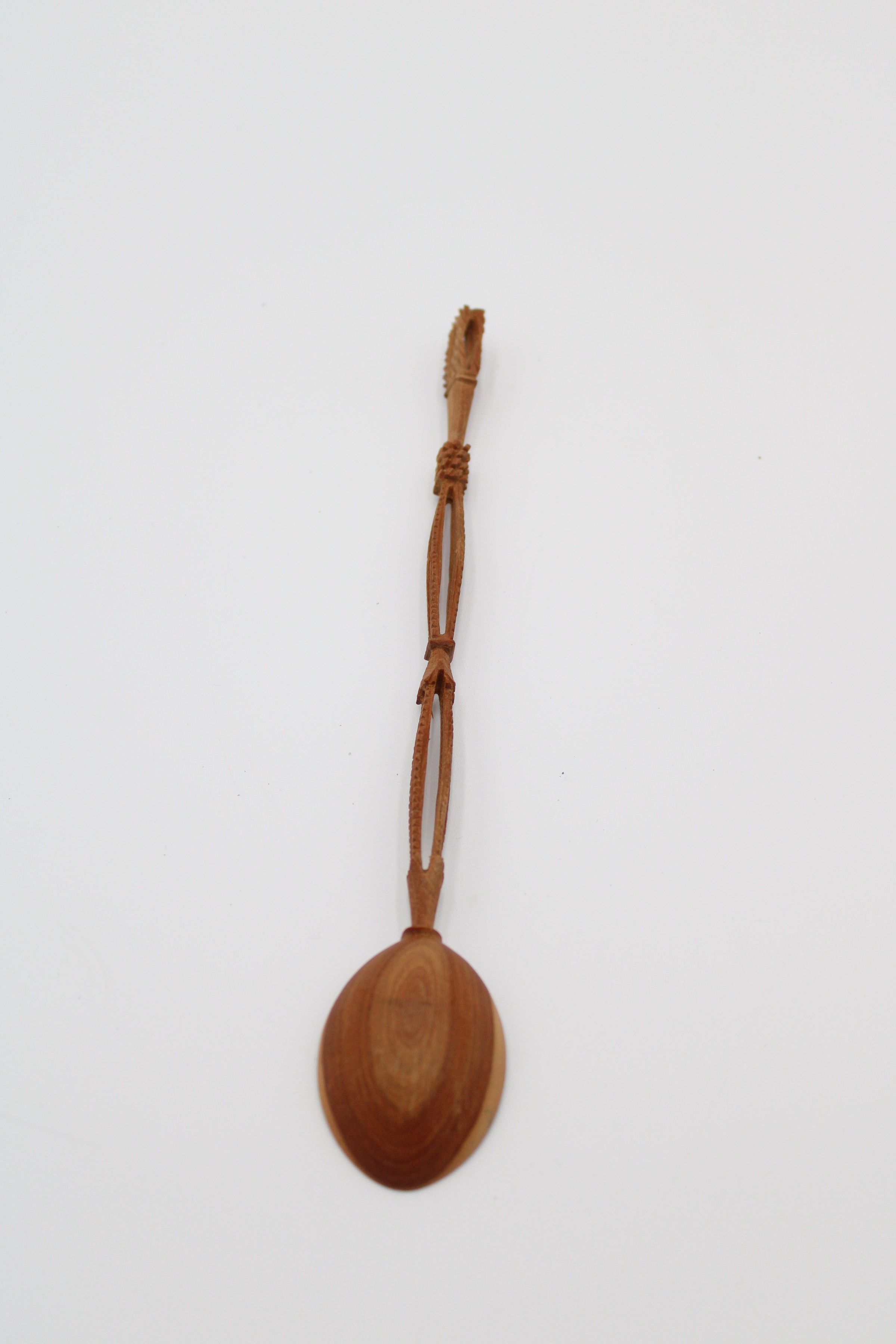Image of the spoon. The spoon is carved from a dark brown wood that changes to a lighter shade in the outline of the spoon's bowl. The spoon is coated in a polish that gives it a matte finish.
