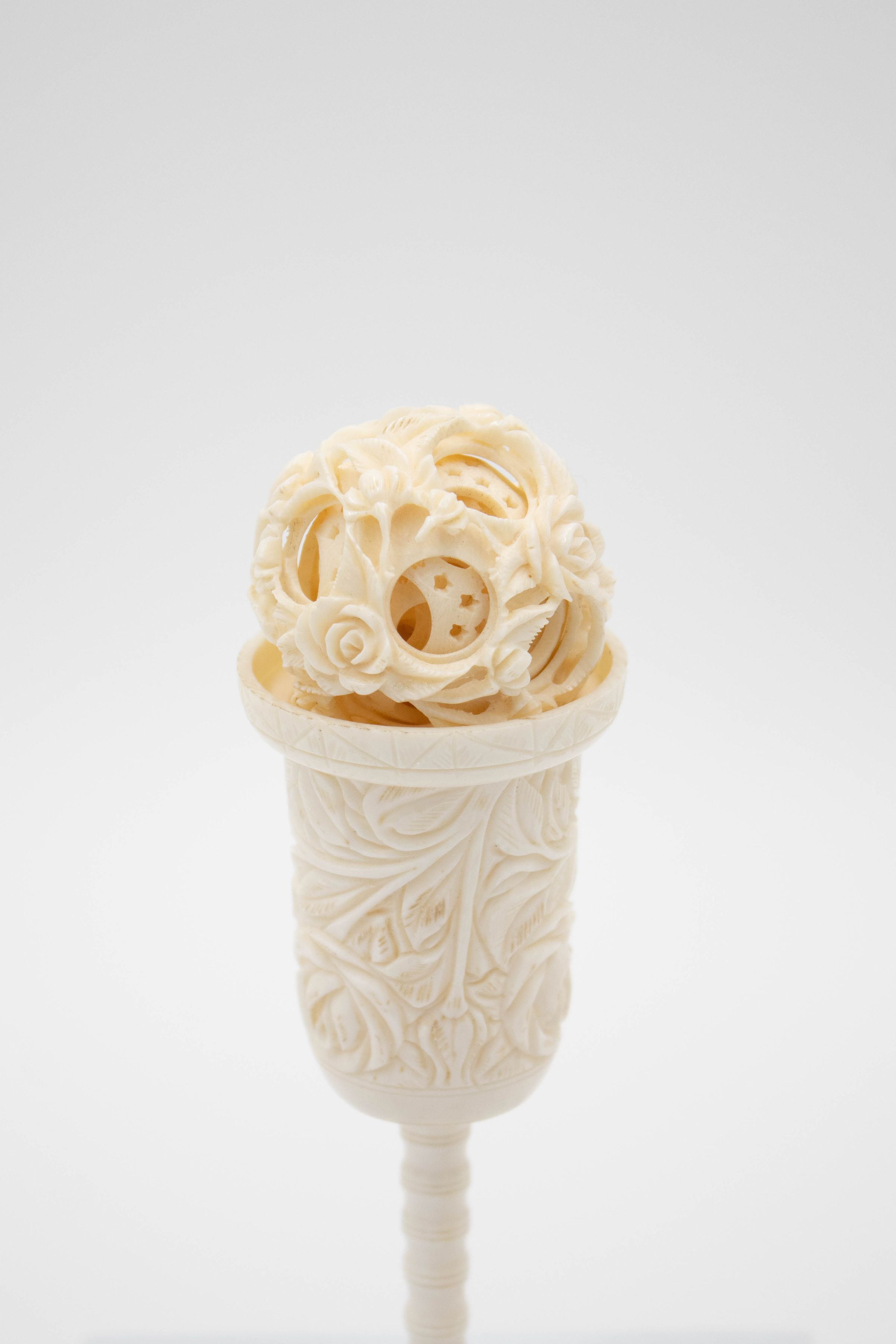 Carved ivory Chinese puzzle ball with pedestal. It is roughly 6.5" tall and decorated with floral rose patterns. It was made in India.Context