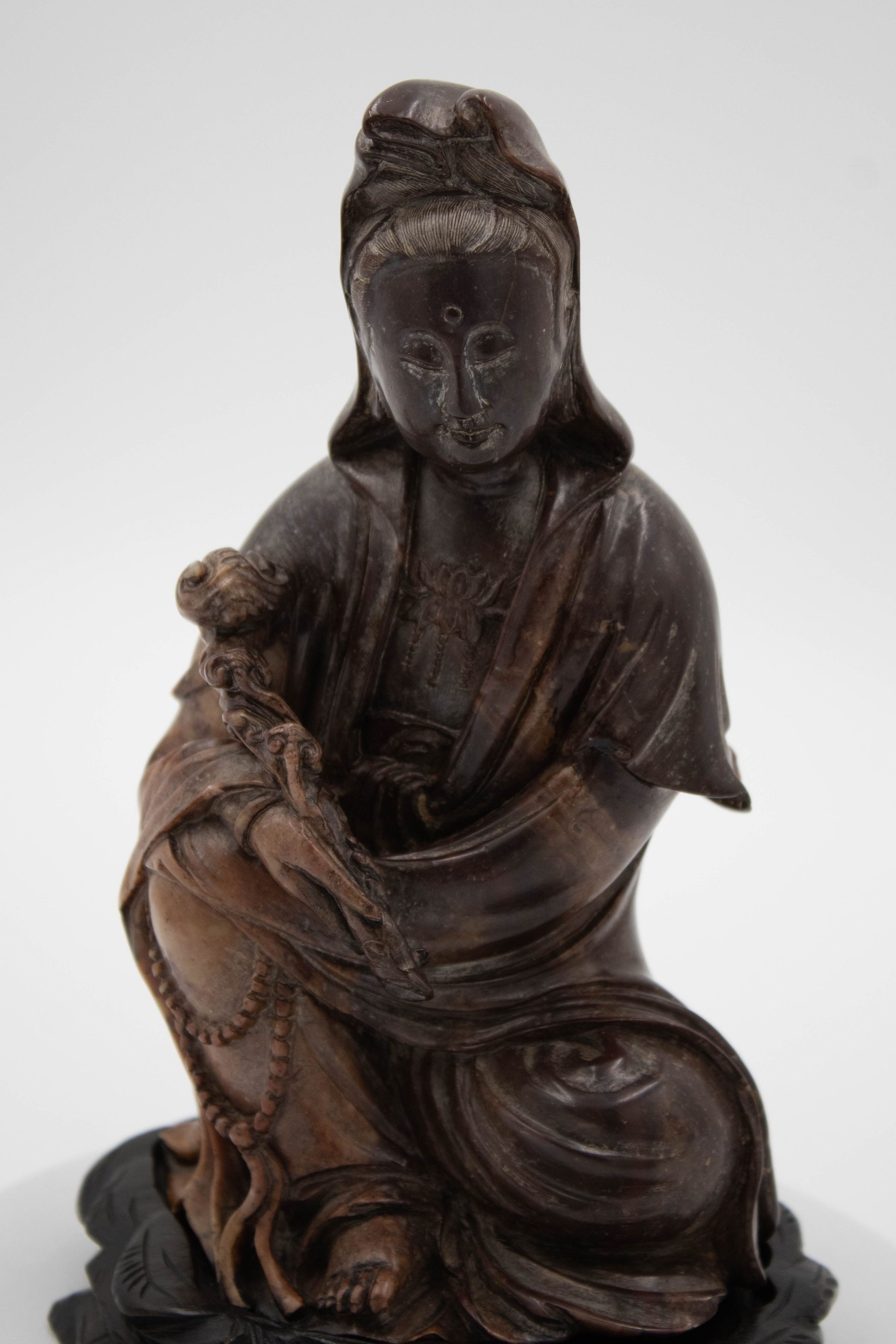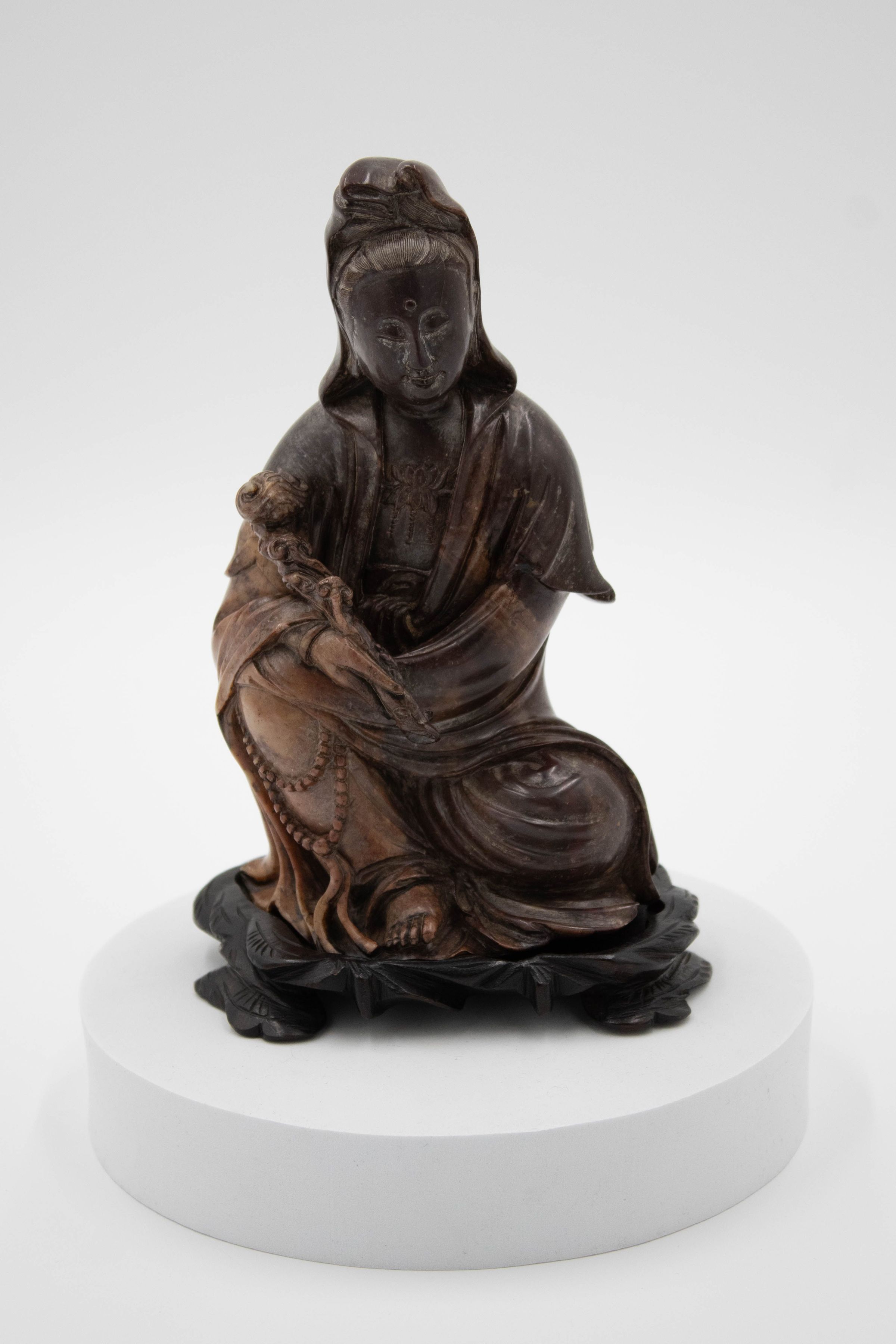 Carved wooden figurine of seated woman. The carved figure is of the Chinese goddess of mercy, Guanyin (also spelled Quan Ying and Kwan Yin in Burmese). Guanyin is the physical embodiment of compassion and is often depicted holding a lotus blossom flower and gilded with a long robe. The goddess began in Indian Hinduism as the bodhisattva Avalokitesvara as a male deity. She was gradually brought into Chinese culture over a millennium and was considered the most popular female deity in China from 1358-1911. This figurine depicts Guanyin in a version of what is known as the “royal-ease” pose. This pose is meant to display a feeling of grace, dignity, and confidence when looking at the figure, however the pose of this figurine is more relaxed than that of the traditional pose.Context