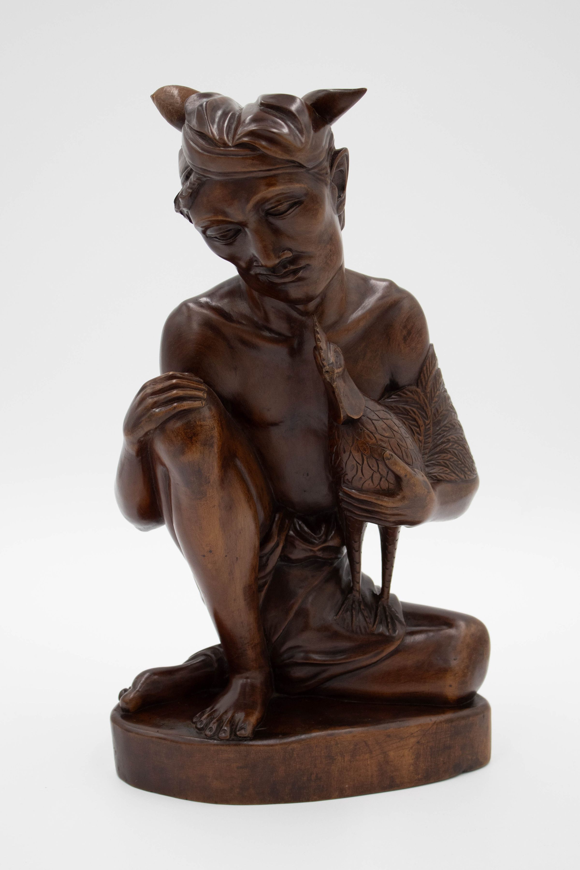 Carved wooden seated cockfighter with cock figurine. The carved wooden figurines depict a Balinese cockfighter preparing for a fight. The fights are traditionally part of the Bali Hindu religion, in which certain ceremonies required a blood sacrifice, and while the fights are forbidden for non-religious purposes, they still occur often in every Balinese village. The figurine appears to be part of a pair and was made in the Klungkung Regency of Indonesia. Klungkung Regency is the smallest regency in Bali, with regency referring to an administrative division under a province and on the same level as cities.Context