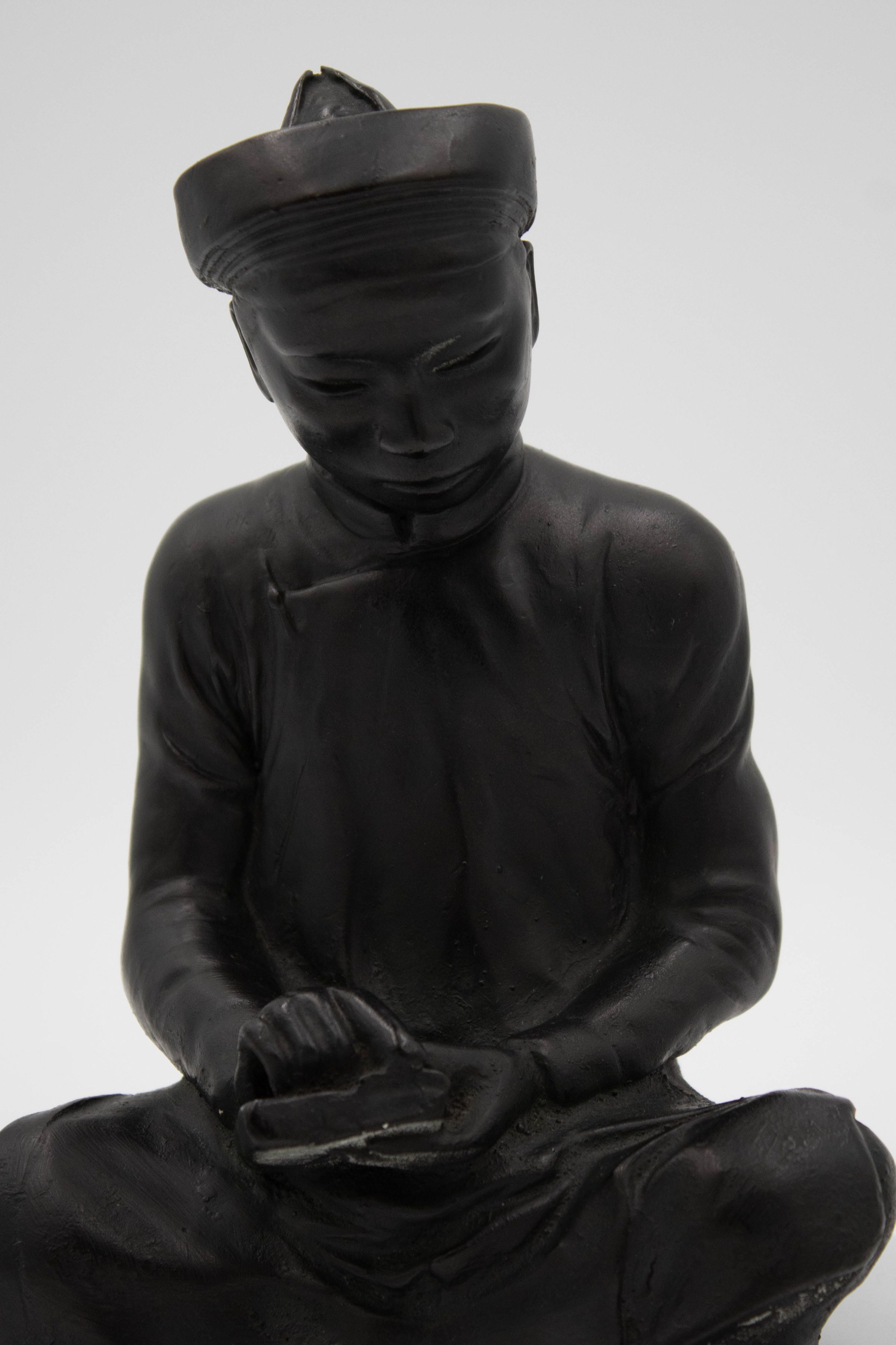 Cast statue of a man reading a book while seated. The statue is made of a mixture of cement and a slurry. The statue is similar to a pair of bookends produced by Austin Productions in 1961. The pair of statues are called “The Scholars,” and include a scribe and mathematician. This one would be the scribe.Context