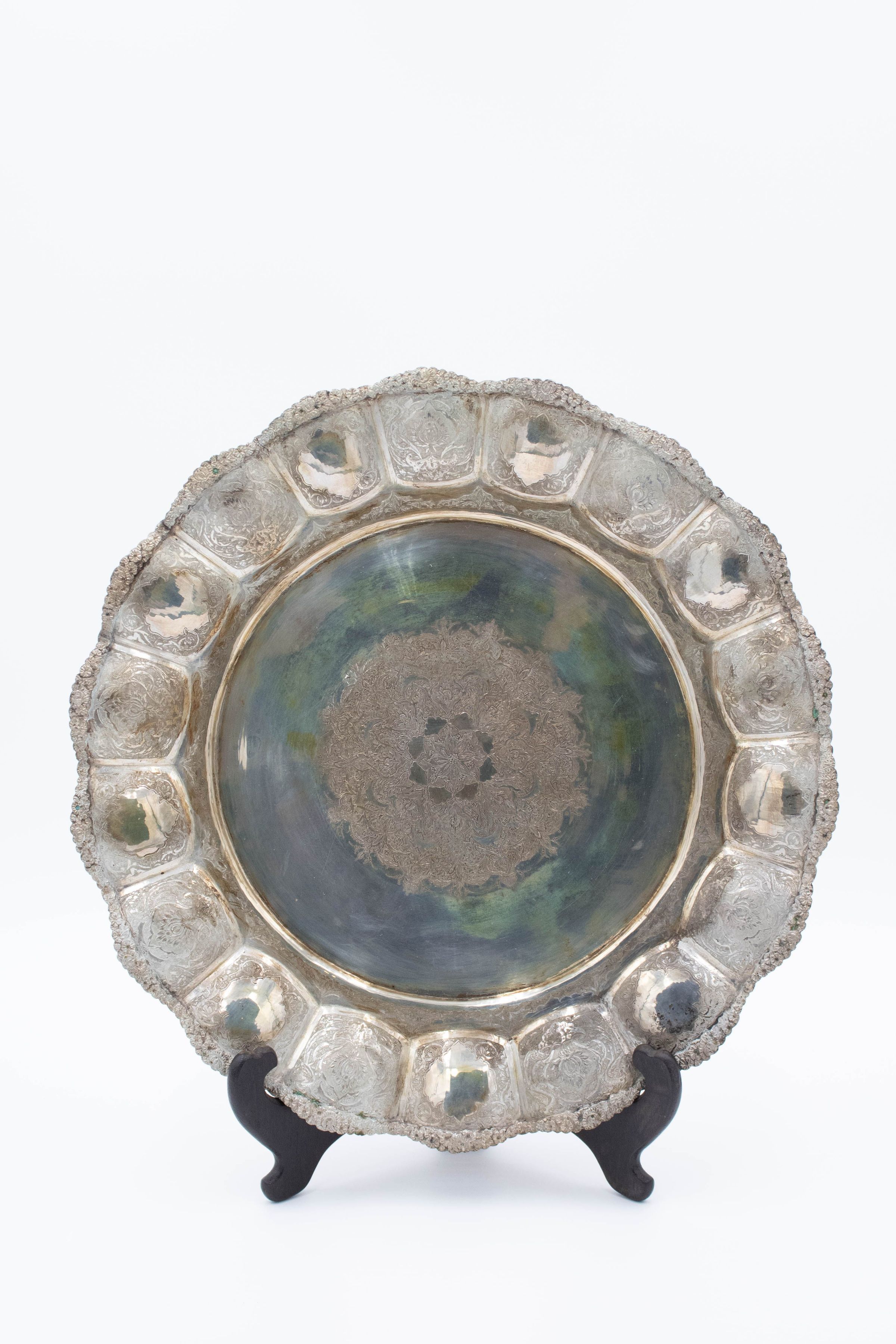 Large Silver Plate with Etched Mandala Design on Stand
