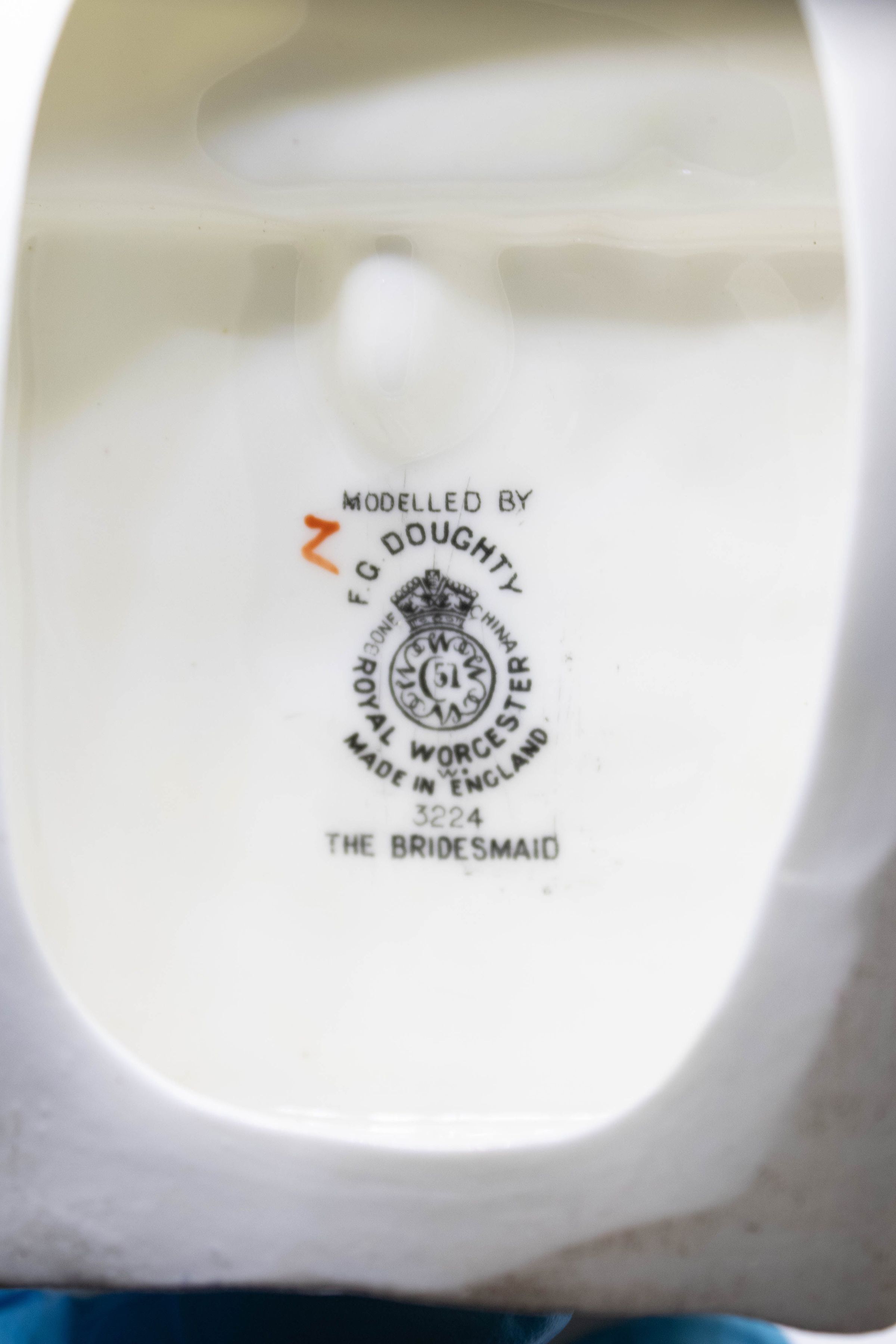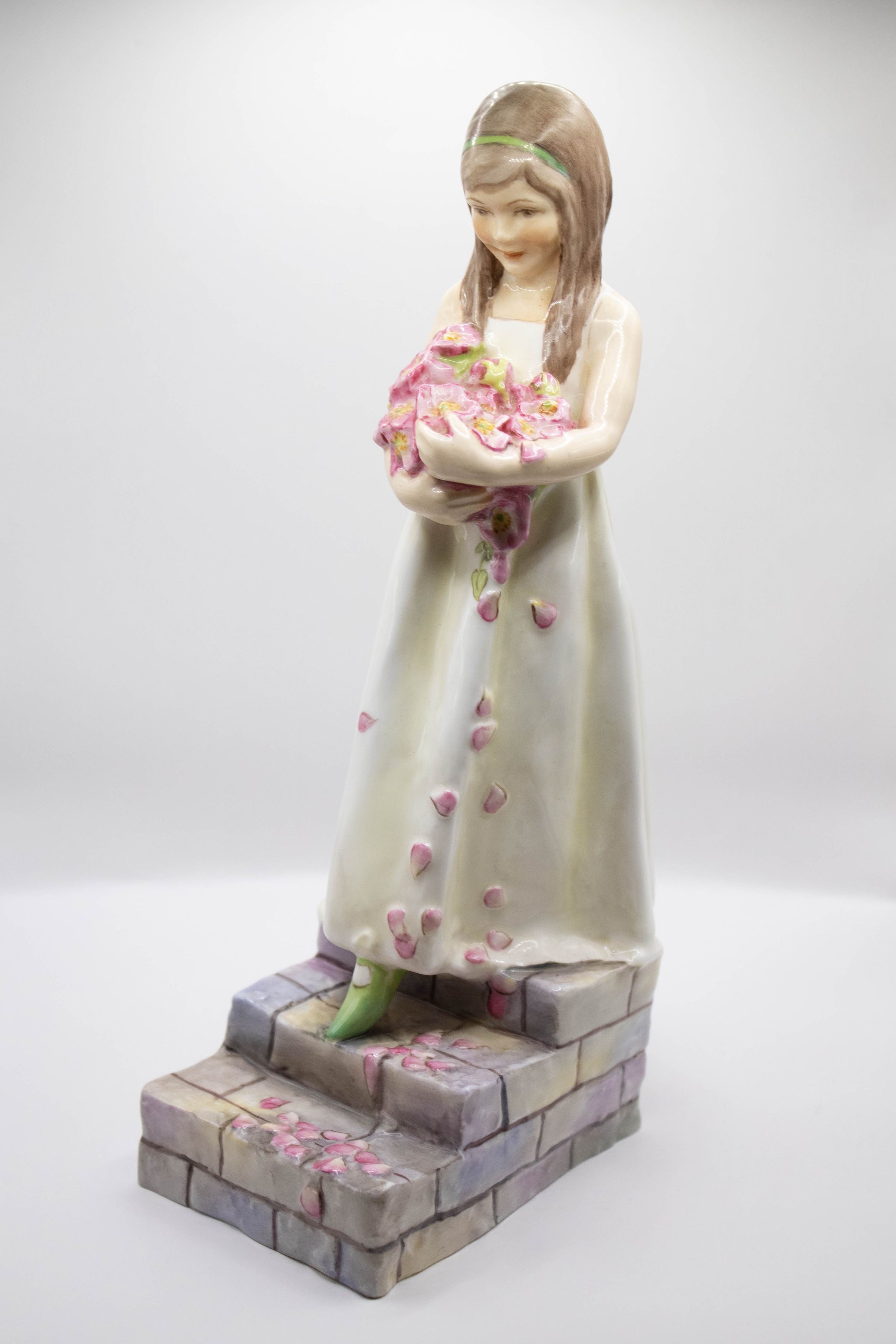 Ceramic figurine of girl holding flowers, titled "The Bridesmaid"Context