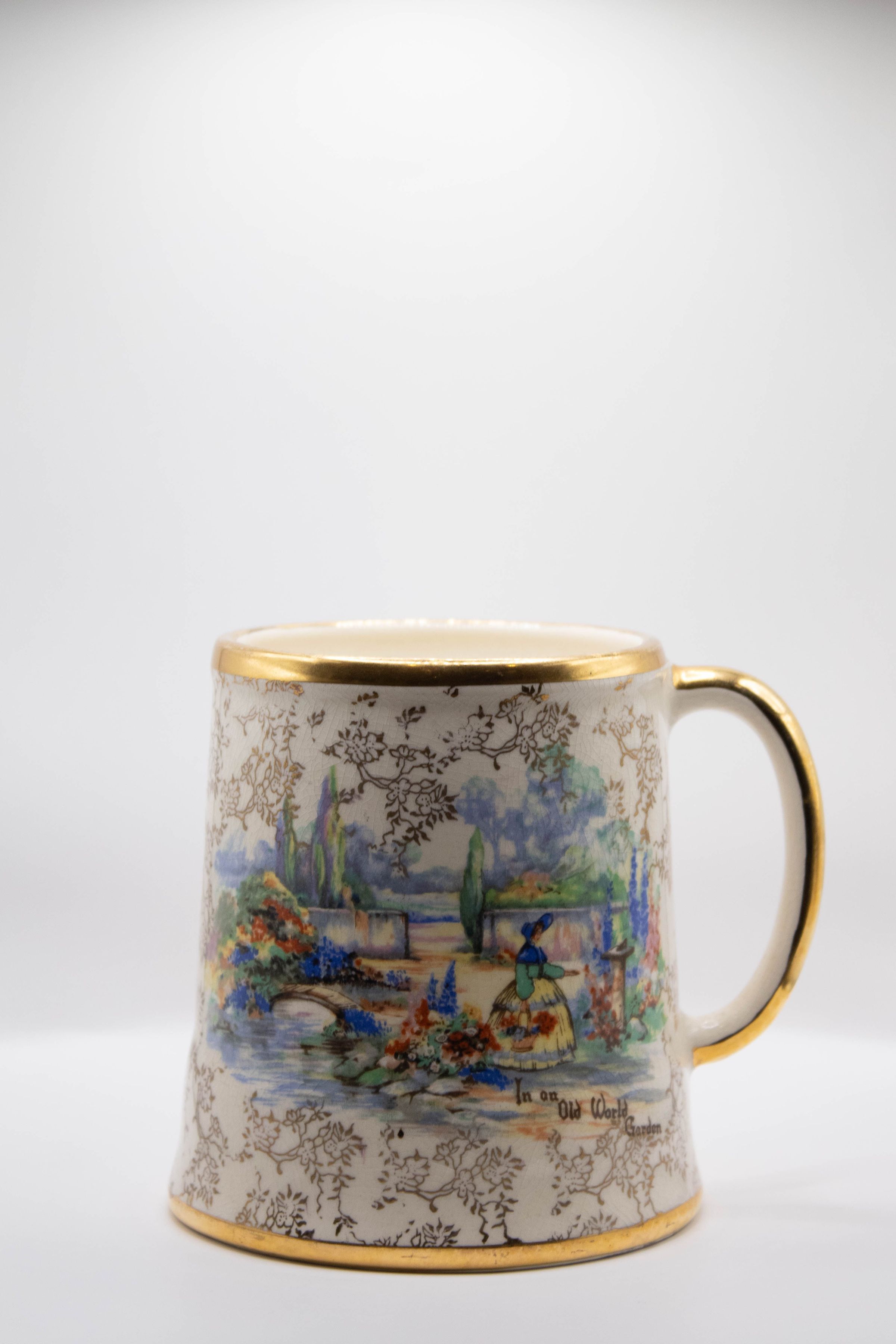 Ceramic mug with gold detail and inscription that reads "in an old world garden."Ethnography