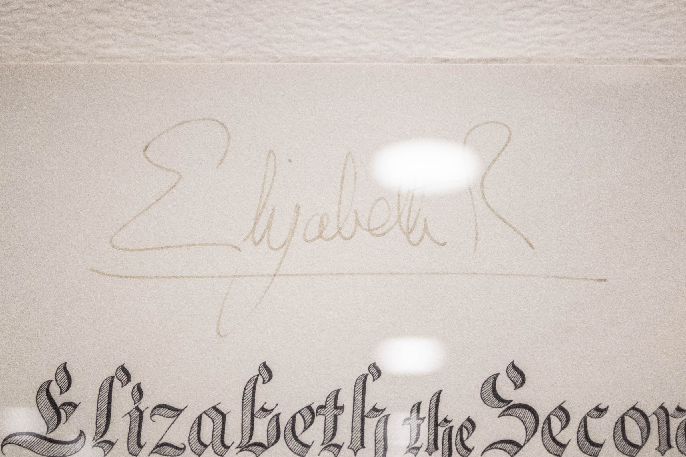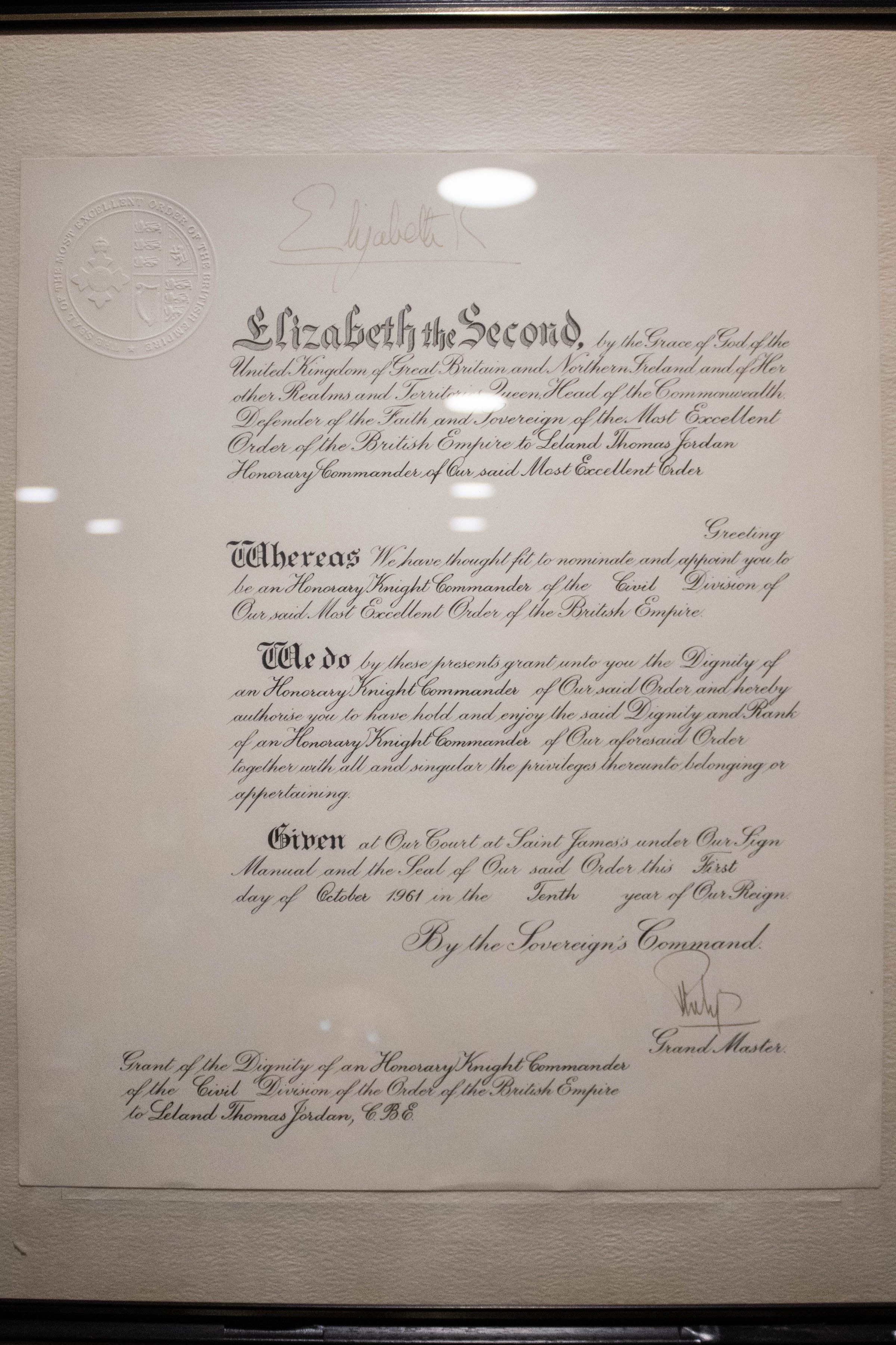 Framed certificate from Queen Elizabeth II bestowing Honorary Knight Commander of the Order of the British Empire on L.T. Jordan in 1977.Ethnography