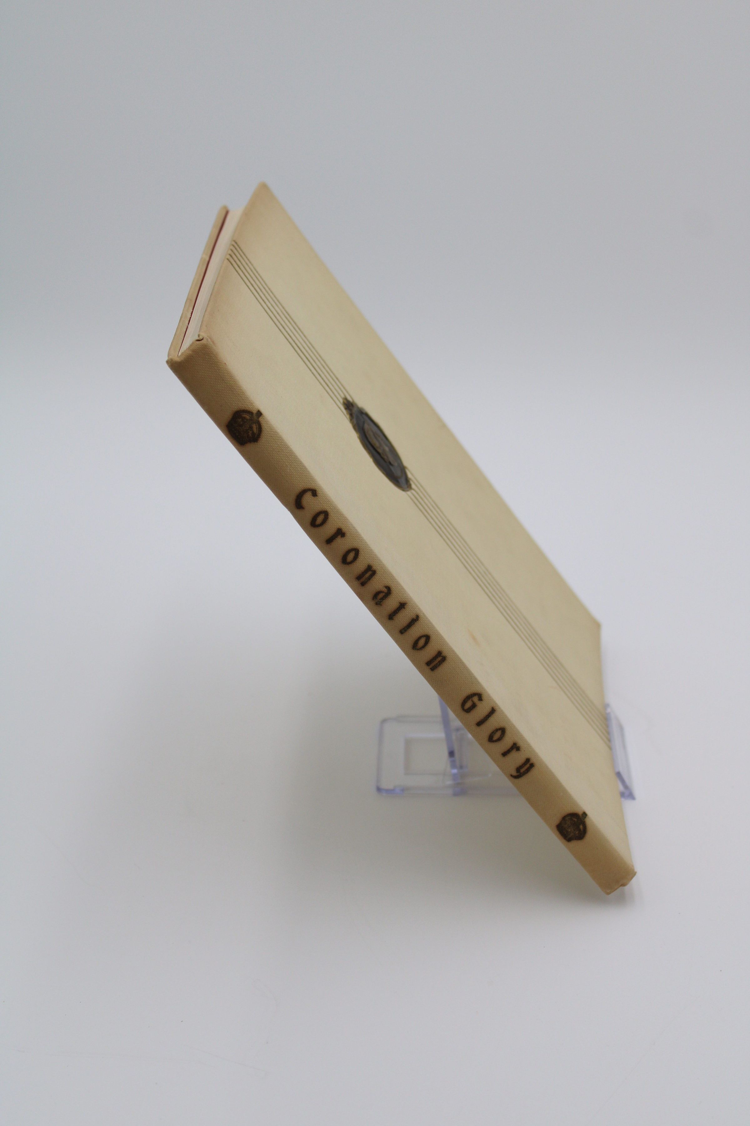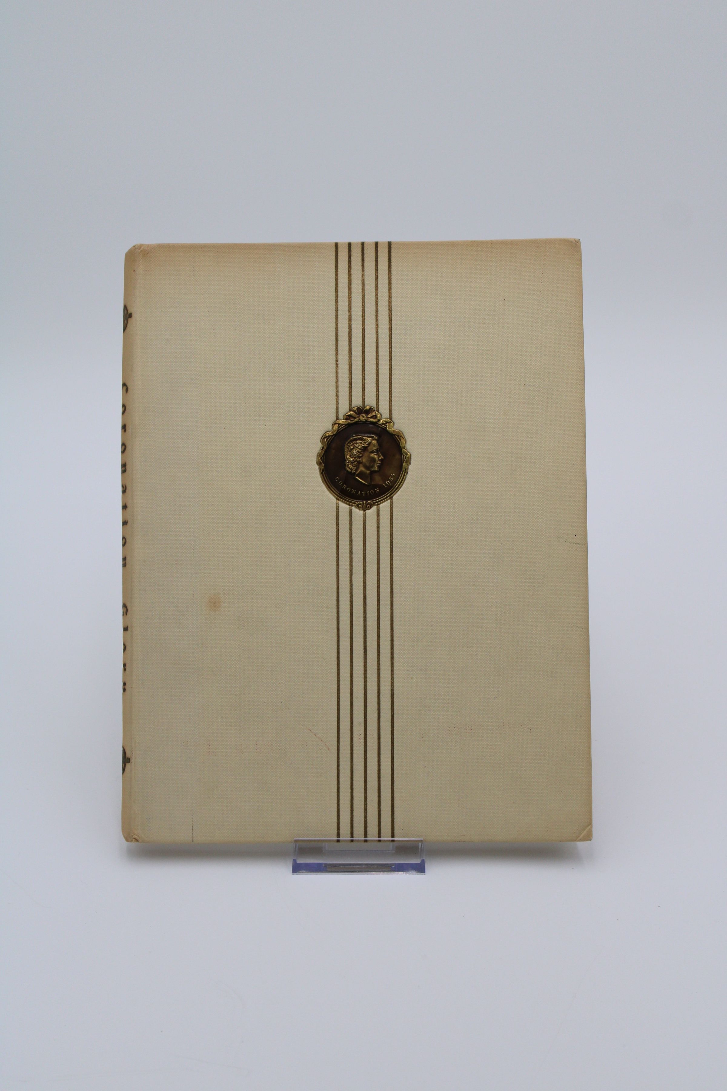 Cover of "Coronation Glory: A Pageant of Queens 1559-1953." It is off-white with 5 thin, vertical gold lines down the center and a seal of Queen Elizabeth II, and the words "Coronation 1953."