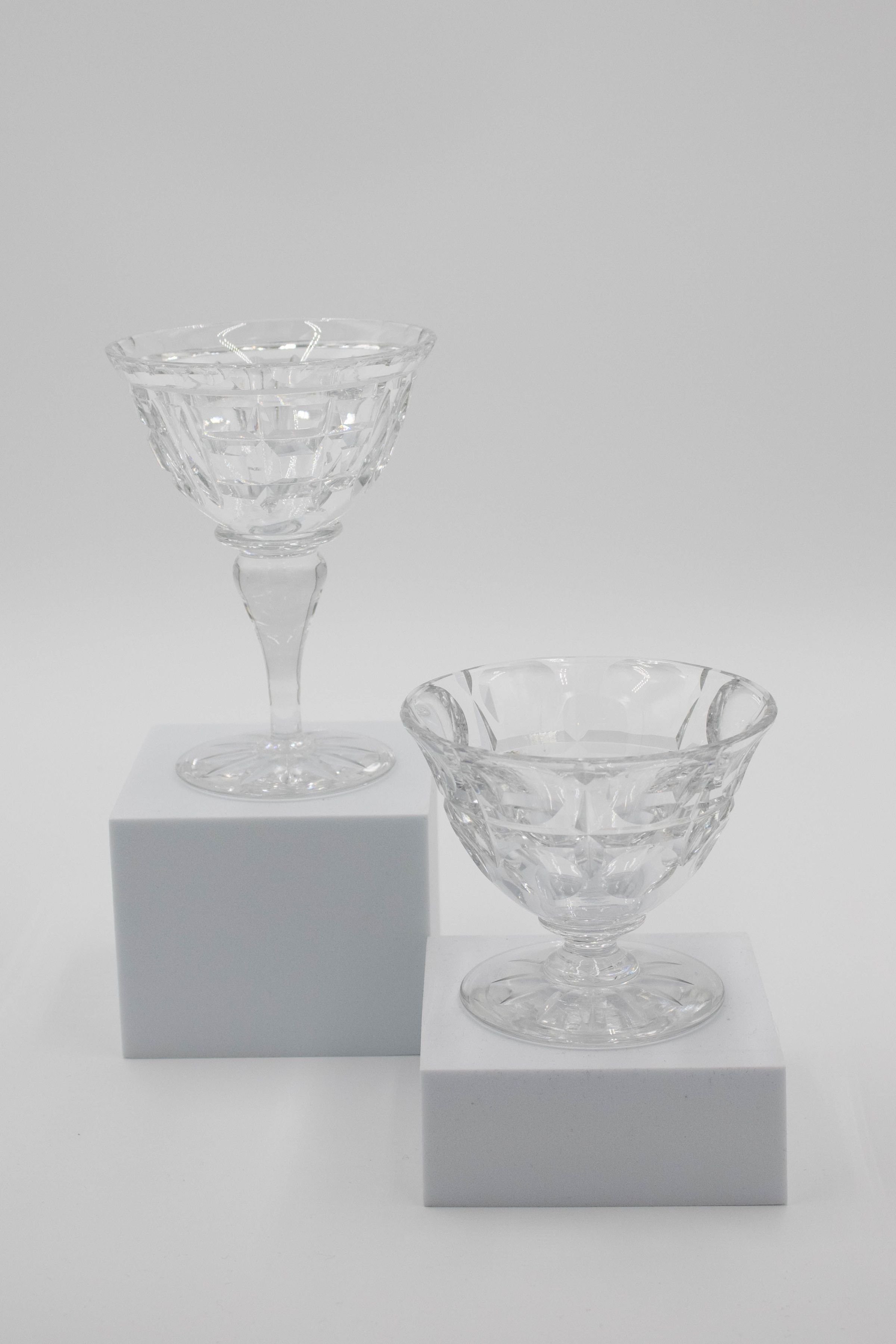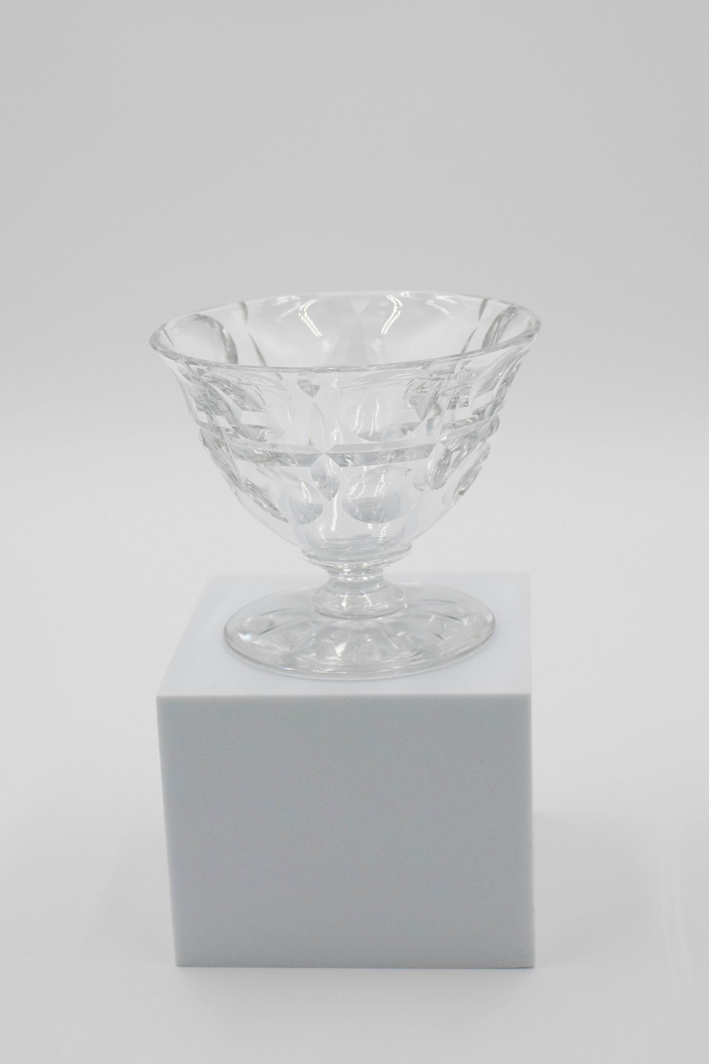 The image shows a finely designed crystal fruit cup featuring geometric detailing. It has essentially no stem with a flared base.
