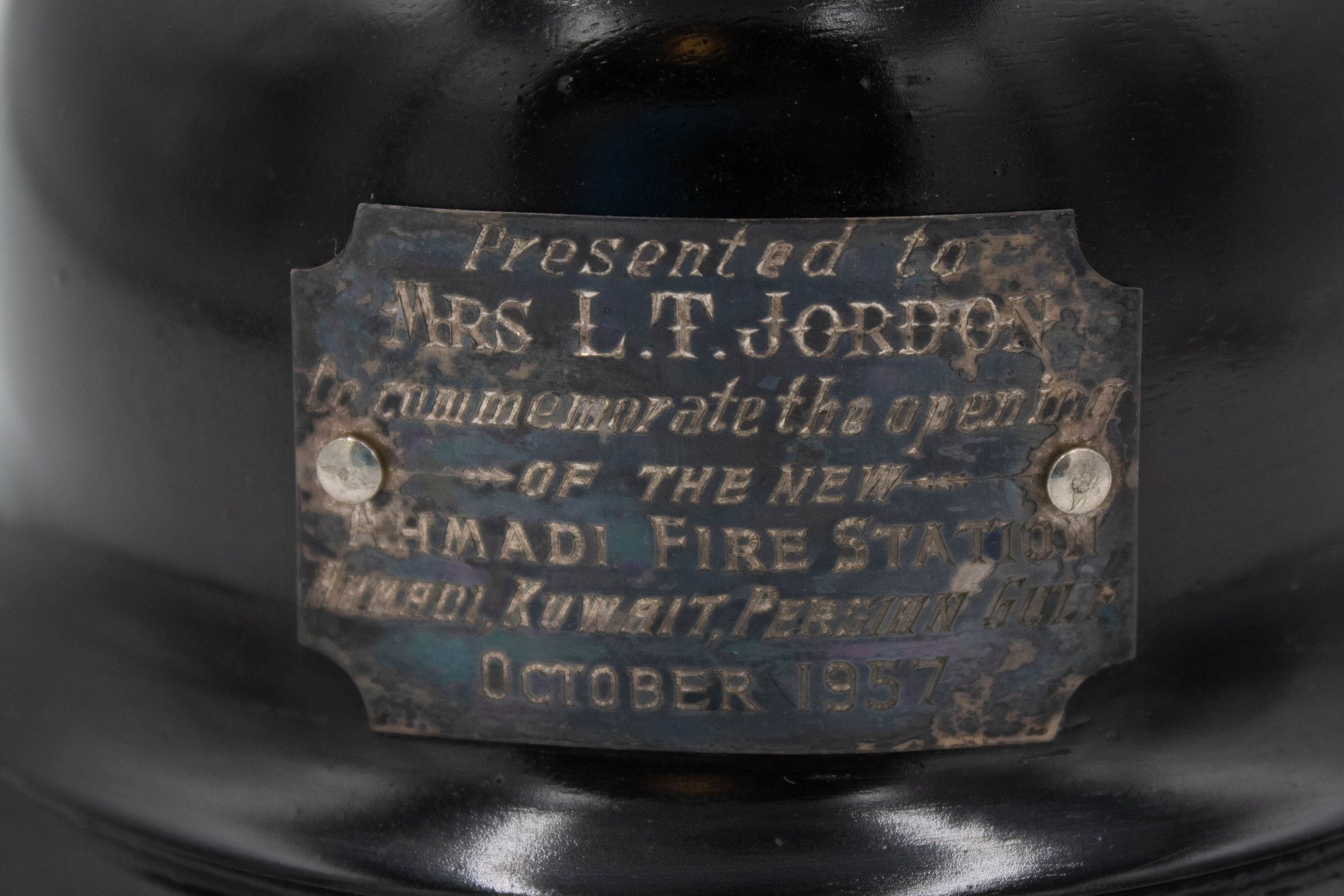 A small gold fireman statue sits on top of a bell-shaped black pedestal with a plaque. The fireman is holding a hose and looking up. The plaque states "Presented to MRS L.T. JORDAN to commemorate the opening OF THE NEW AHMADI FIRE STATION Ahmadi, Kuwait, Persian Gulf OCTOBER 1957." It weighs 427 grams and is 5.5 inches tall.