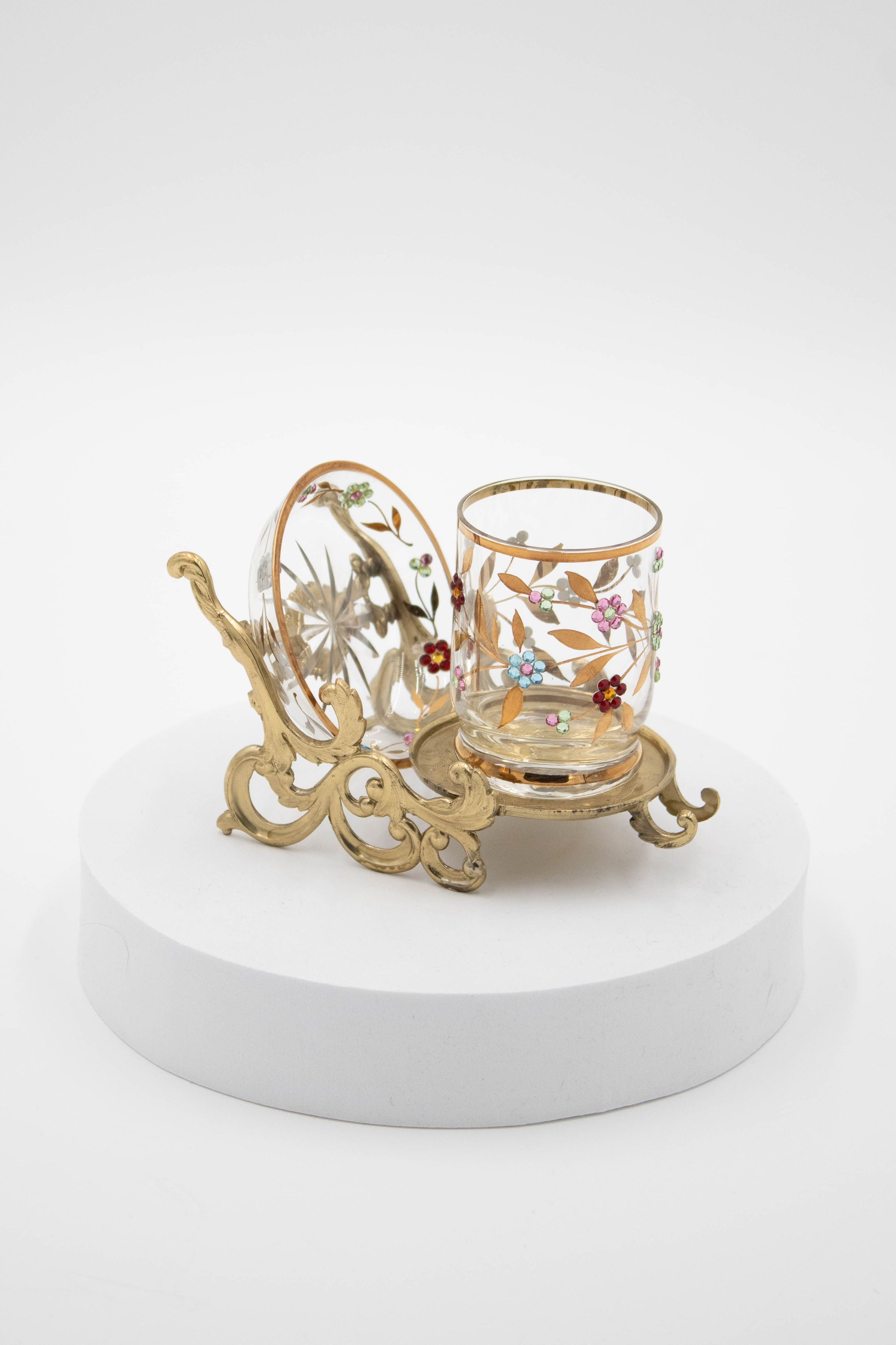 Glass Cup and Dish Set on Golden Sleigh Decorated with Colored Stones and Gold LeavesEntry/Object ID