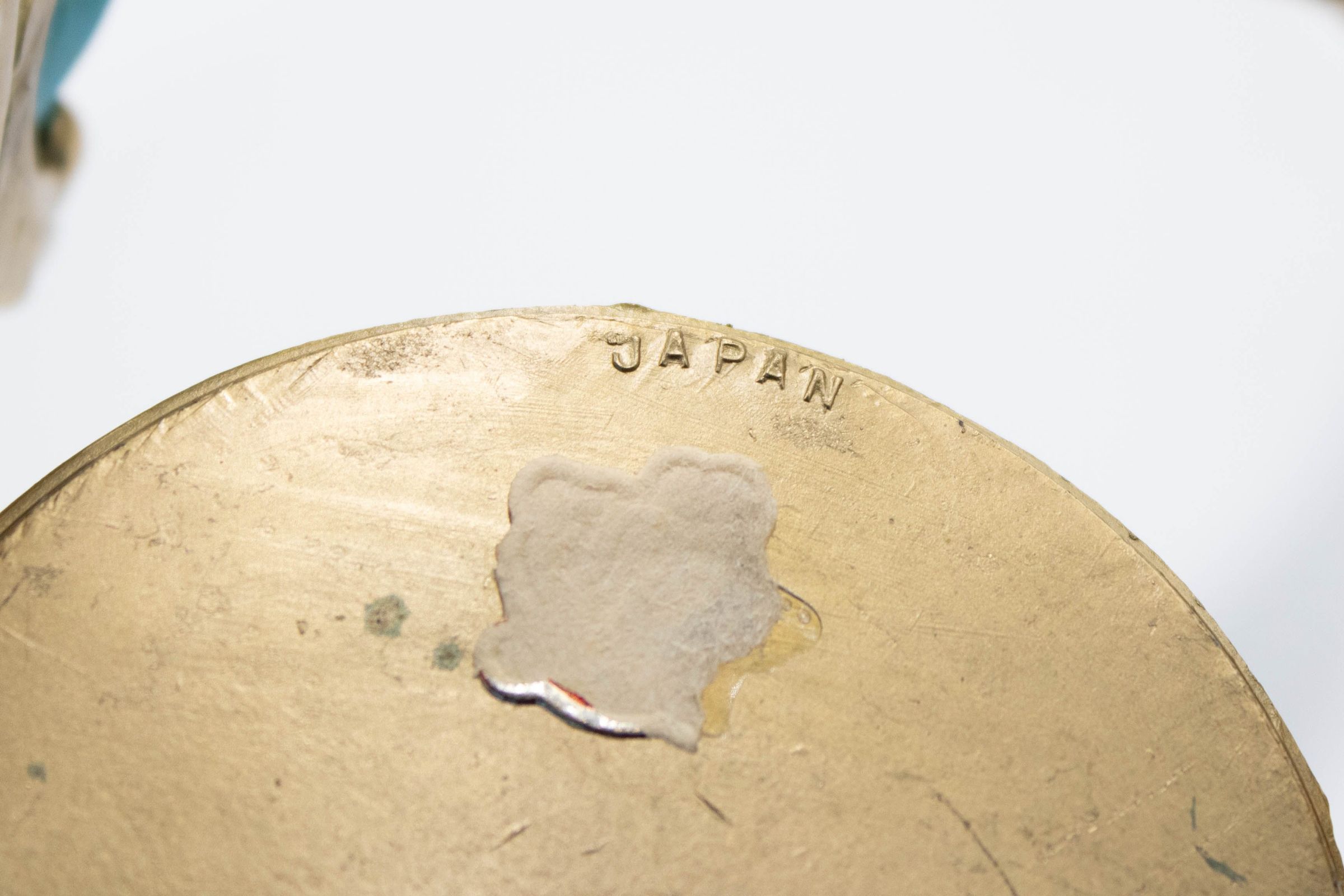 The small glass cup and dish set is embellished with small rhinestones and rests on a golden-colored sleigh. It was made in Japan.Context