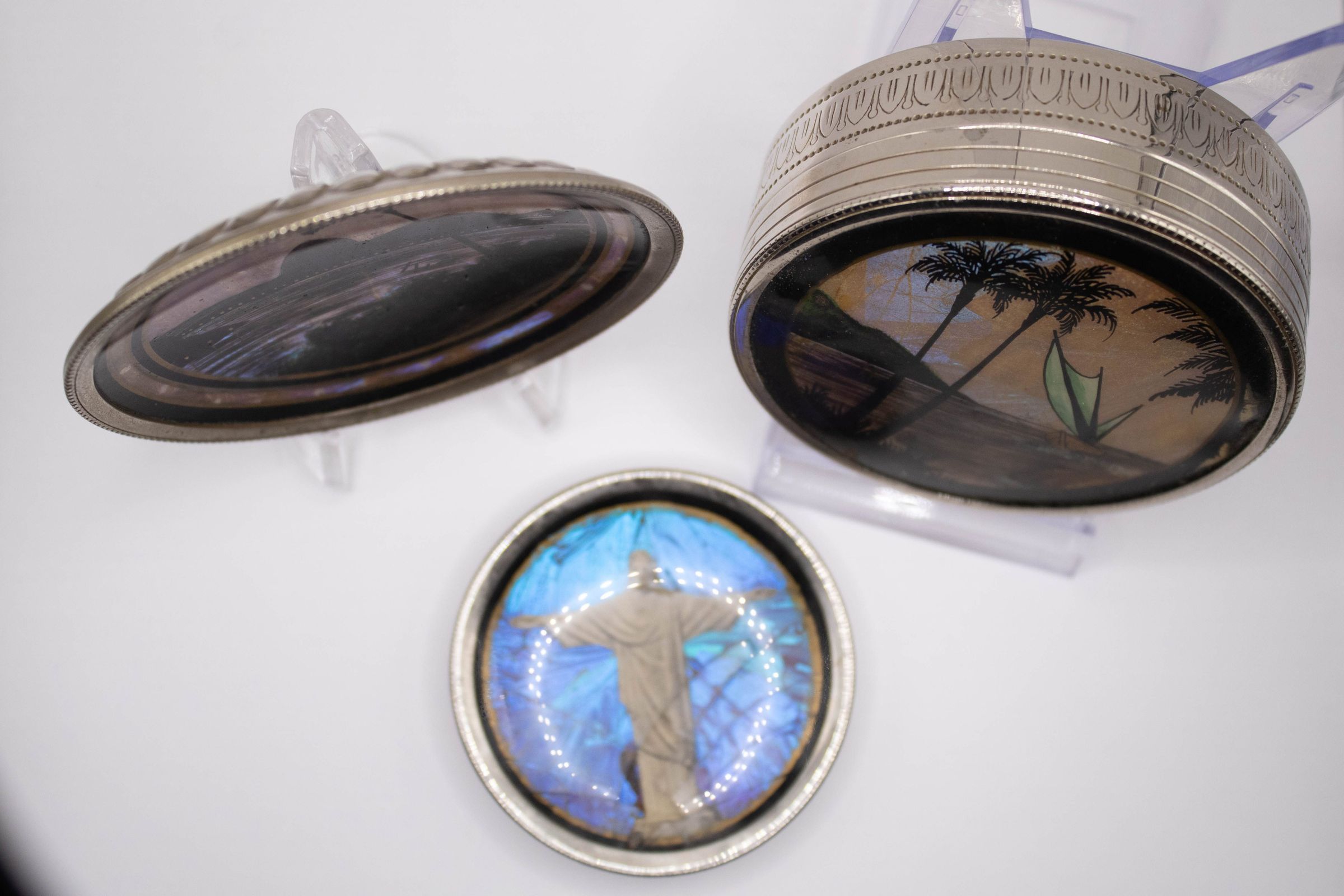 Image of all three coasters. The left coaster is on a plastic stand and depicts an oasis scene, with a palm tree and bushes in the foreground and a body of water, bridge, and mountains in the background. The right coaster is on a plastic stand and it depicts another oasis scene, this time with a ship in its background rather than a bridge.
