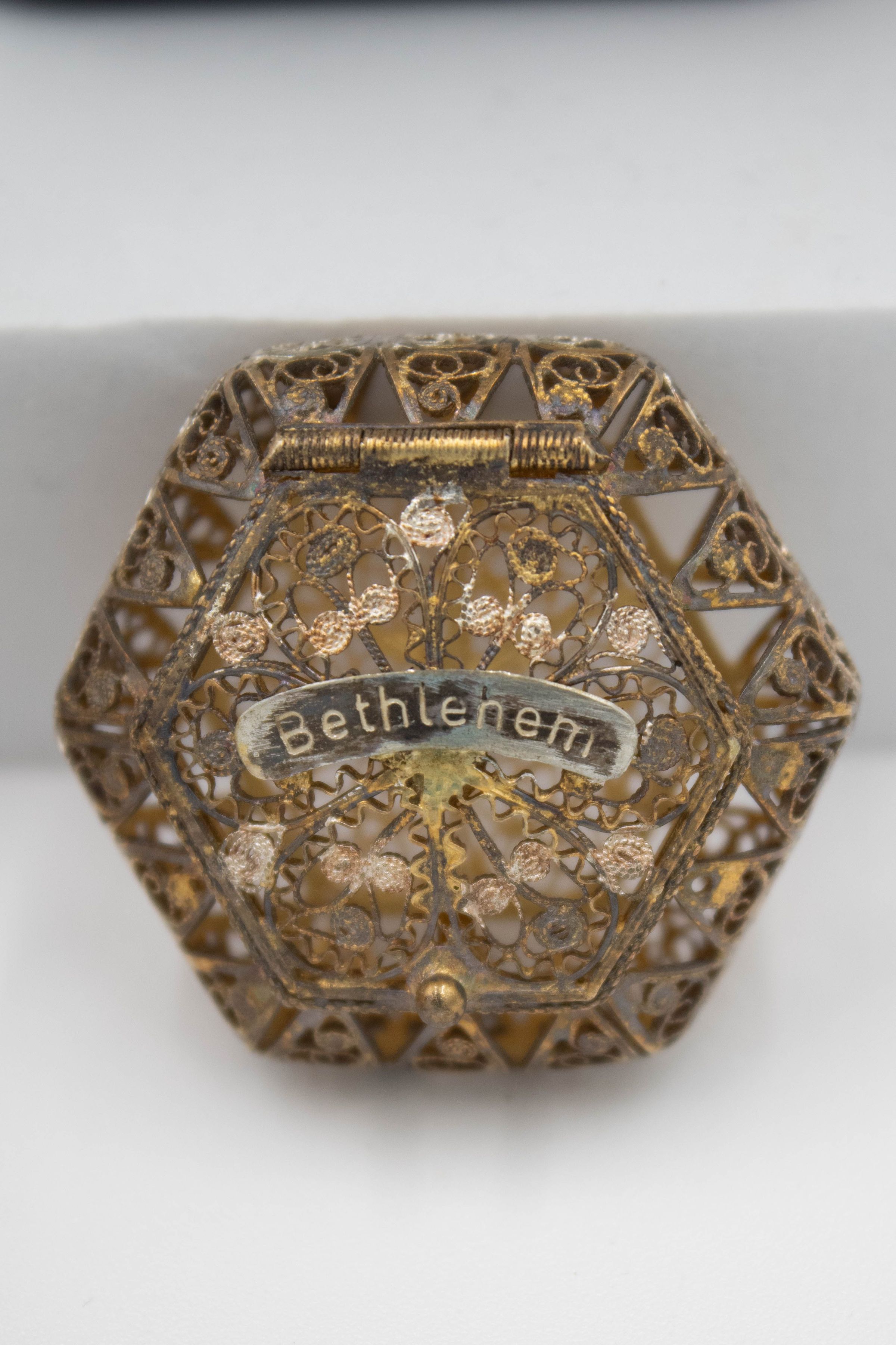 Gold rosary and wooden box with heat stamp of "Bethlehem;" gold decorative top.Context