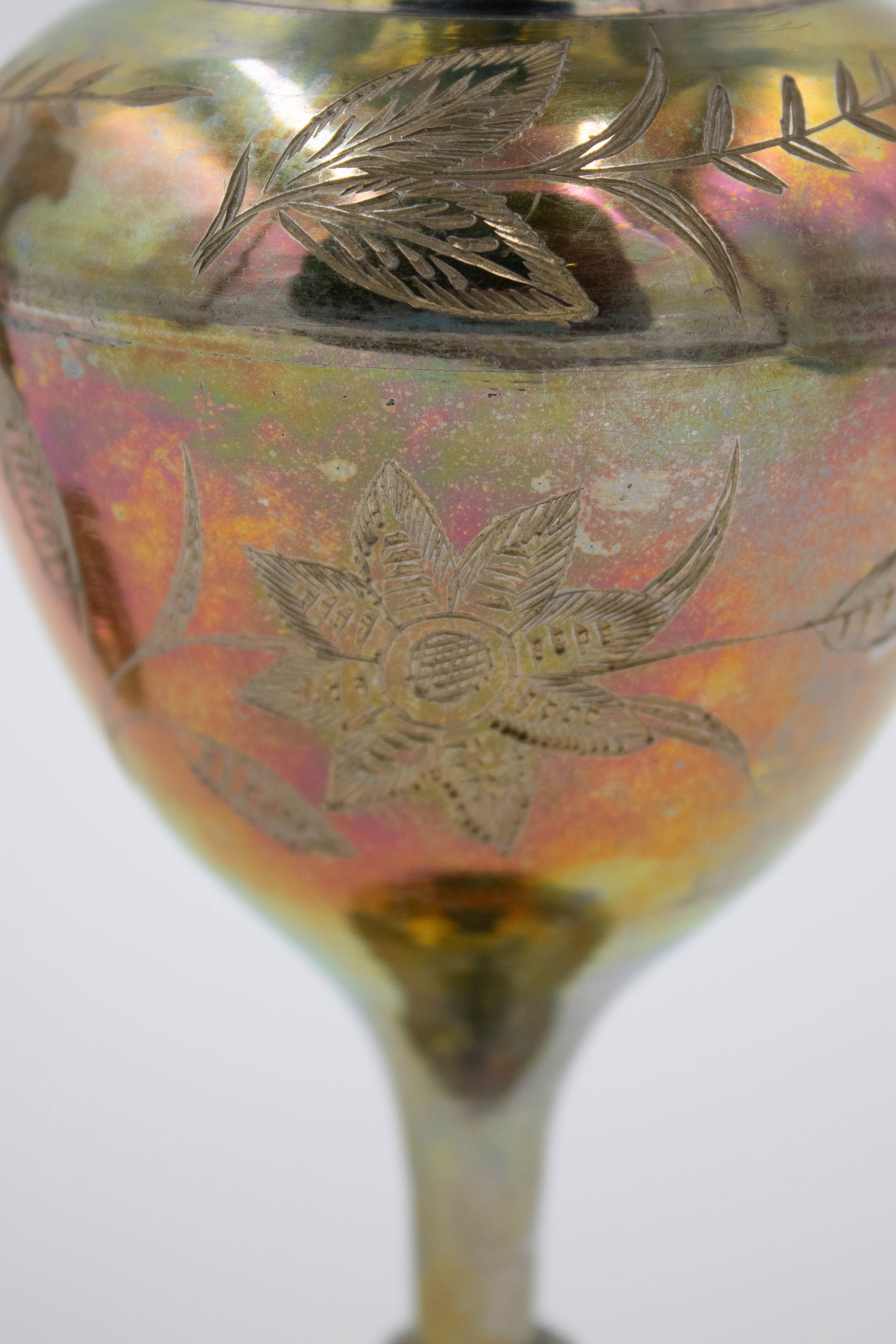 Pair of Scalloped Brass Vases on Pedestals and Engraved with Floral Design