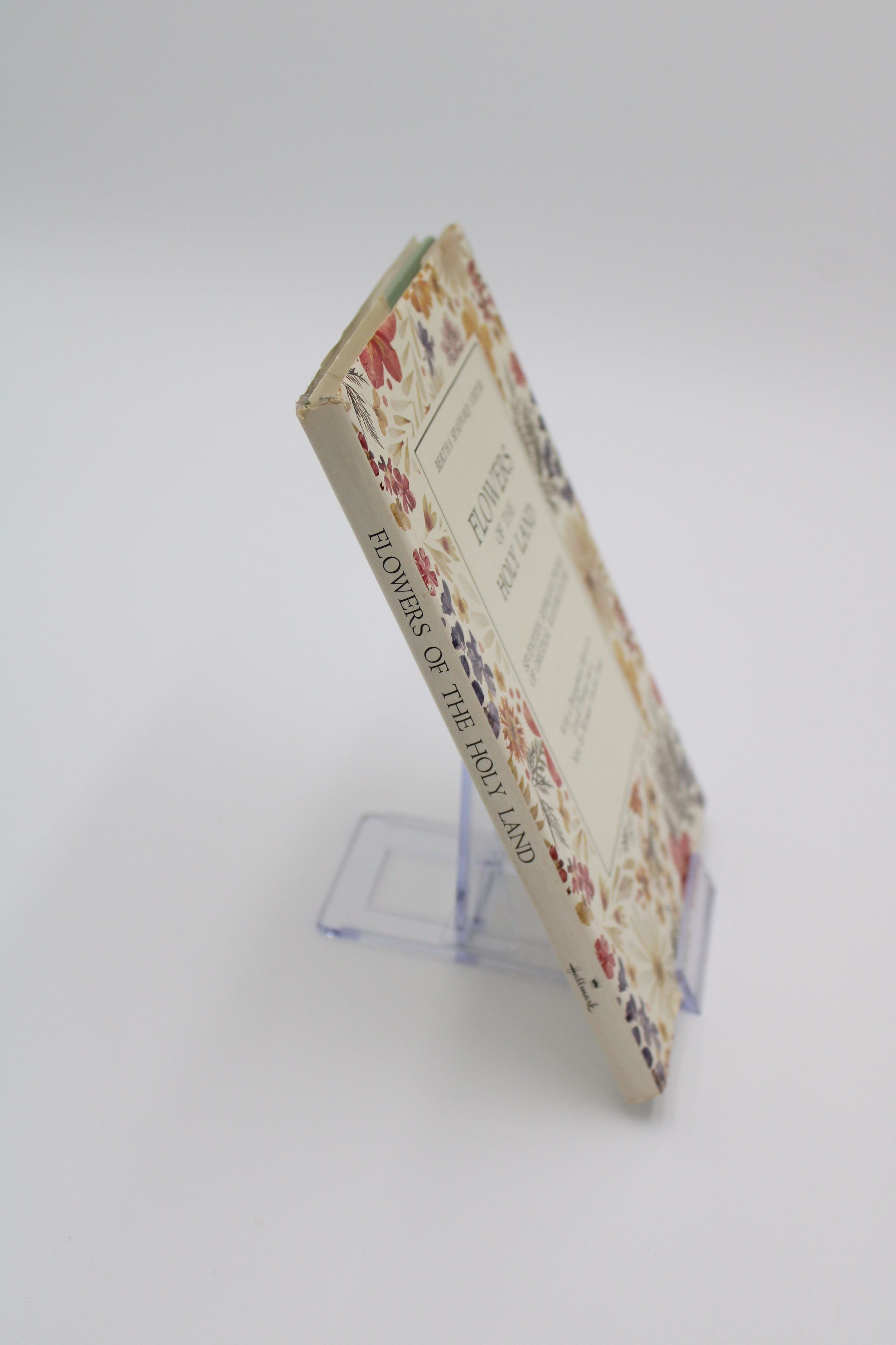 The front cover of “Flowers of the Holy Land” has a background of depictions of various flowers on a white background. In the middle is a white box with the title and subtitle, as well as the author's name.