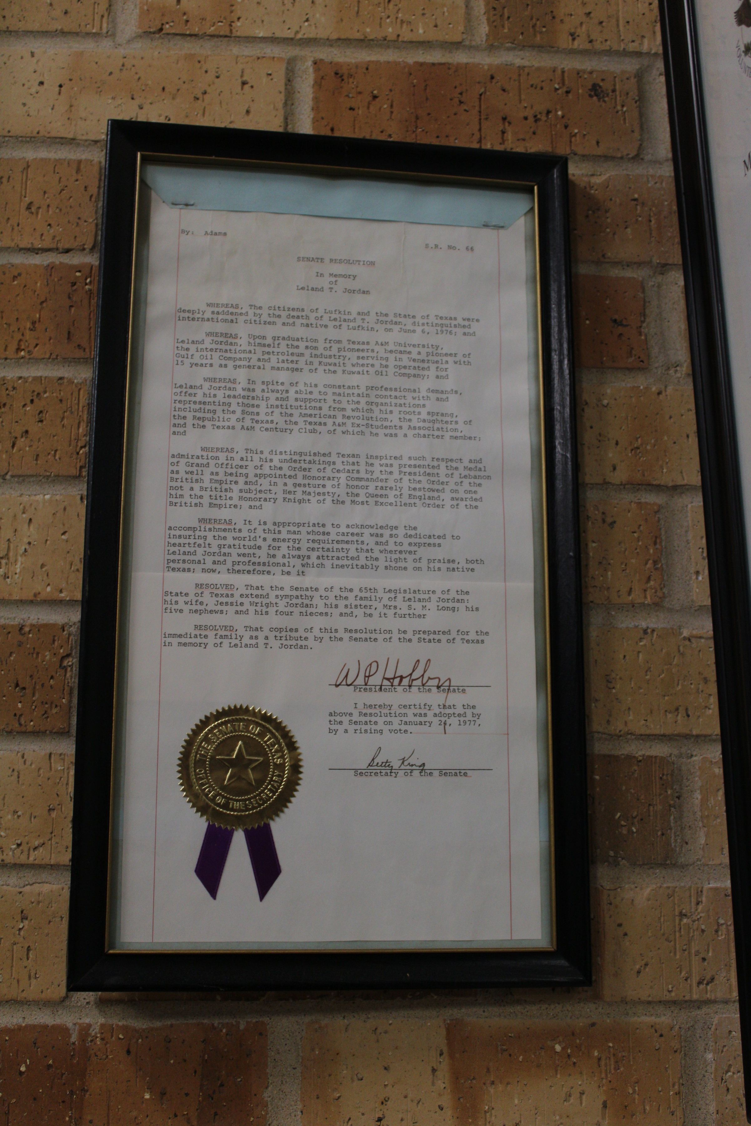 Image of the framed Senate Resolution #66. The resolution posthumously honors Leland T. Jordan for his life's work. There is a gold state seal and signature from the president of the Senate, William P. Hobby.