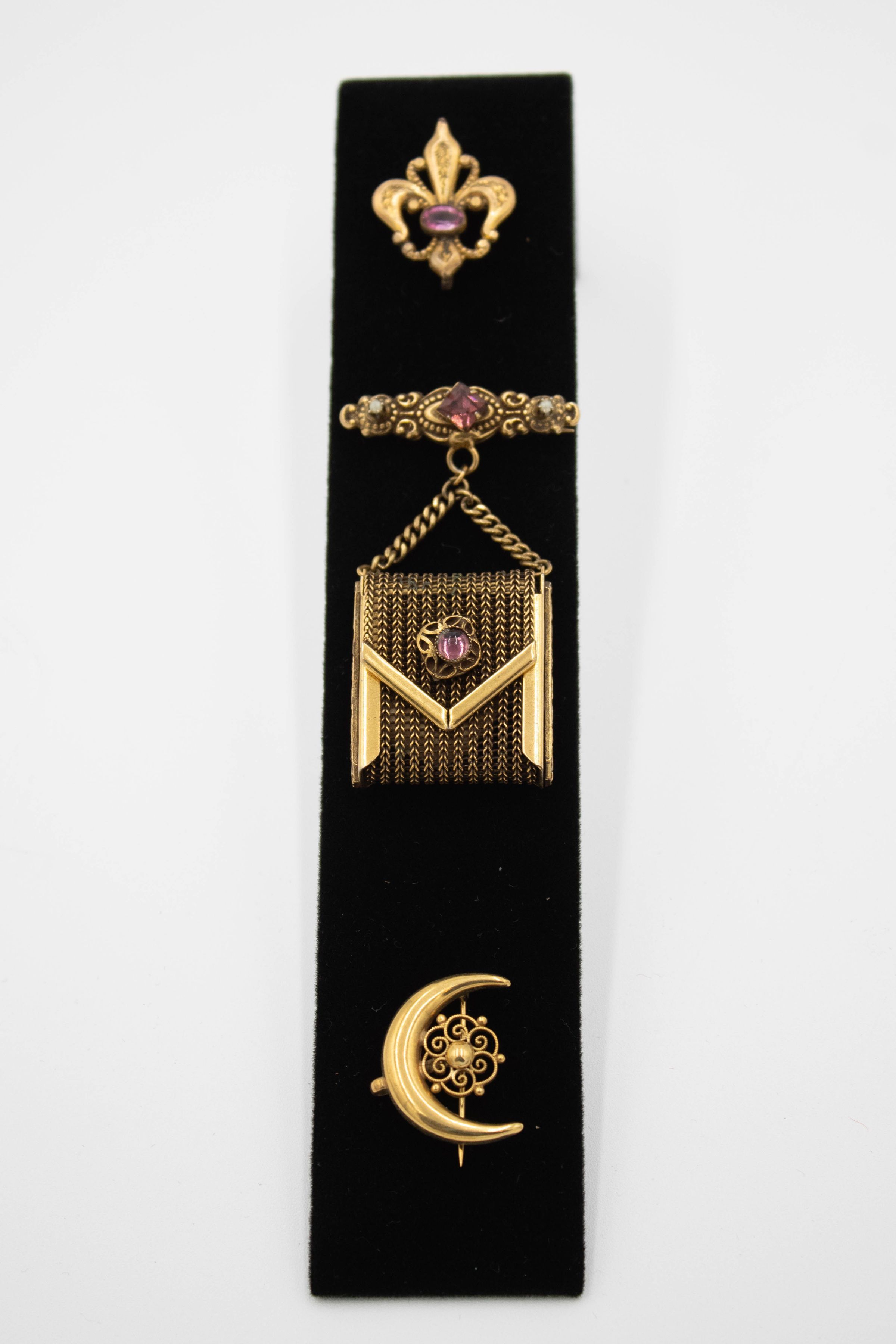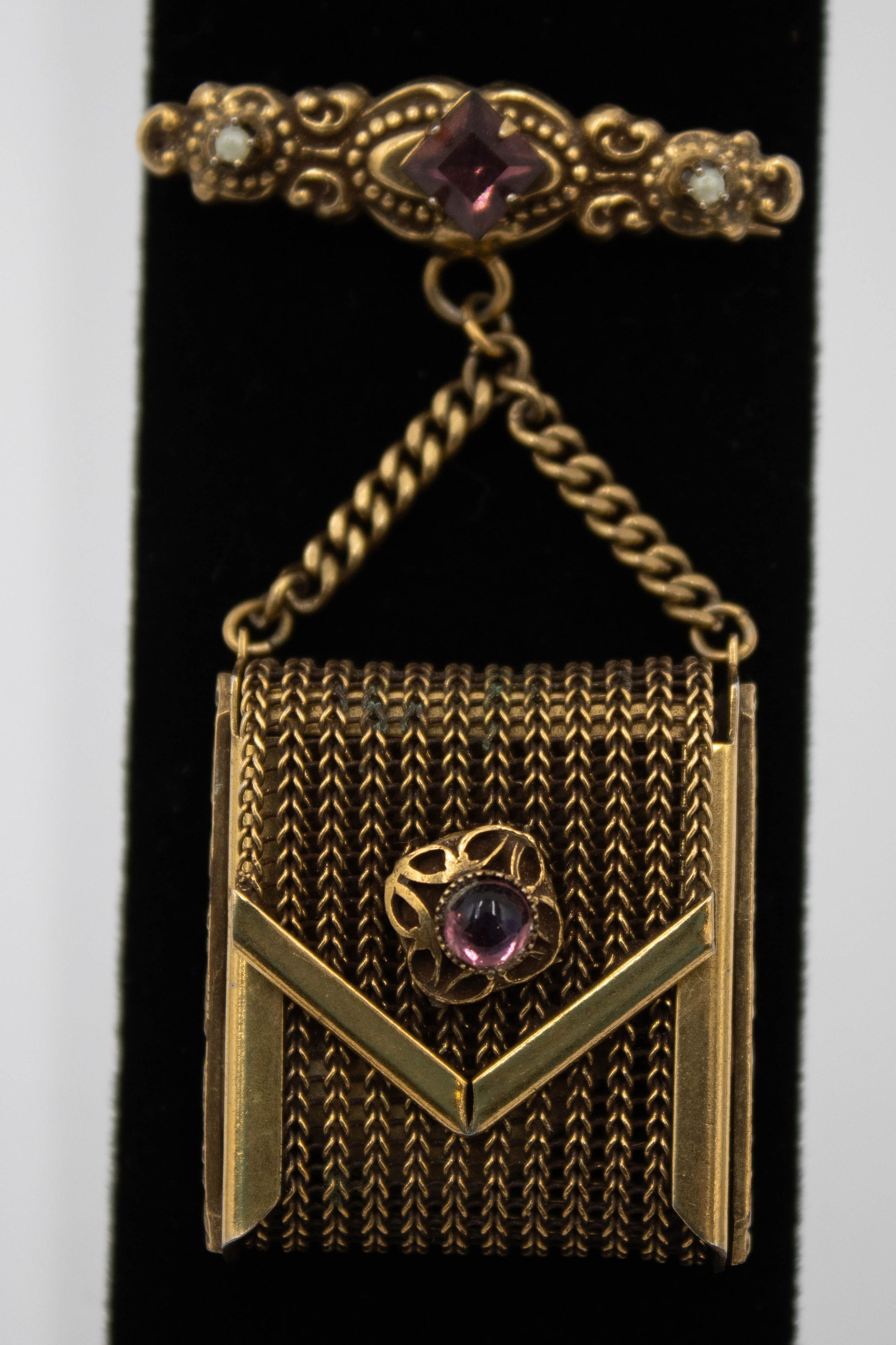 Image of the gold pin set with a garnet-colored stone and two small pearls on either side. Hanging from the bar is a small gold-chain purse with a working clasp; the purse opens and closes but doesn’t hold anything. There is a small gold flower in the center of the purse with an purple amethyst center.