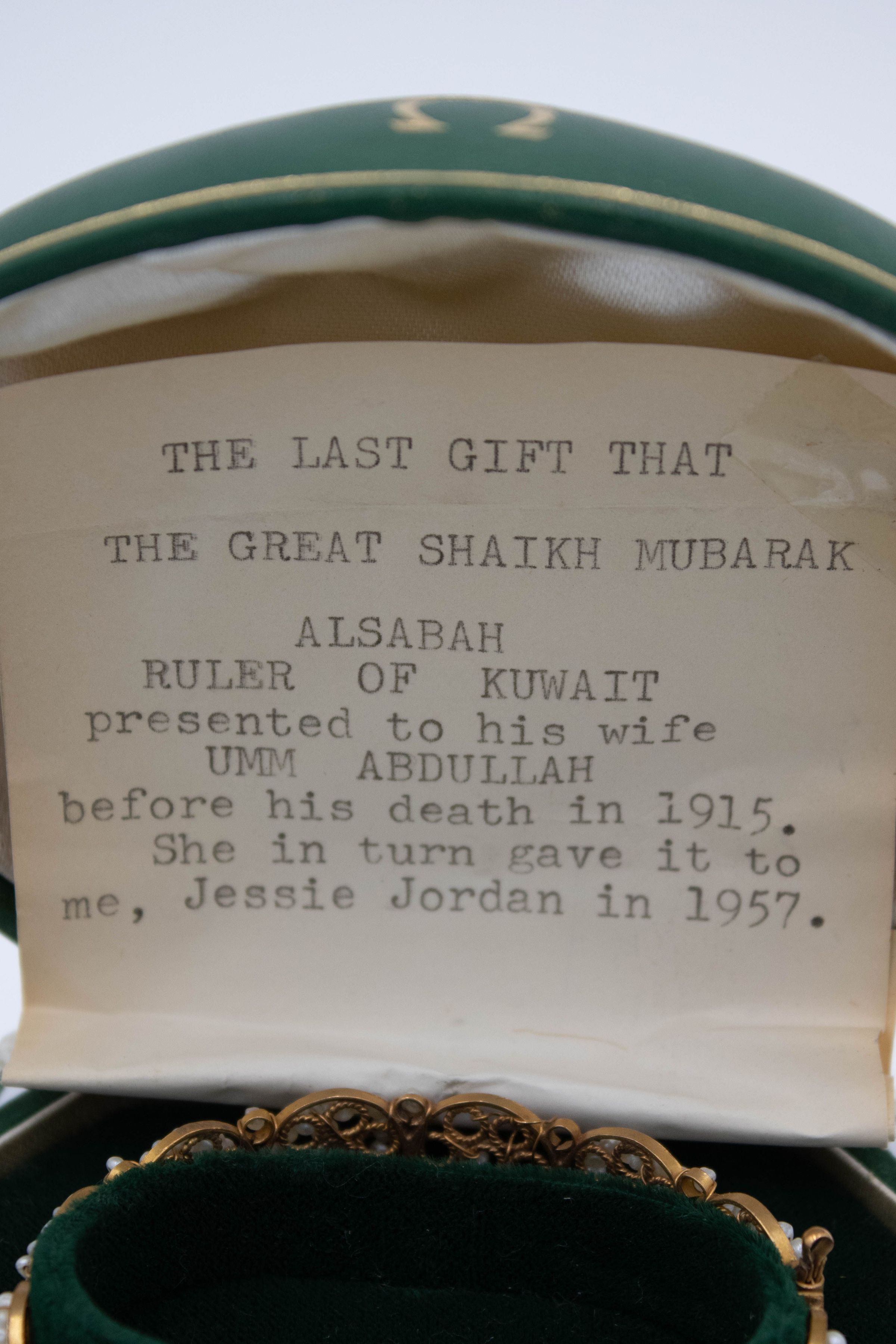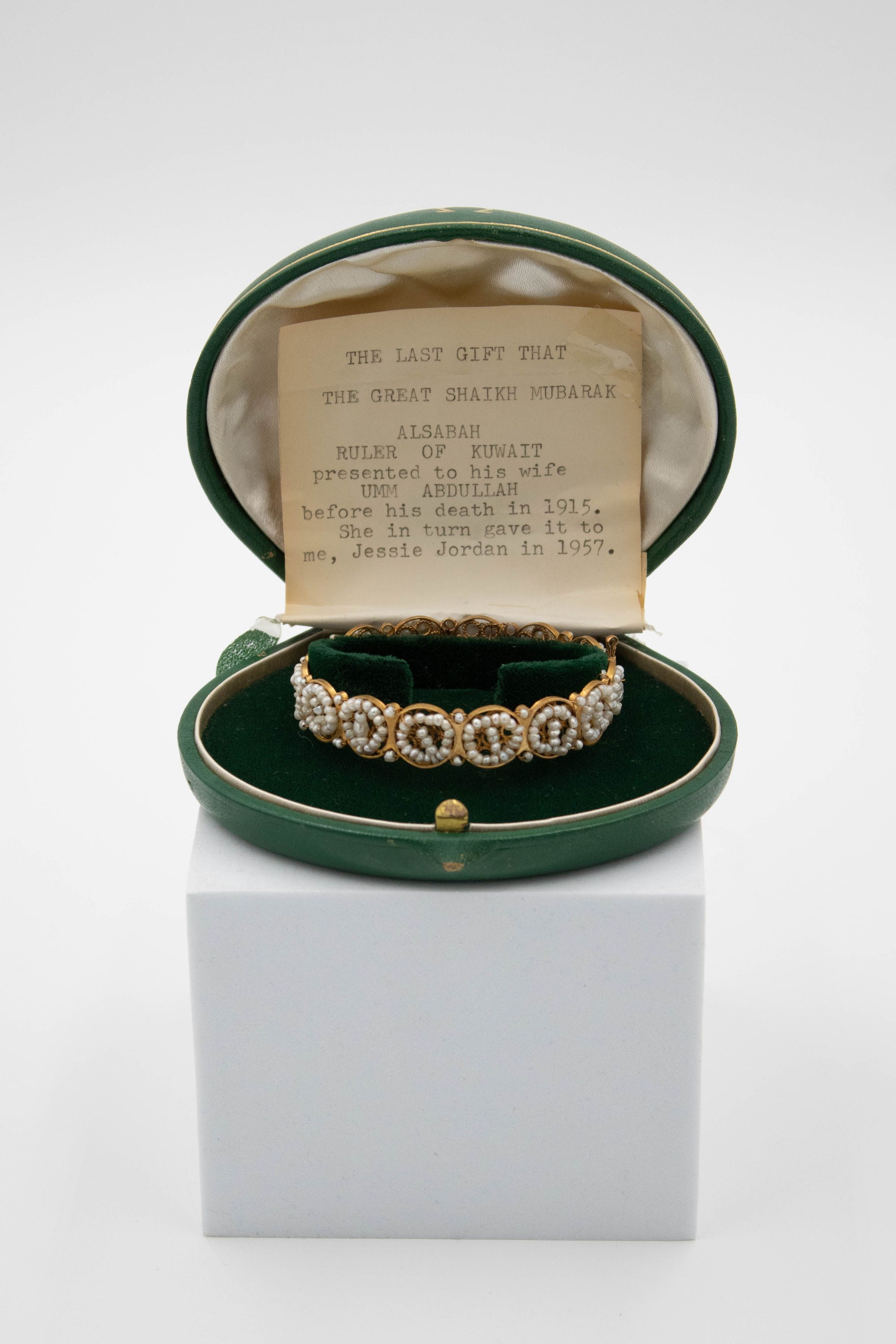 The bracelet was given to Mrs. Jessie Jordan by Umm Abdullah Mubarak, wife of Sheikh Mubarak Al-Sabah. The sheikh had presented it to his wife before his death in 1915, she later gave it to Mrs. Jordan to care for when she went to Mecca in 1957. She later passed away and her son insisted that Mrs. Jordan keep the bracelet. His Highness Sheikh Mubarak Al-Sabah was the seventh ruler of the Sheikhdom of Kuwait from 1896-1915. He is known for his significant role in shaping the modern nation.Ethnography