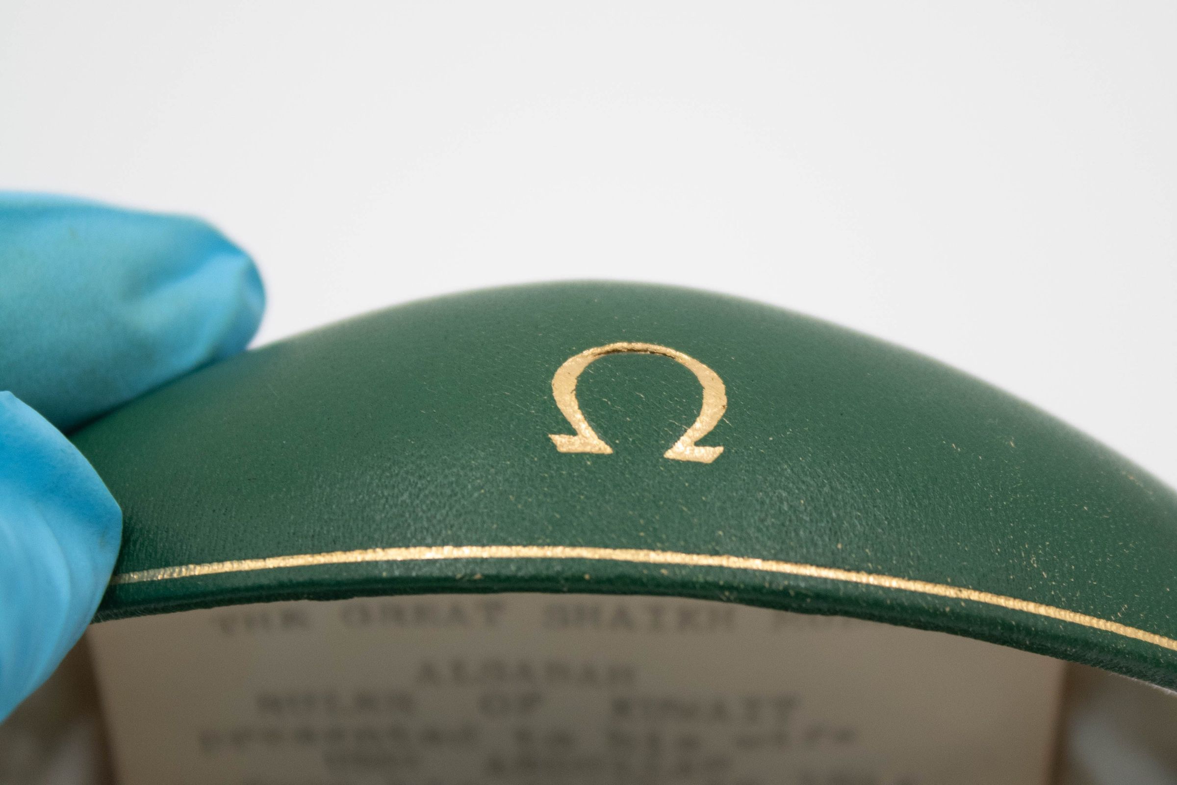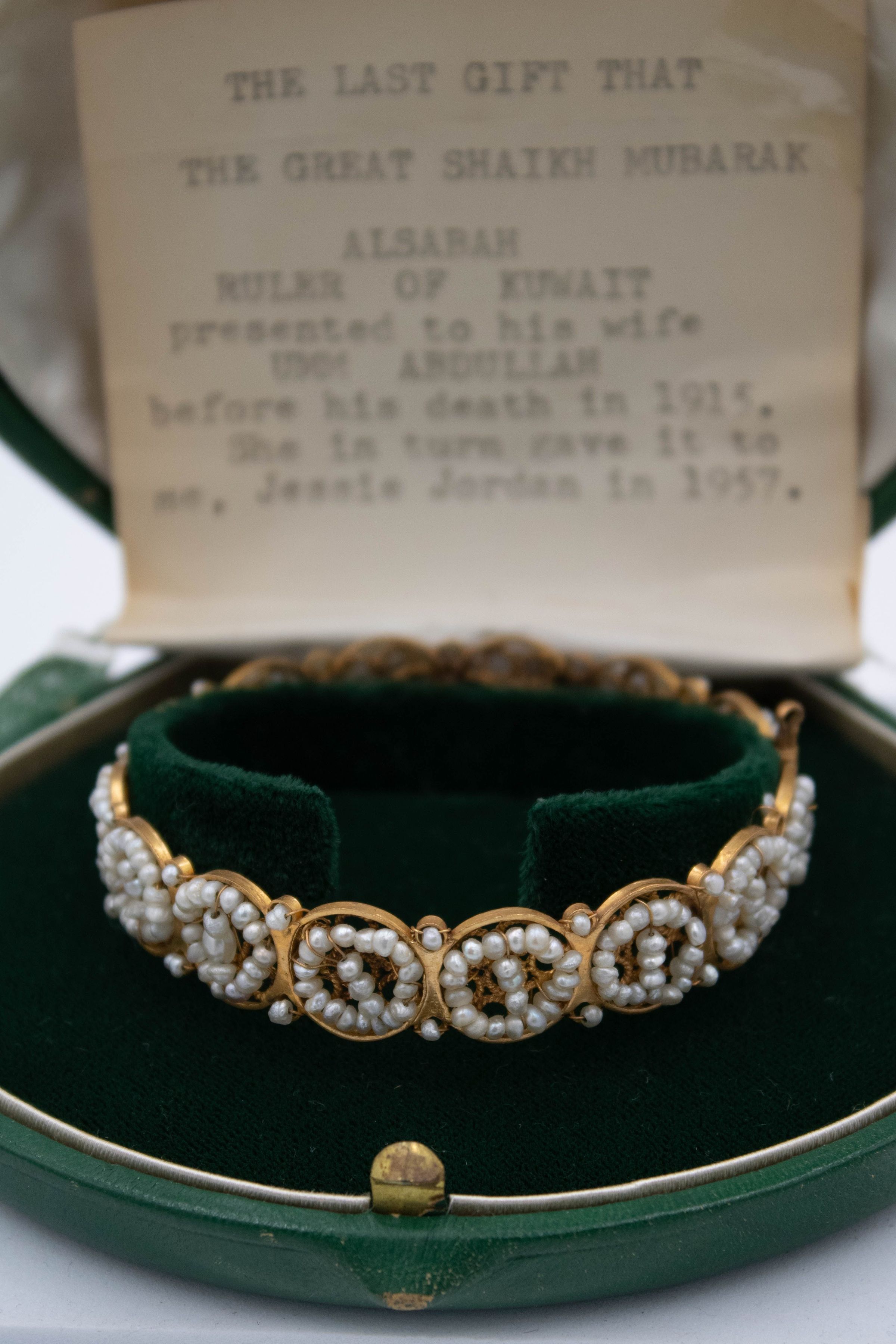 The bracelet is made of gold wire strung with Kuwaiti recede pearls. The bracelet is said to be very old and is held in a green Omega watch case made in Switzerland.Context