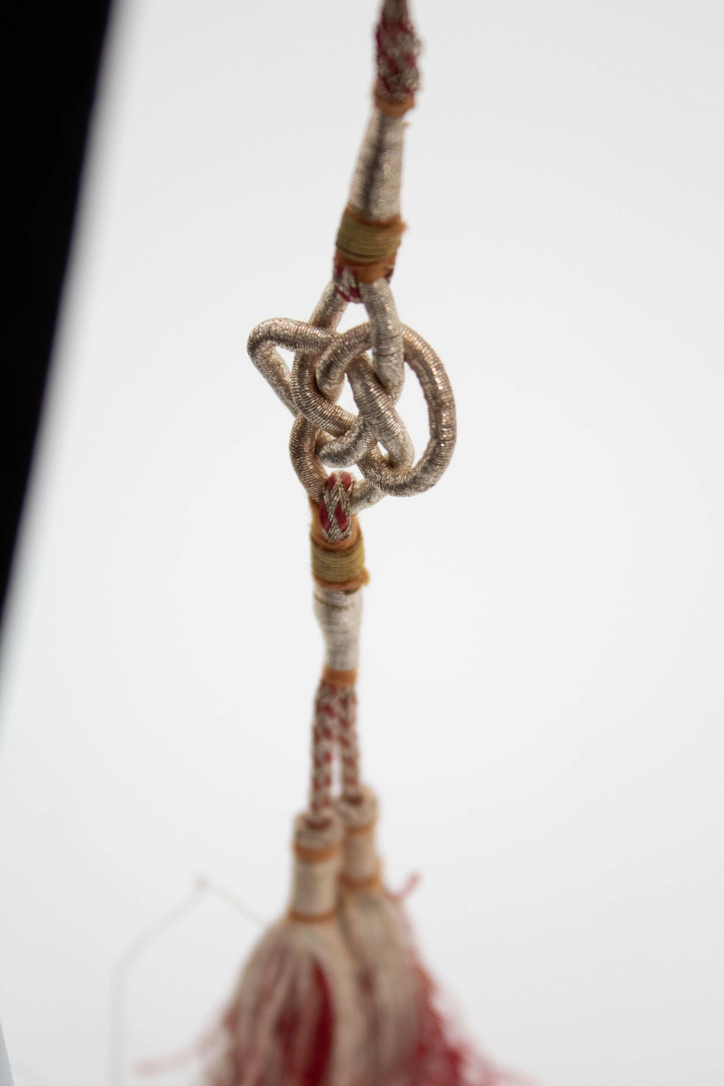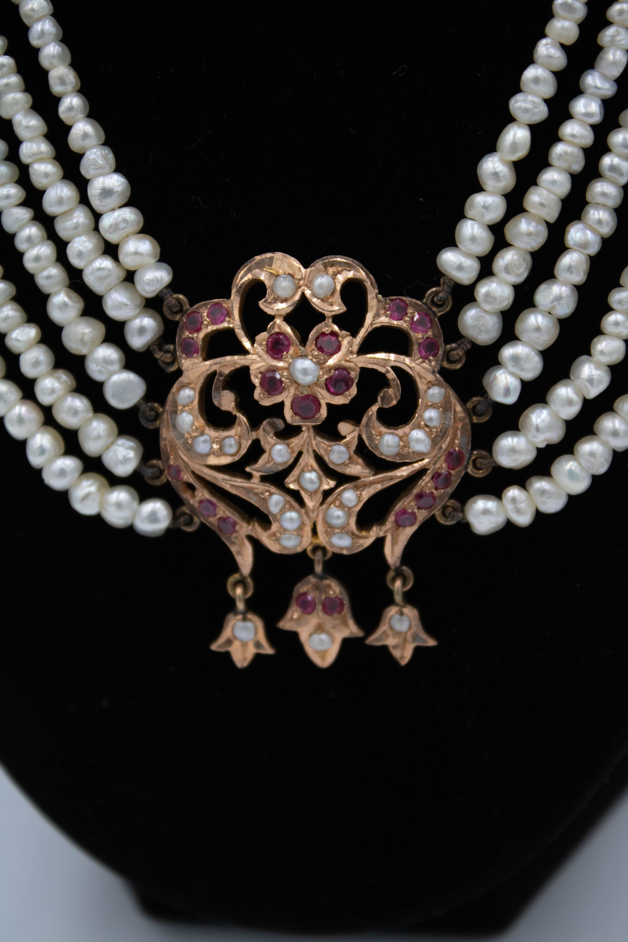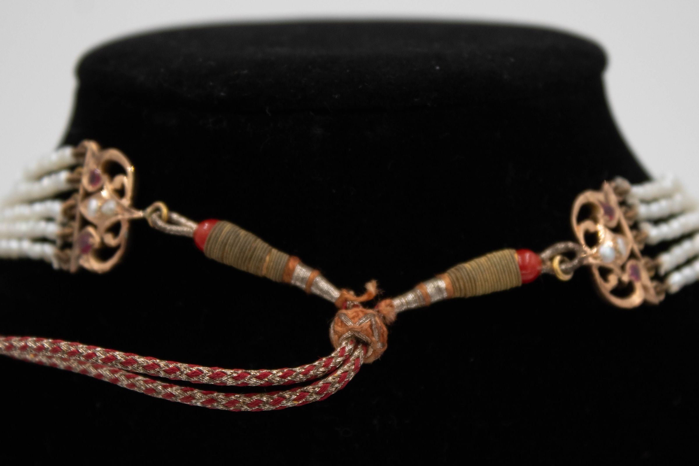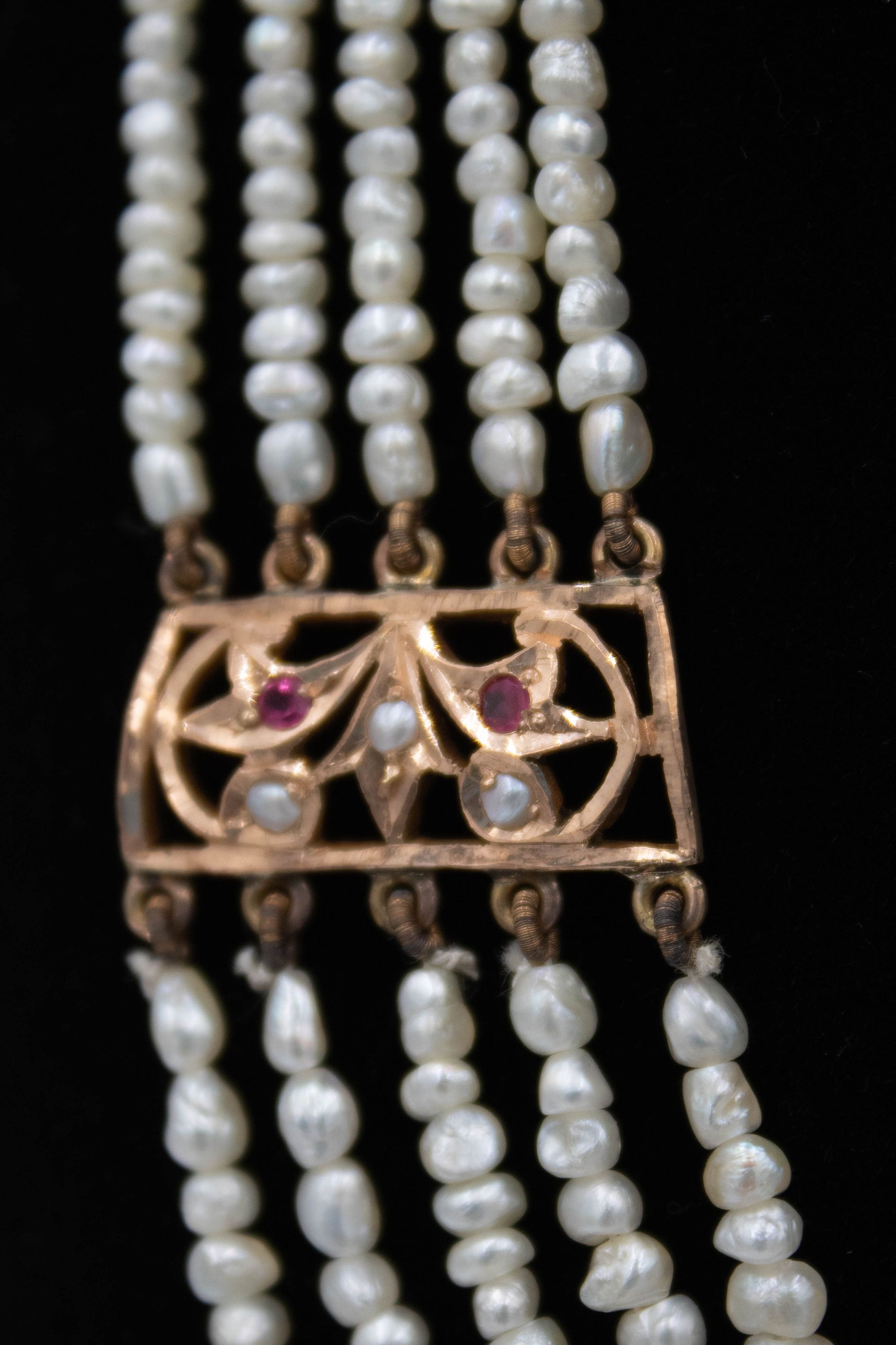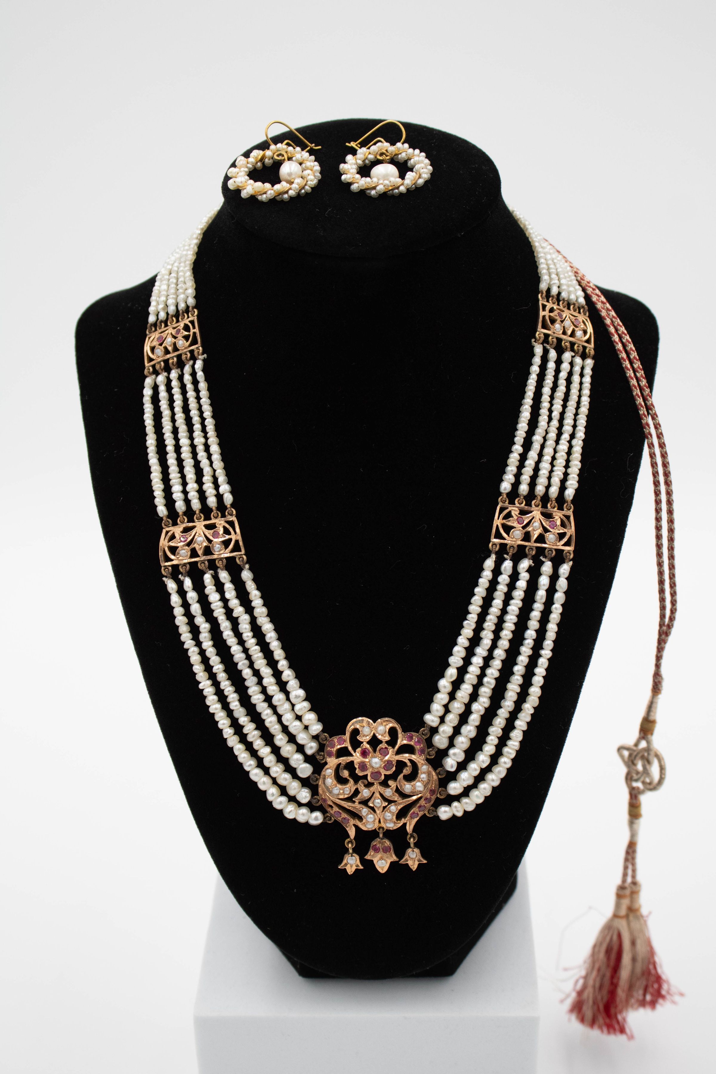 Gold and pearl necklace with ruby and diamond stones. There are 5 pearl strands and the design is known as a Nizami Rani Haar neckalce, meaning "necklace of the queen" and is typically worn by brides. The necklace is made of thin strands Persian Gulf pearls connected by gold appliques and with a long cord down the back. The necklace also has an accompanying matching pair of gulf pearl drop earrings. Rani haar necklaces are typically worn by brides on their wedding day as a part of the Nizami jewelry set. Nizami jewelry refers to the extravagant and expensive jewelry style that flourished during the Nizam Era in Hyderabad, India, from 1724-1948.Context
