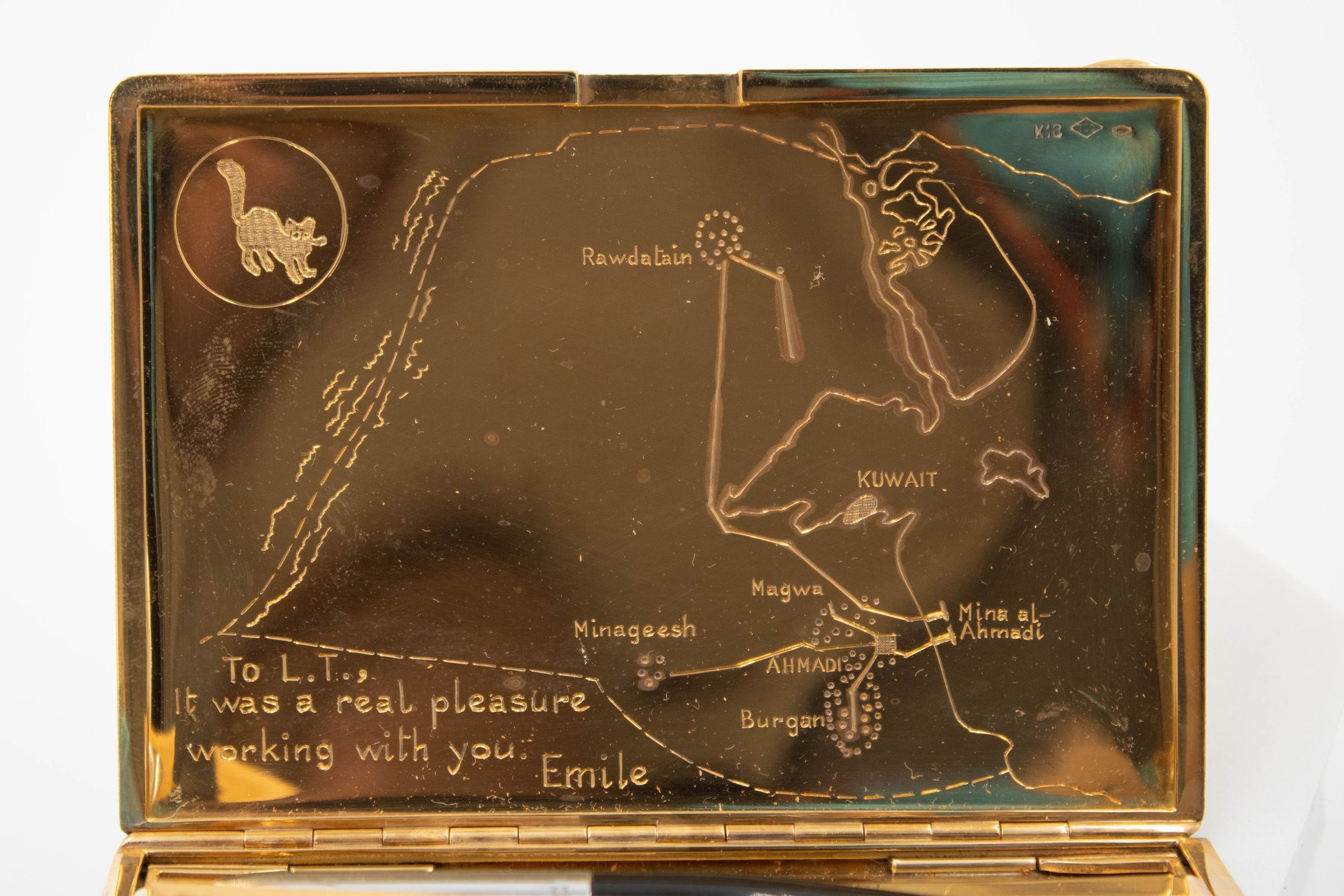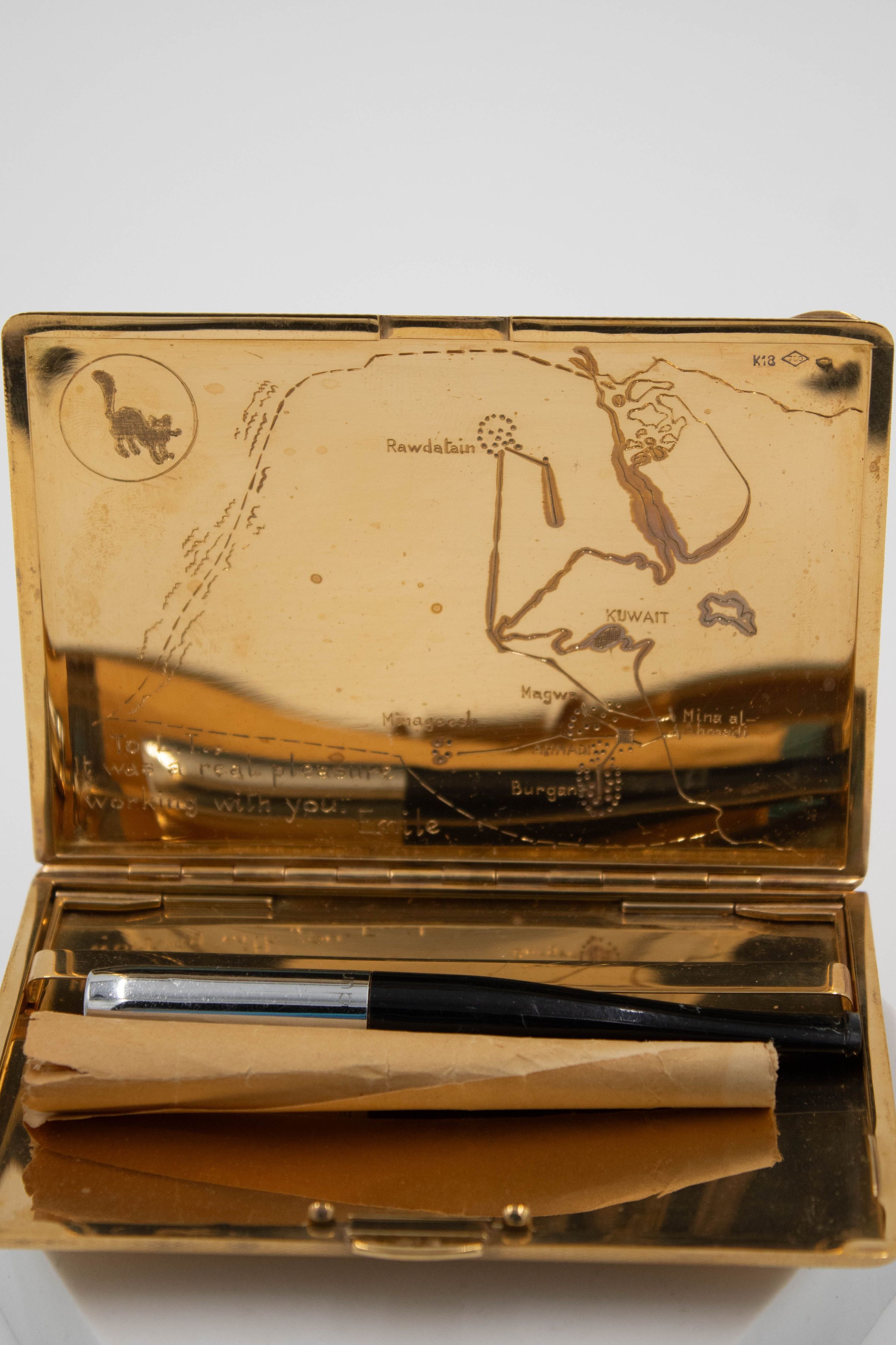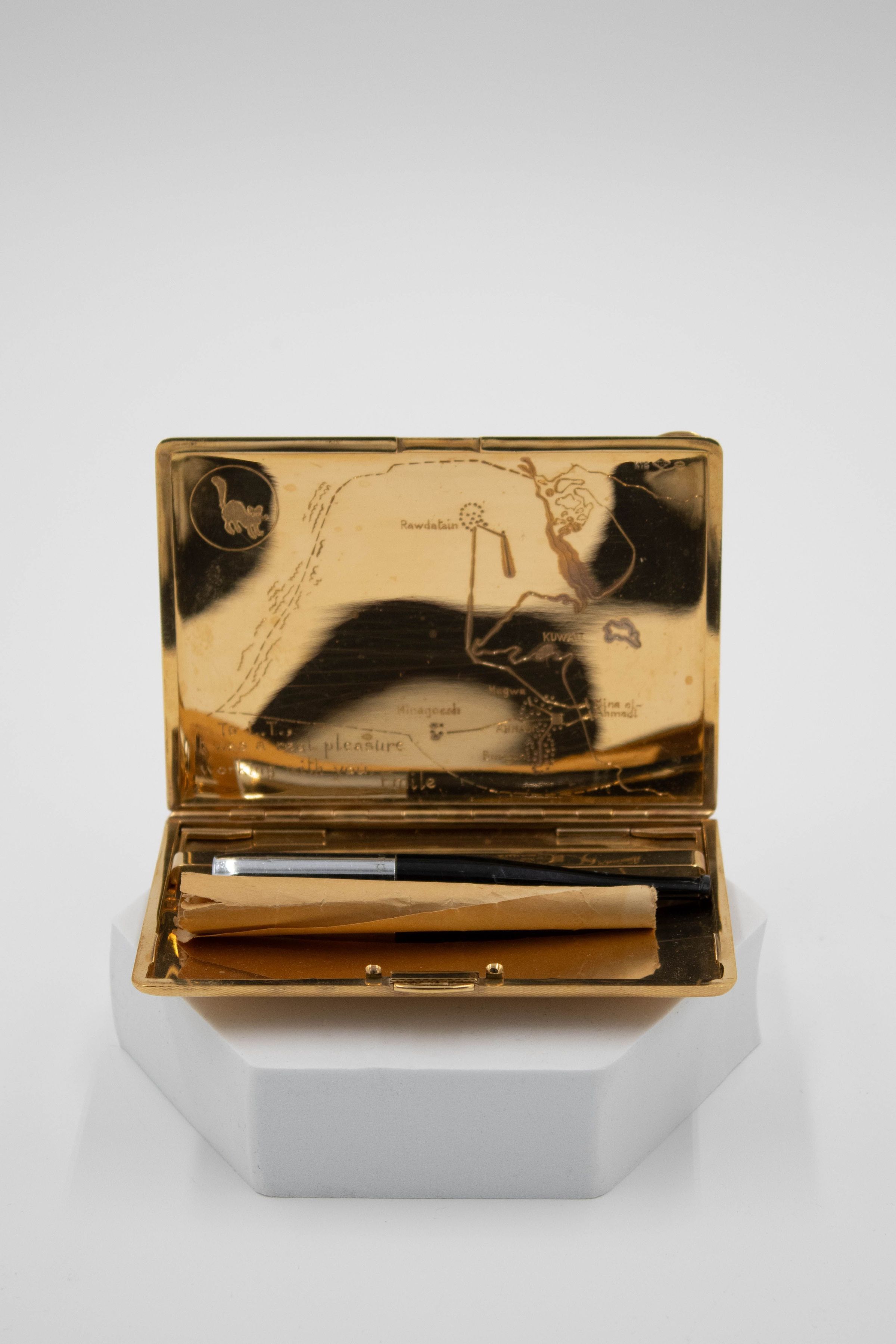 Gold cigarette case with a map of Kuwait engraved into the inside cover.Context