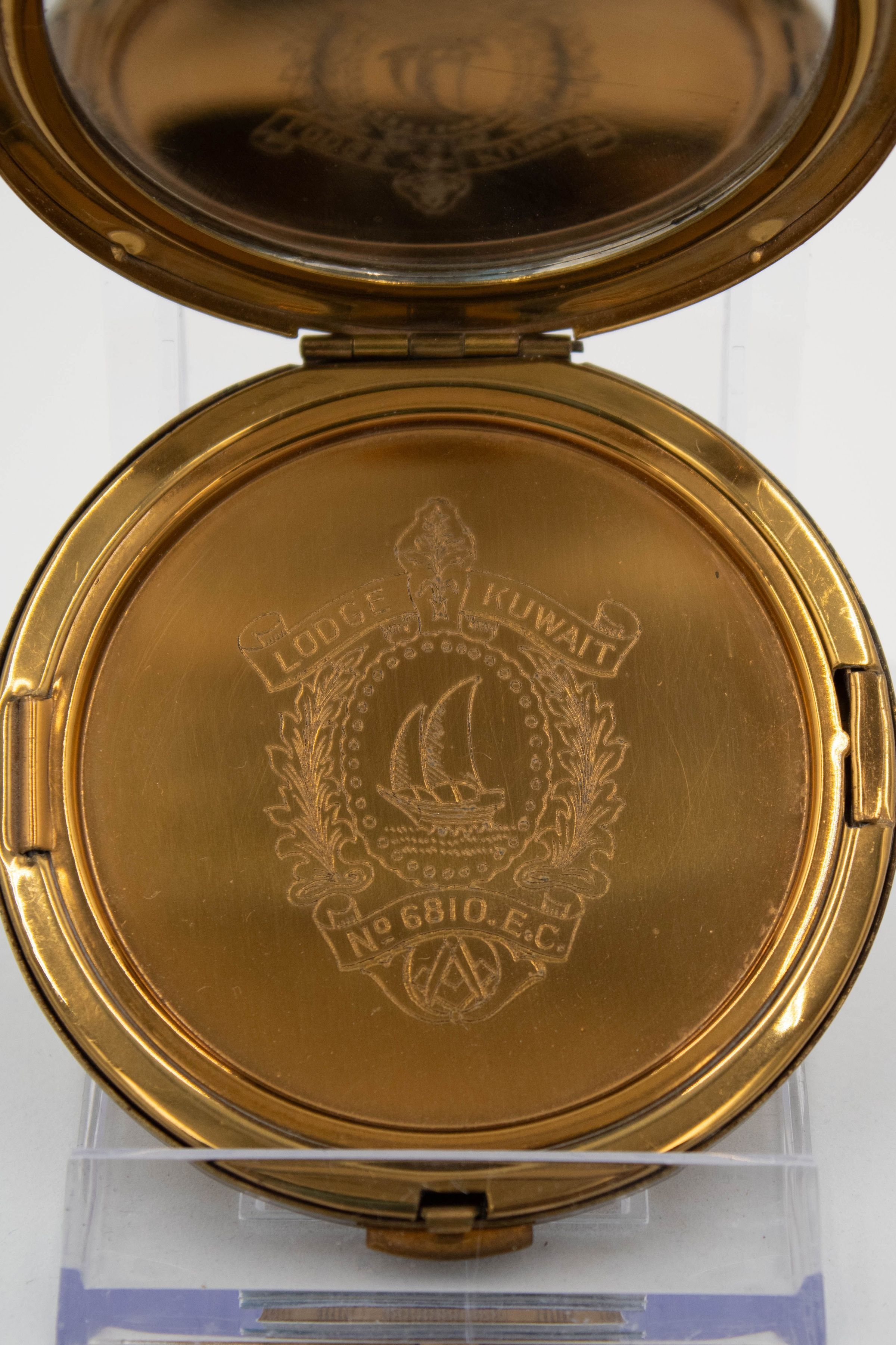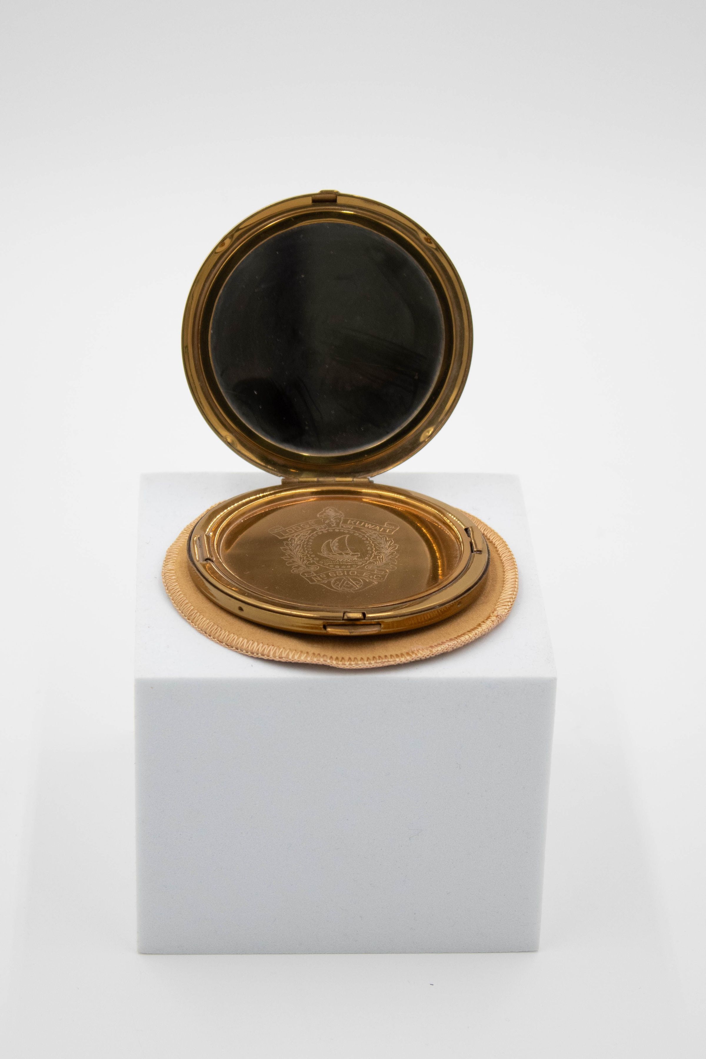 Gold compact from Kuwait Masonic Lodge 6810. The compact would have held a small face powder and is engraved with the Kuwait Lodge seal, which has a small Kuwaiti dhow and the traditional Freemason square and compass.Context