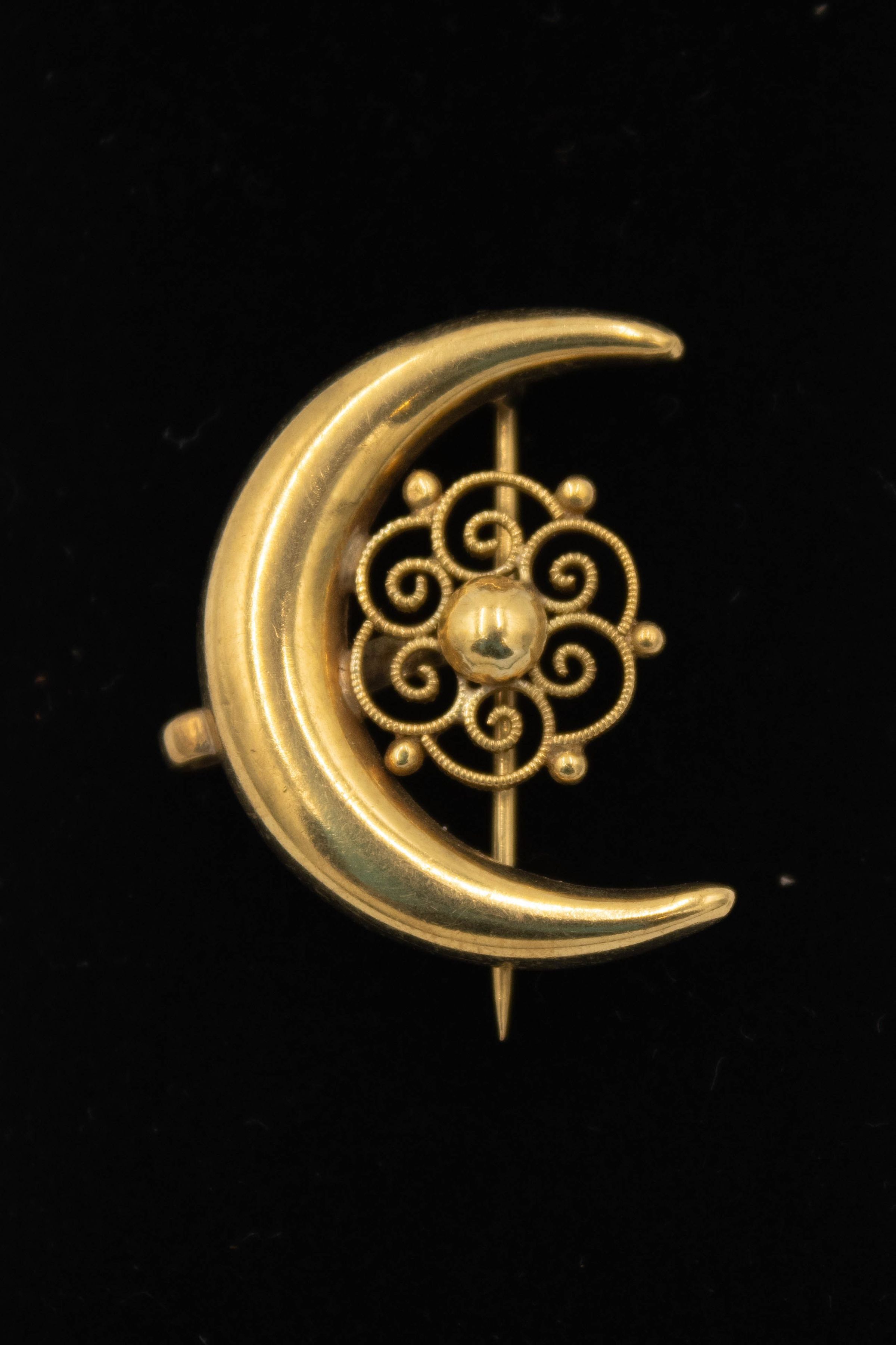 Gold crescent pin with flower detail. The gold crescent and flower pin was likely made during the end of the Victorian Era from 1837-1901.Context