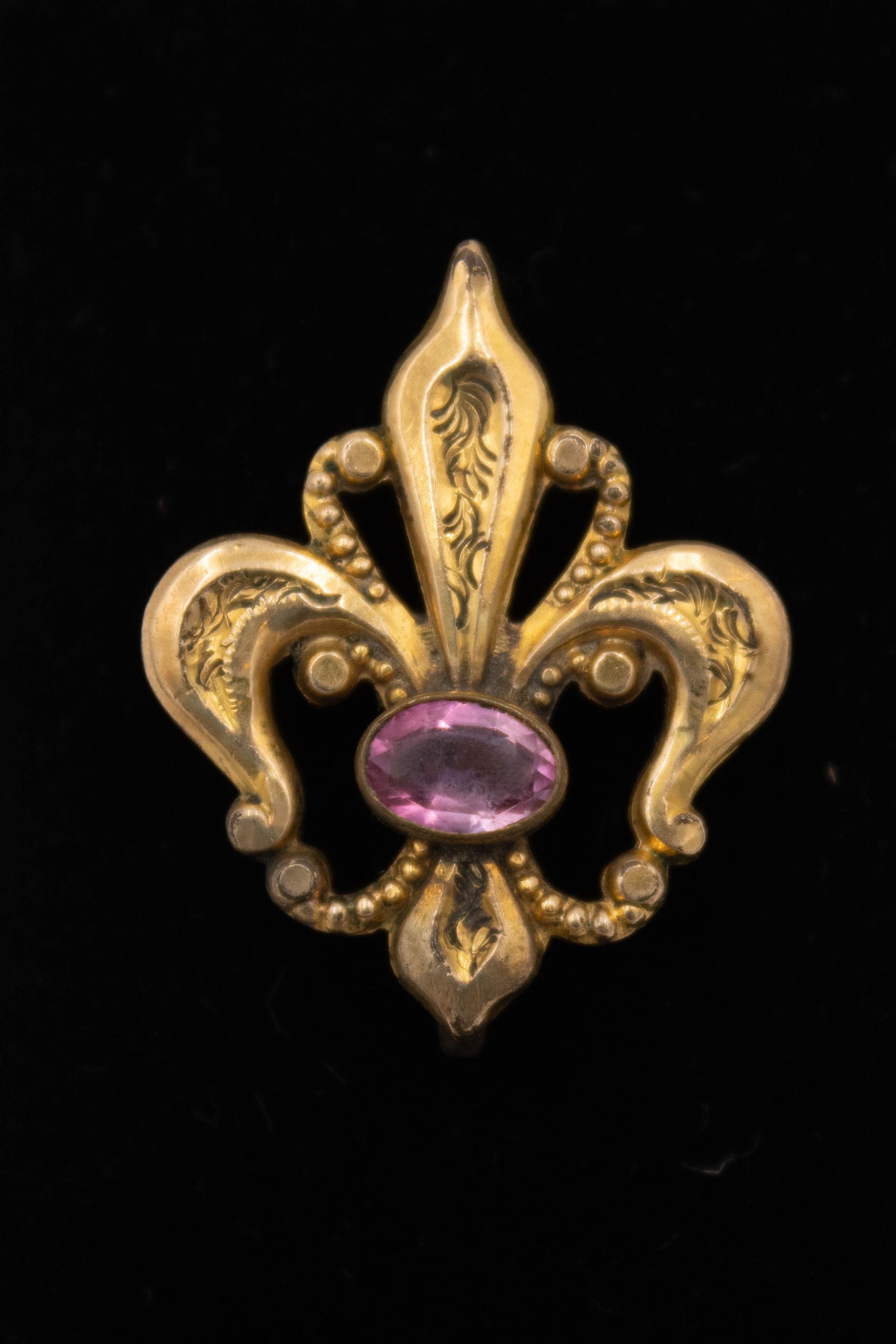 Gold fleur d'lis pin with amethyst stone in center. The pin is engraved with small line details.Context