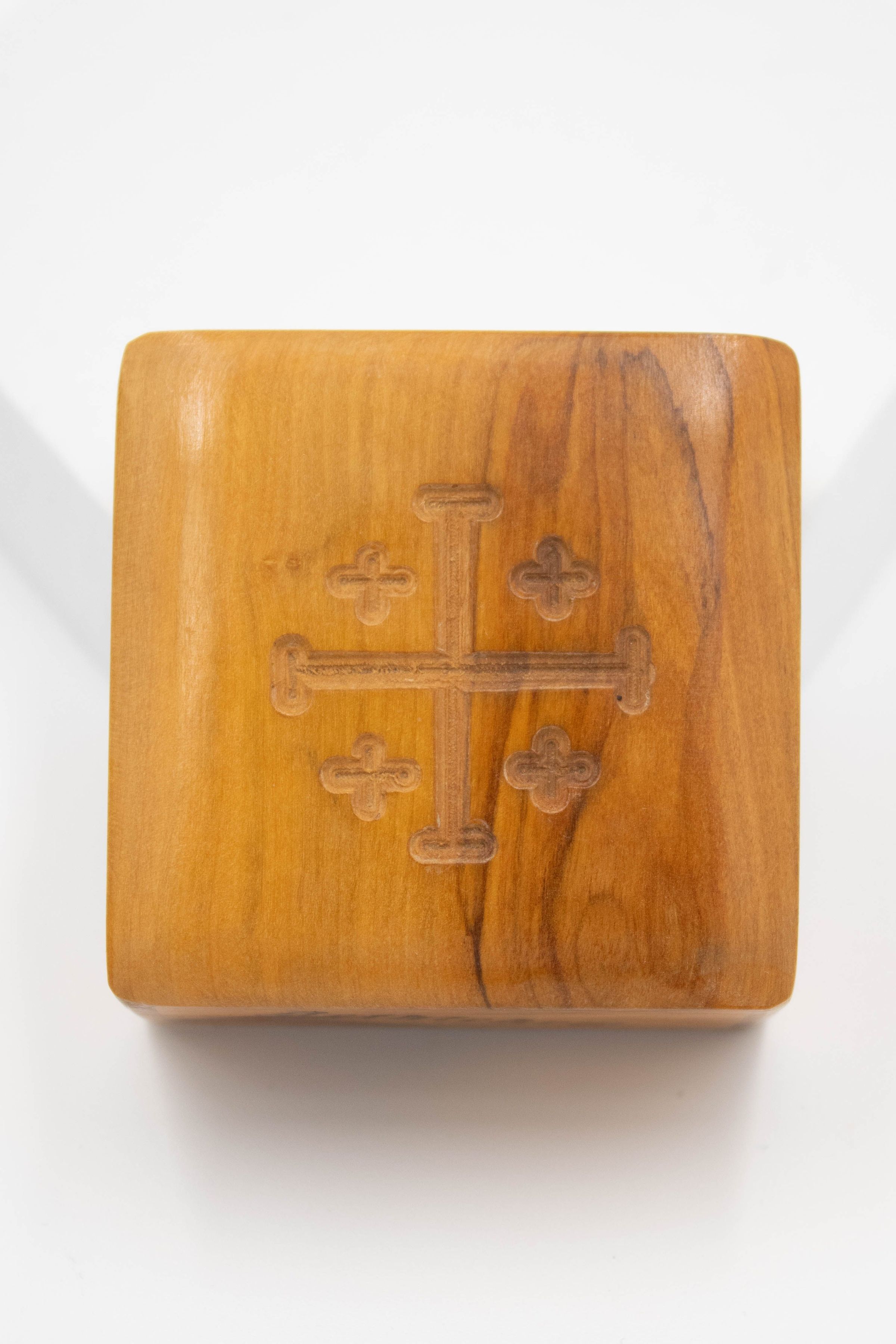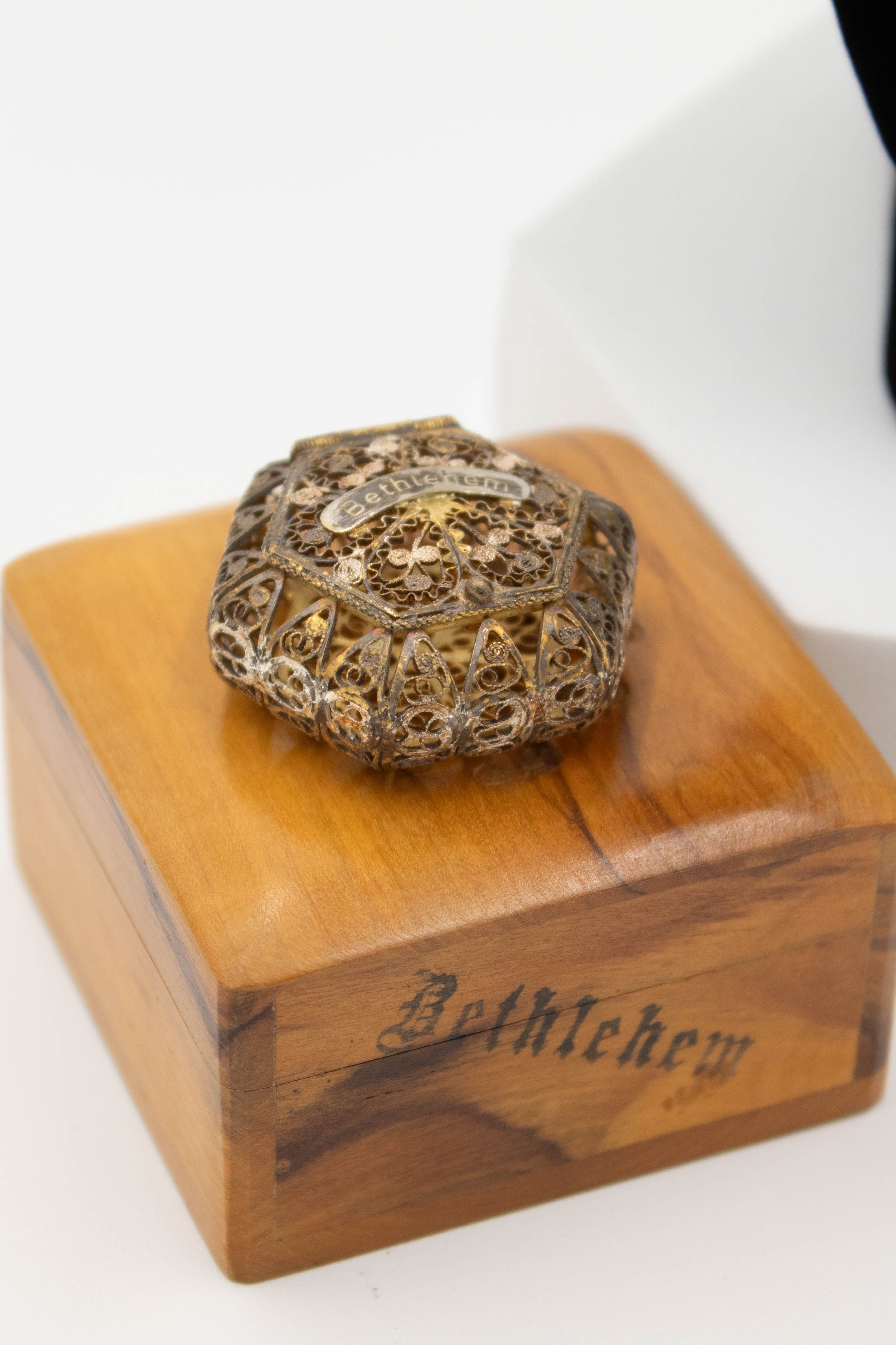 Gold rosary and wooden box with heat stamp of "Bethlehem;" gold decorative top.Context