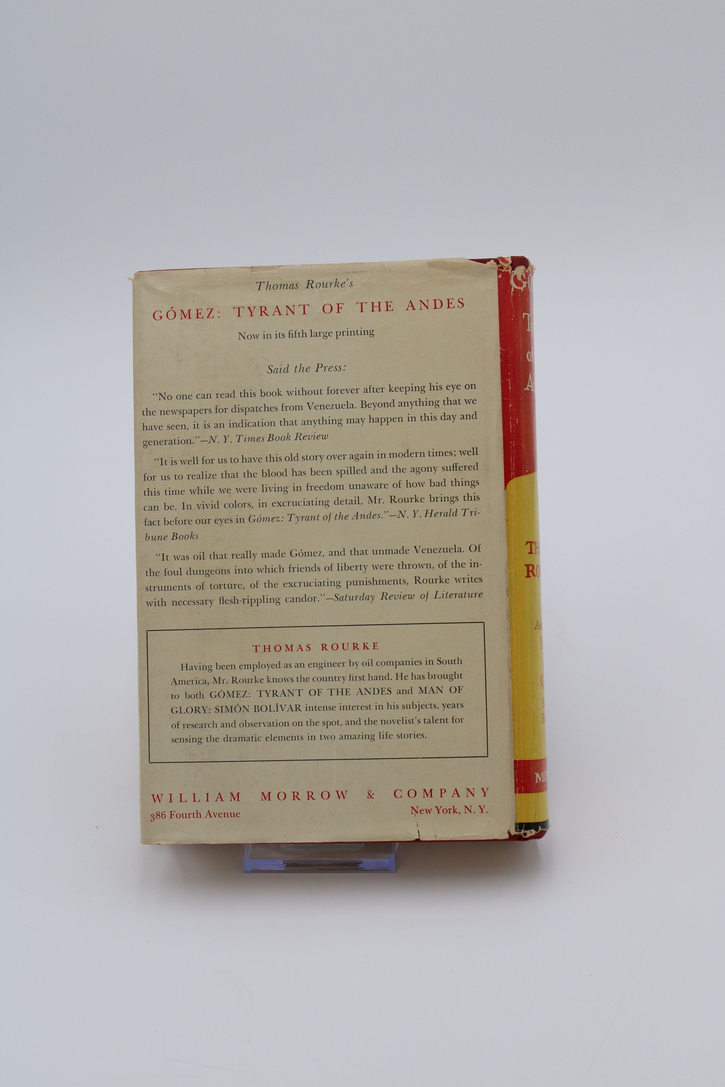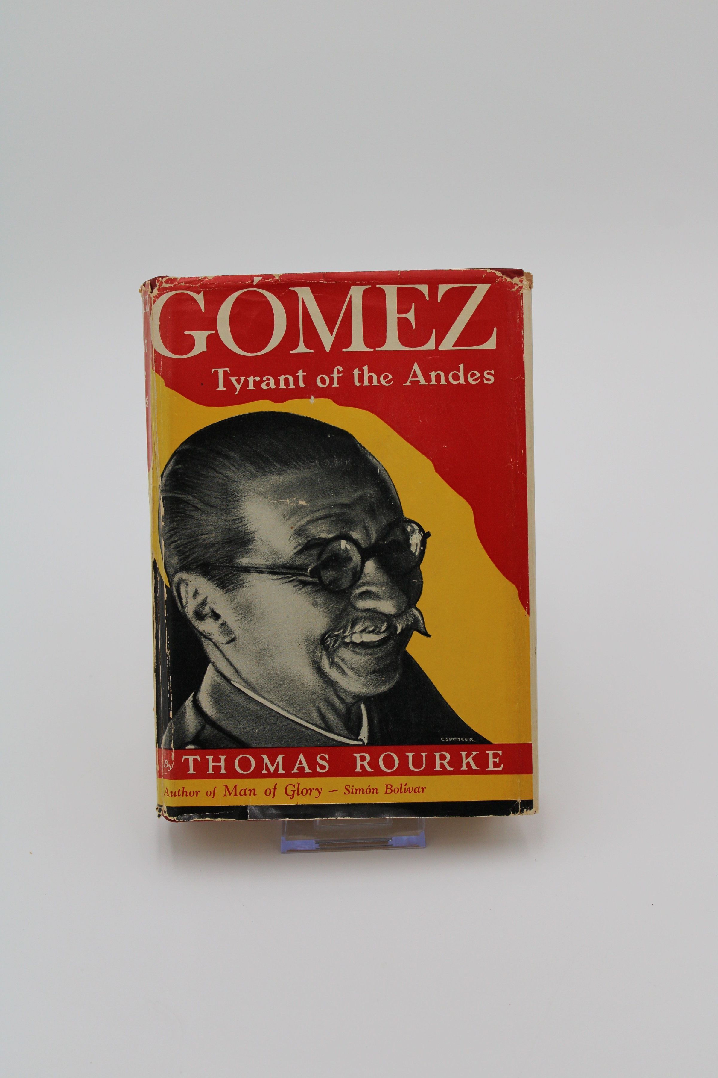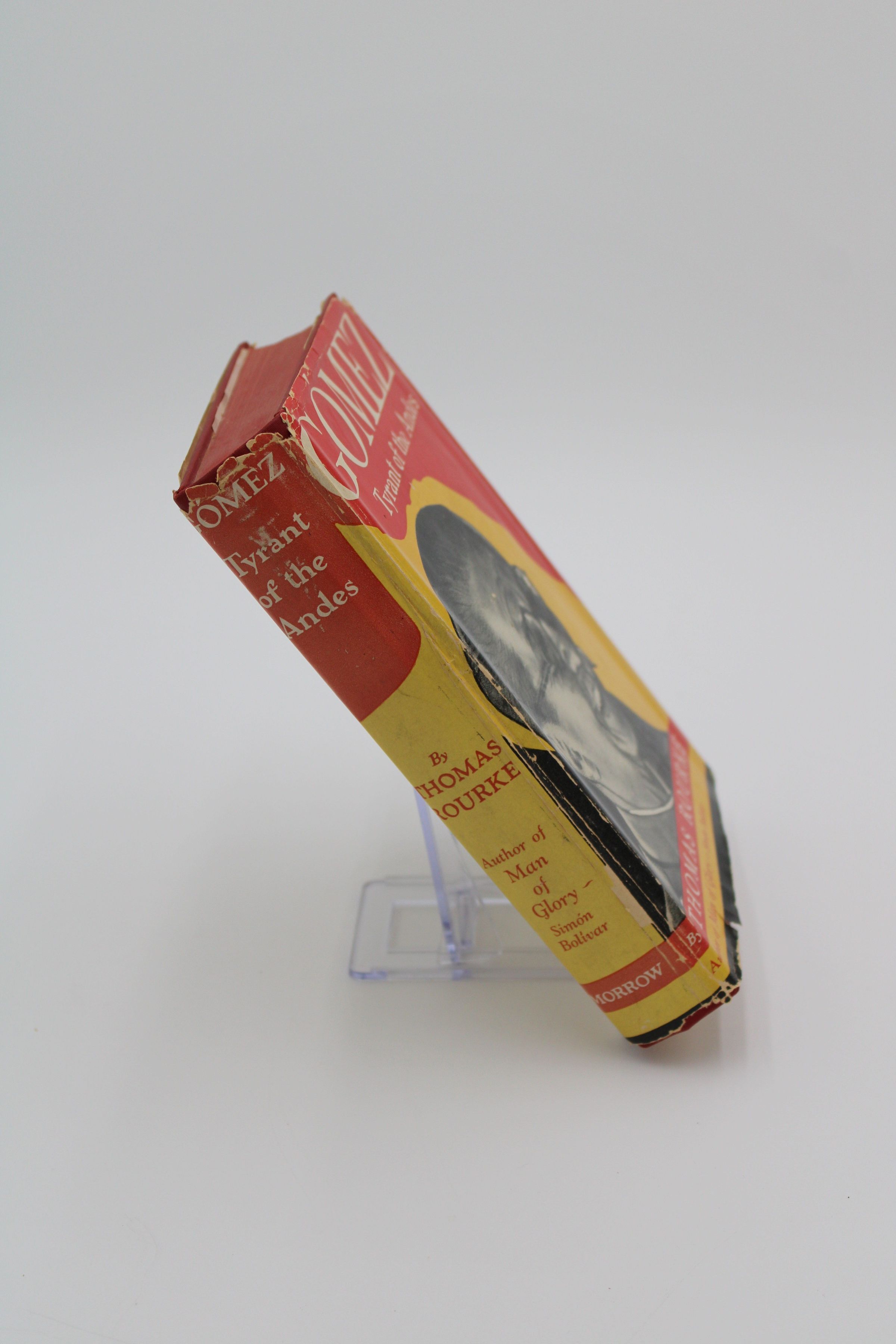 The front cover of "Gomez: Tyrant of the Andes" has a black-and-white photo of former Venezuelan dictator Juan Vicente Gomez on a red, yellow and black background.