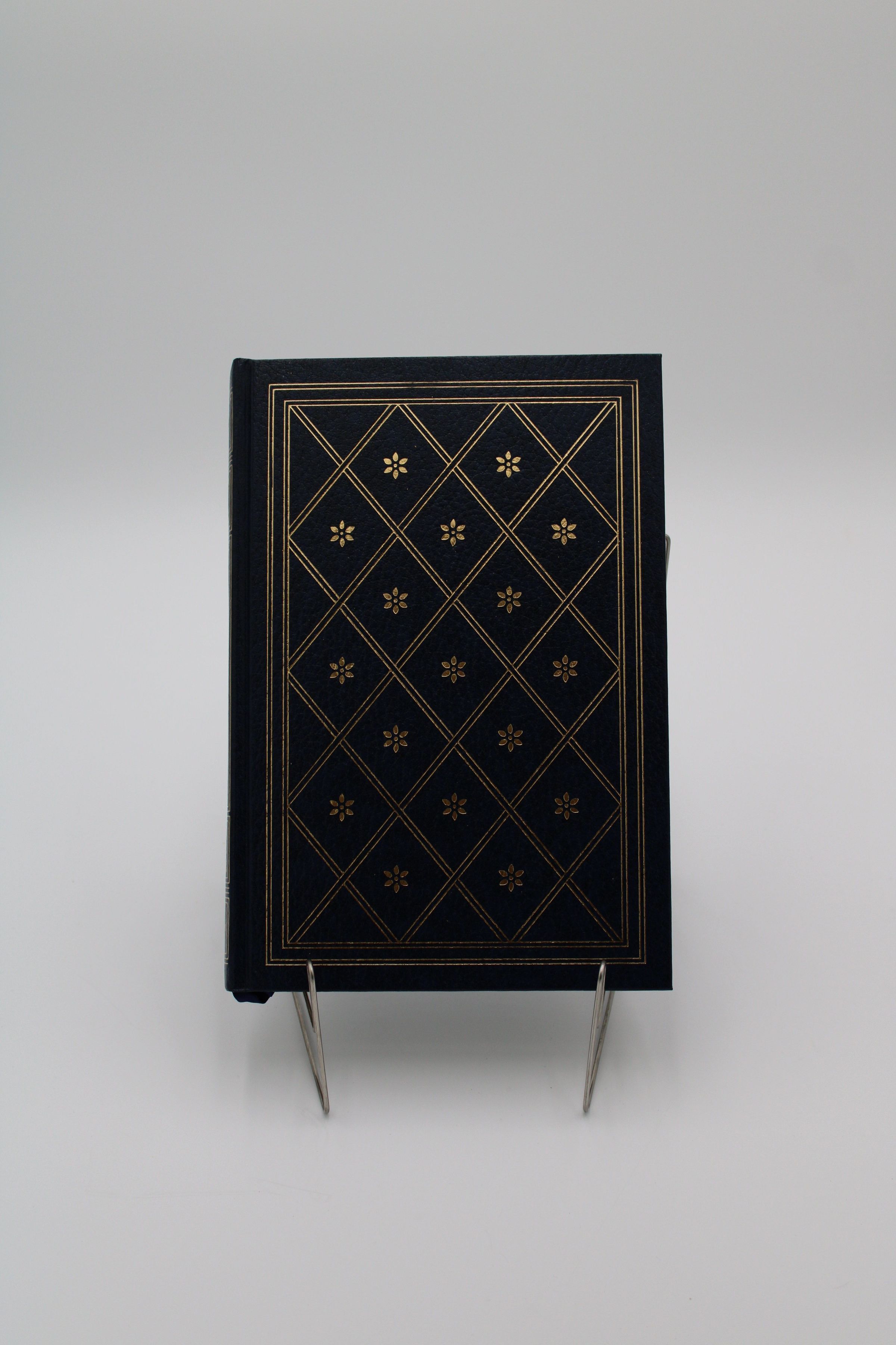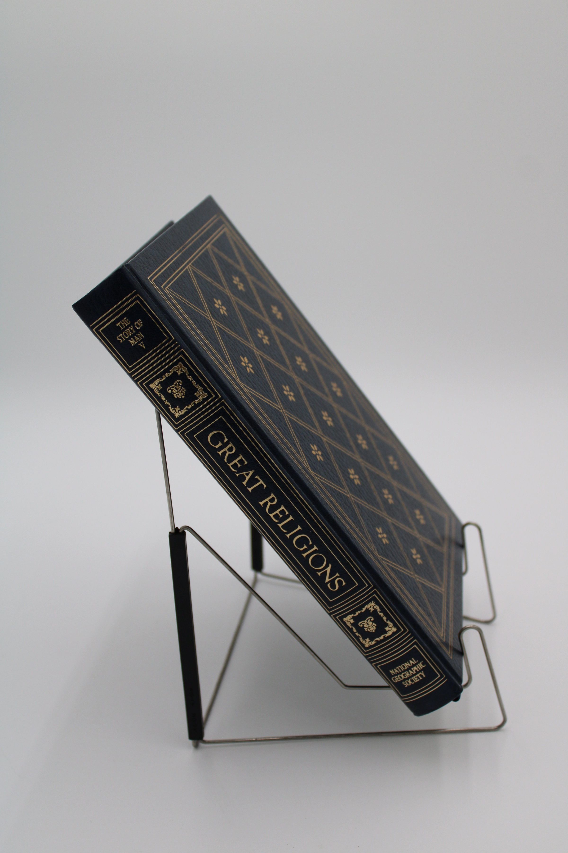 The front cover of “Great Religions” is made of black leather and features a repeating diamond pattern. Inside the diamonds are small flowers. All of the details are colored gold.