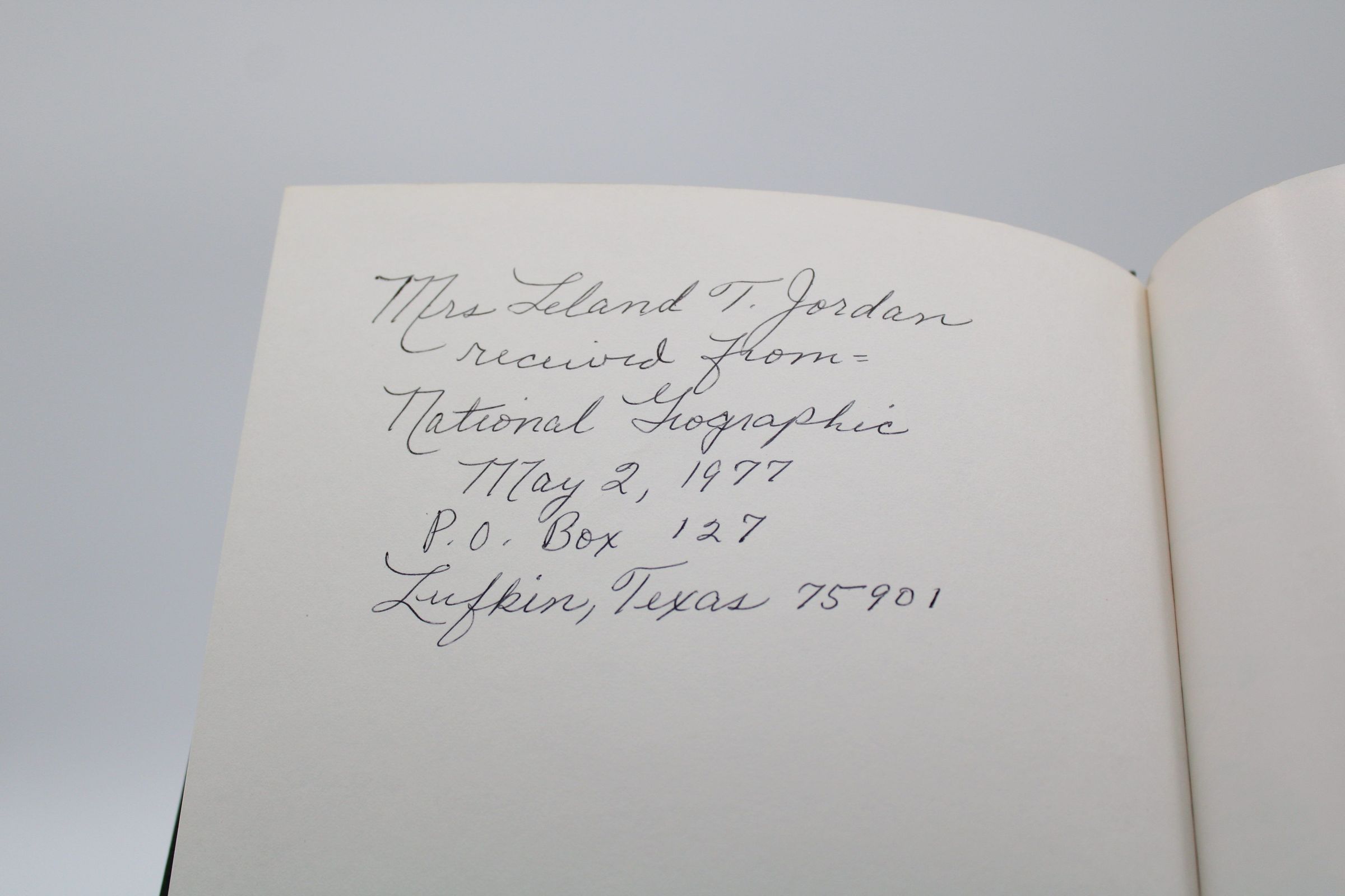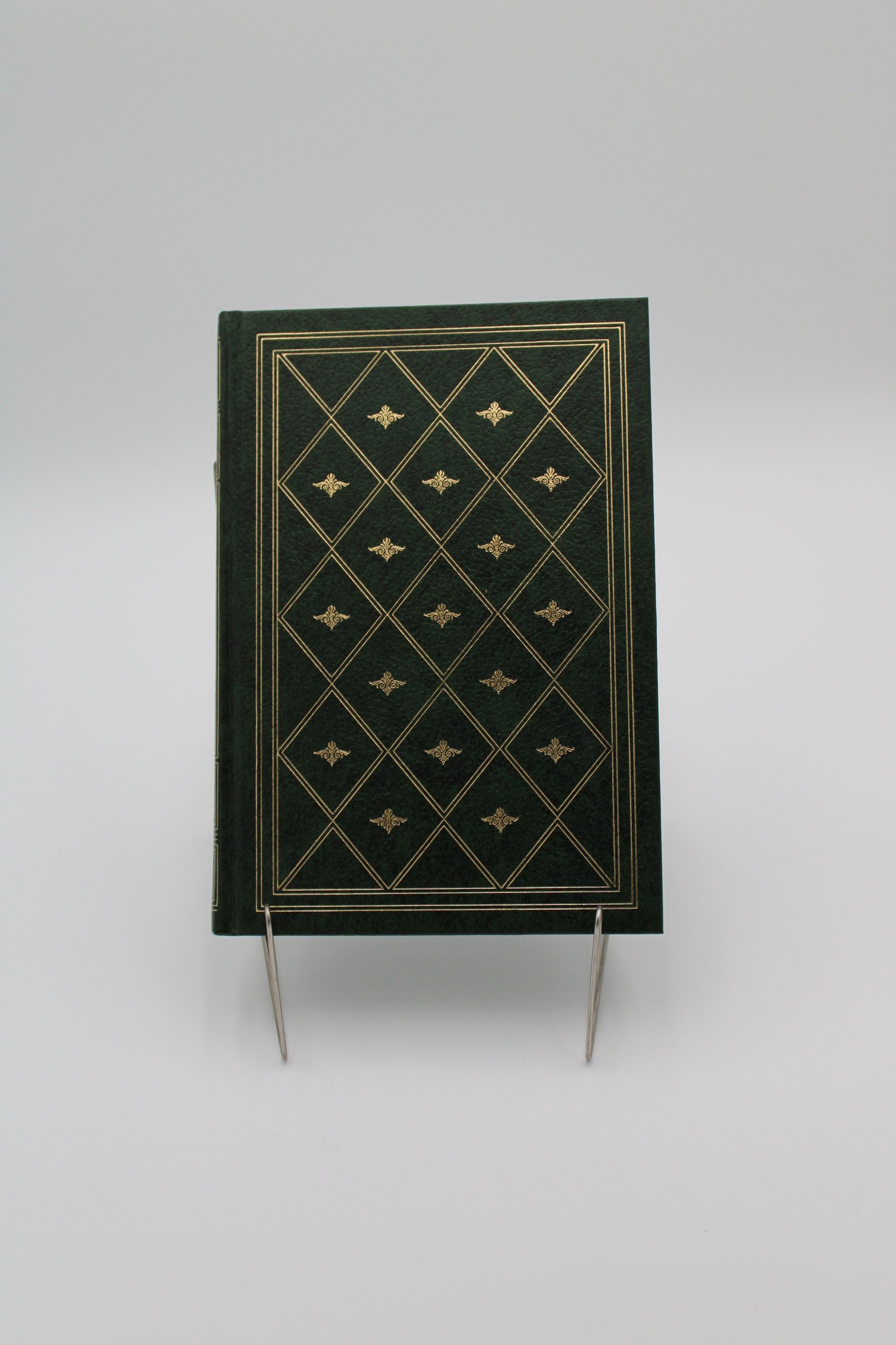 The front cover of “Greece and Rome” is made of green leather and features a repeating diamond pattern. Inside the diamonds are small winged ornamental designs. All of the details are colored gold.