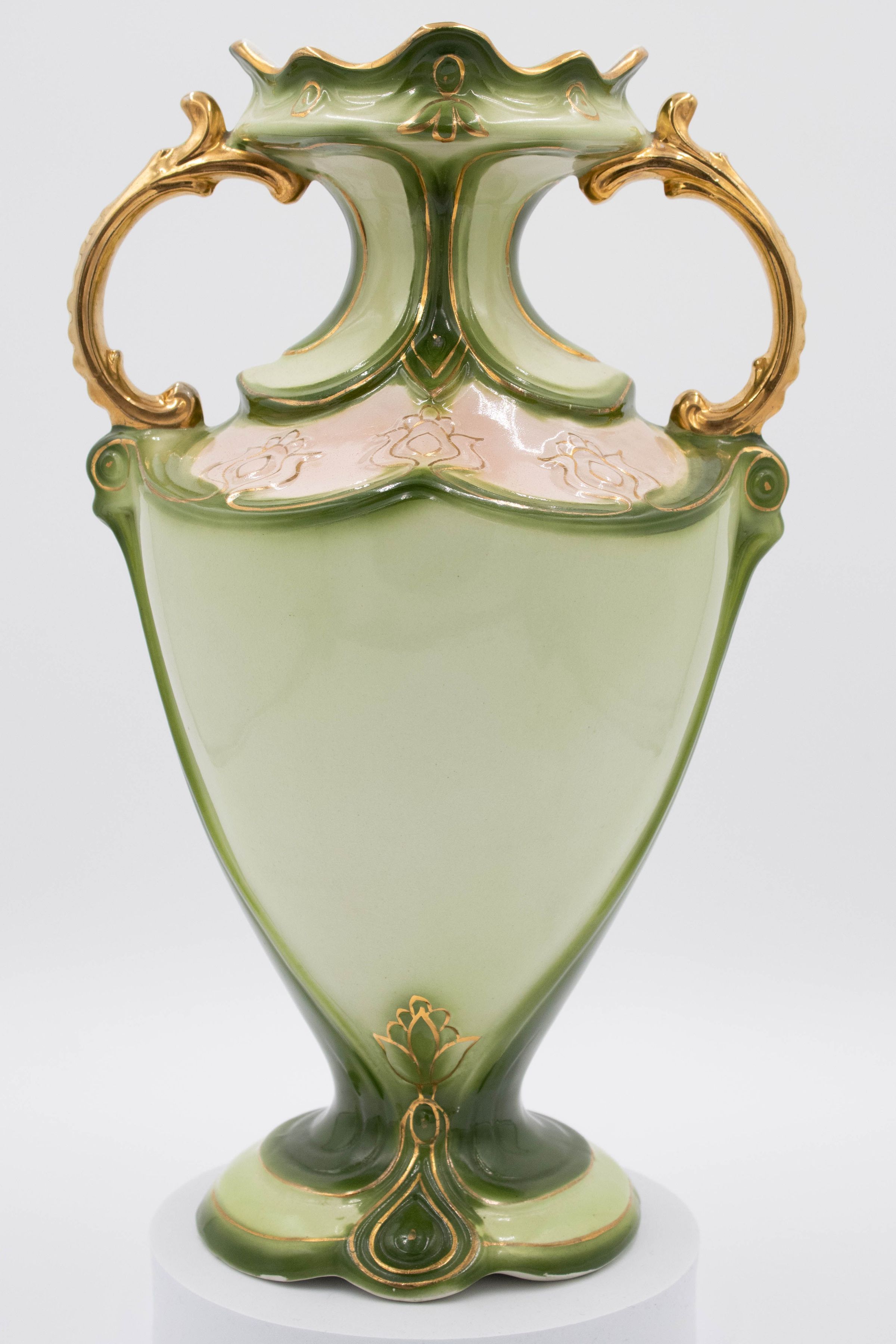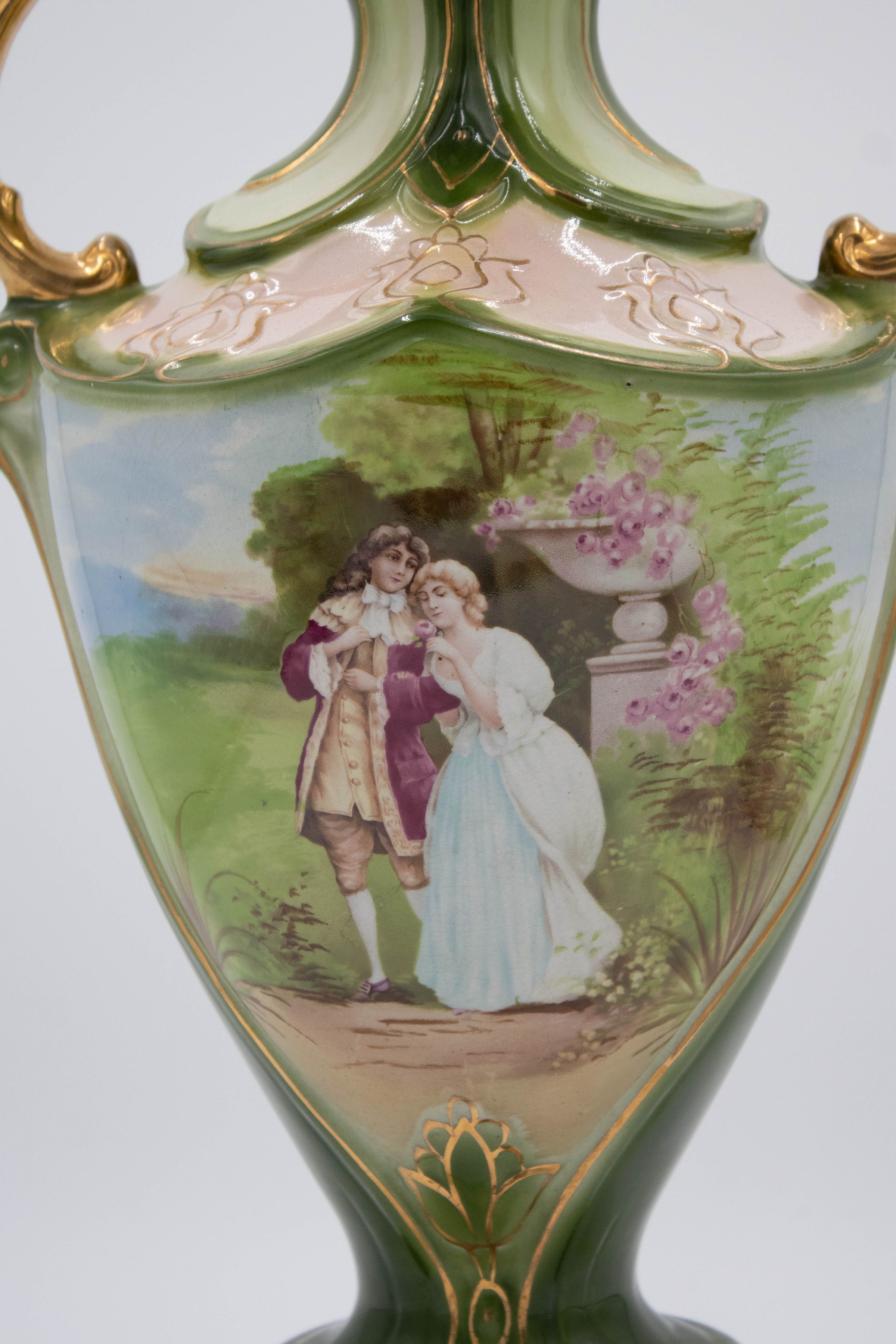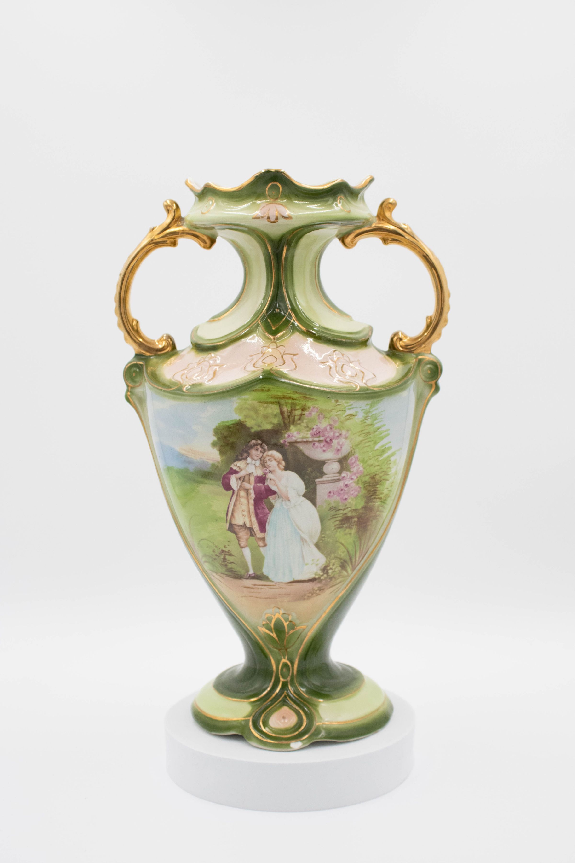 Green porcelain amphora-style artware with gold handles painted with a scene of a colonial man and woman in garden. The back is blank. The vase was made in England.Context