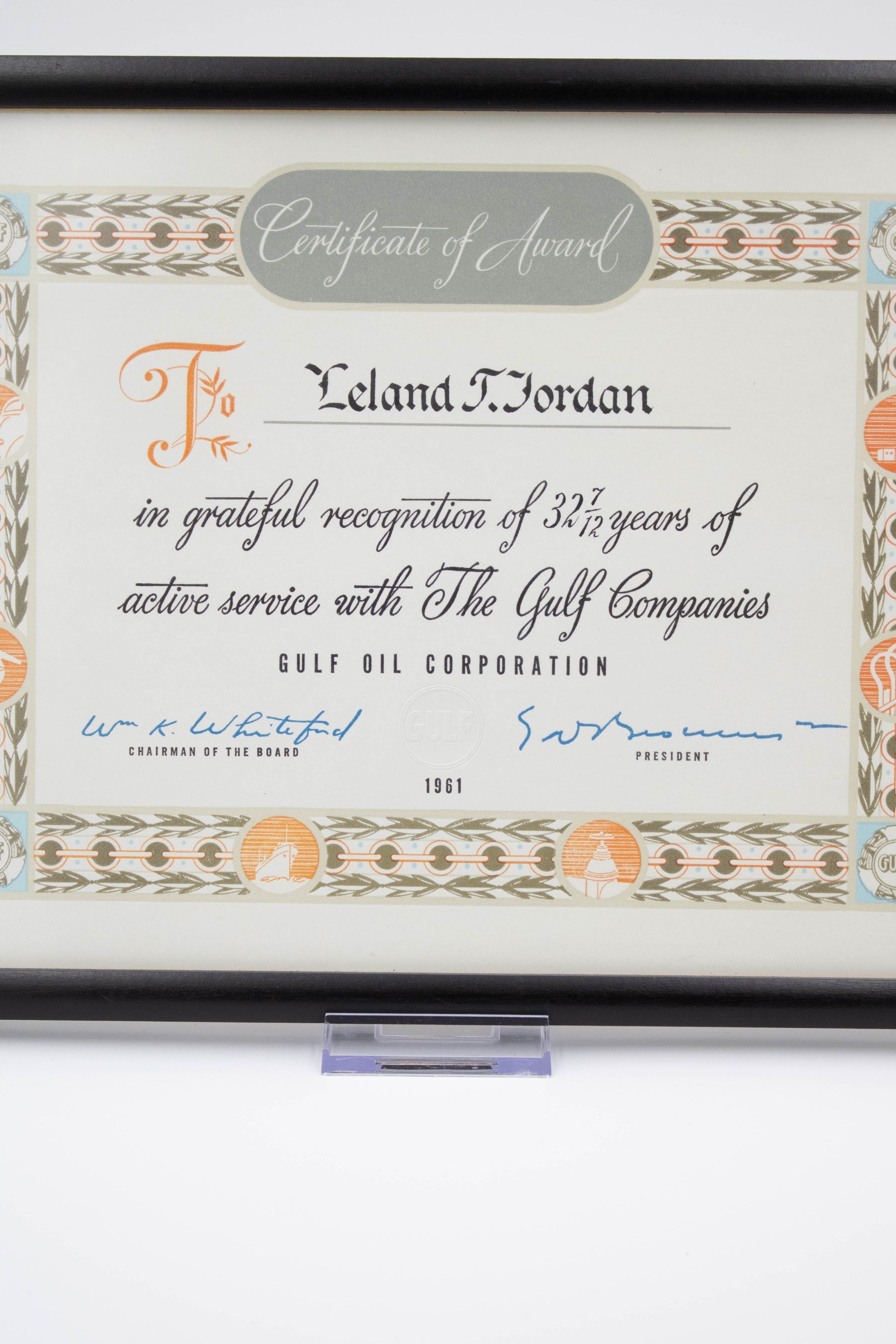 A 10"x13" framed certificate from Gulf Oil Company, "Certificate of Award; To Leland T. Jordan in grateful recognition of 32 7/12 years of active service with the Gulf Companies." It is signed and has a trim with green leaves and orange "Gulf" logos.