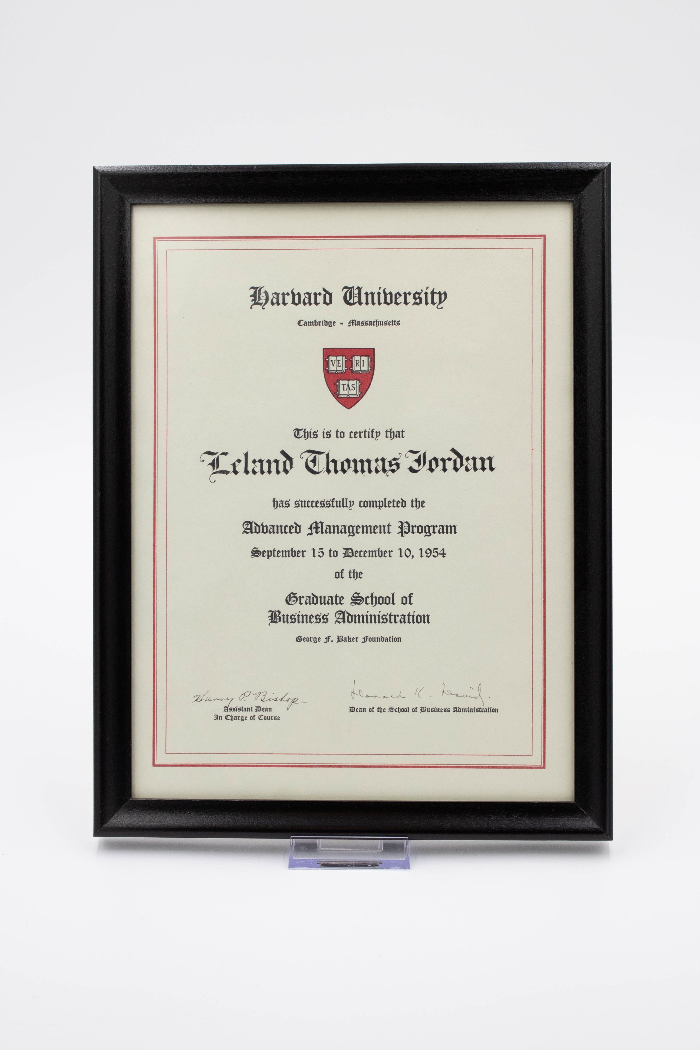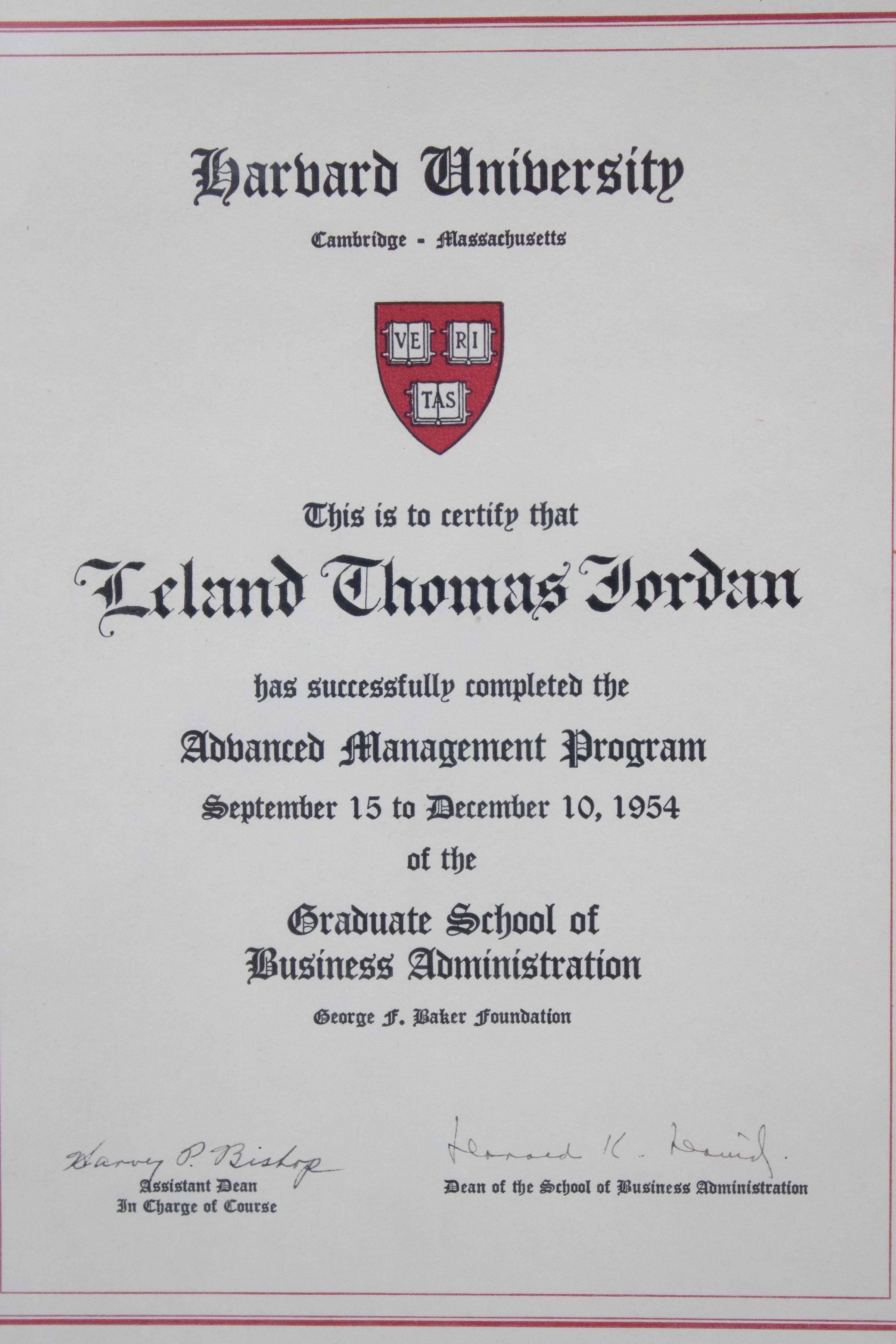 Image of the certificate in its glass case. The certificate is stood up vertically. In cursive script it reads "This is to certify that Leland Thomas Jordan has successfully completed the Advanced Management Program September 15 to December 10, 1954 of the Graduate School of Business Administration.