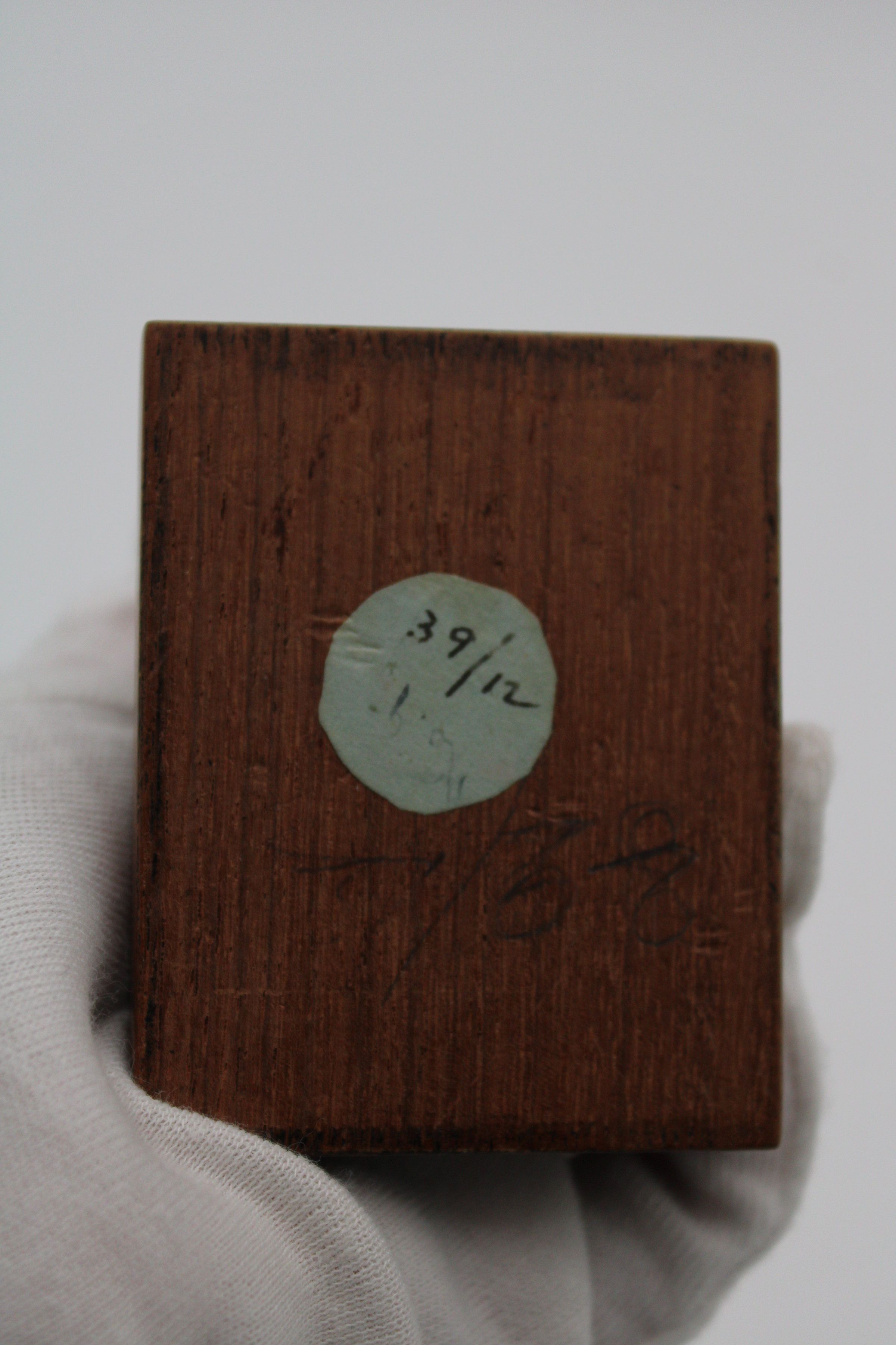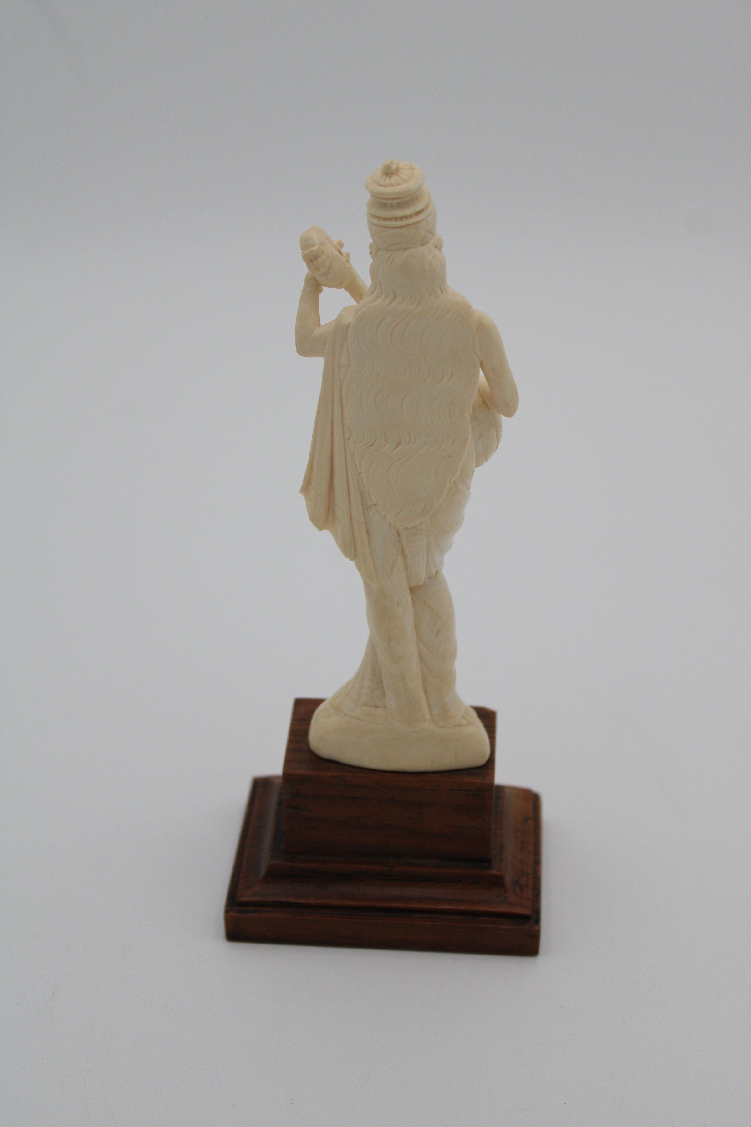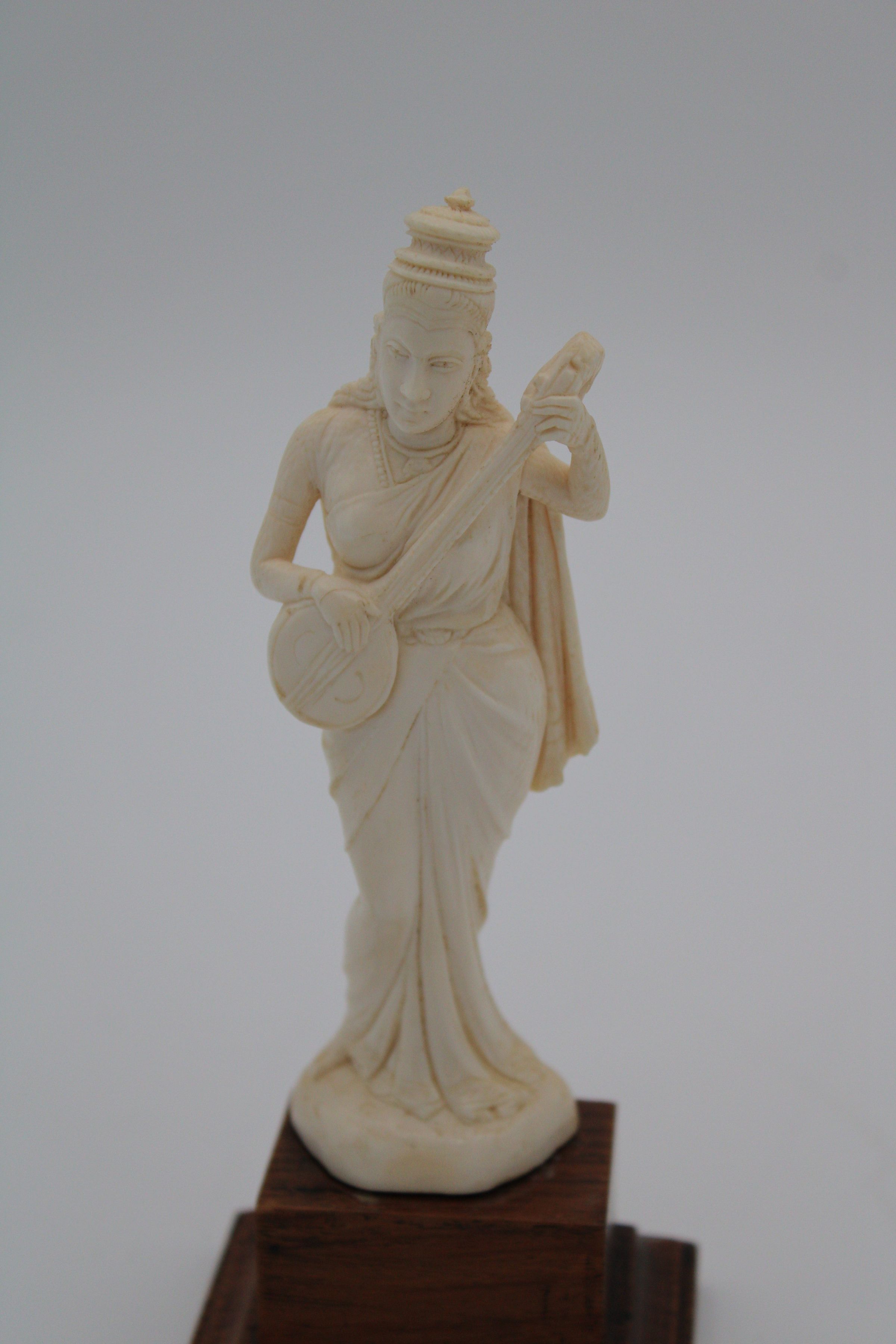The image depicts an intricately carved ivory figurine of a woman holding a stringed instrument, standing on a wooden pedestal. She wears a long layered dress fitted to her body.