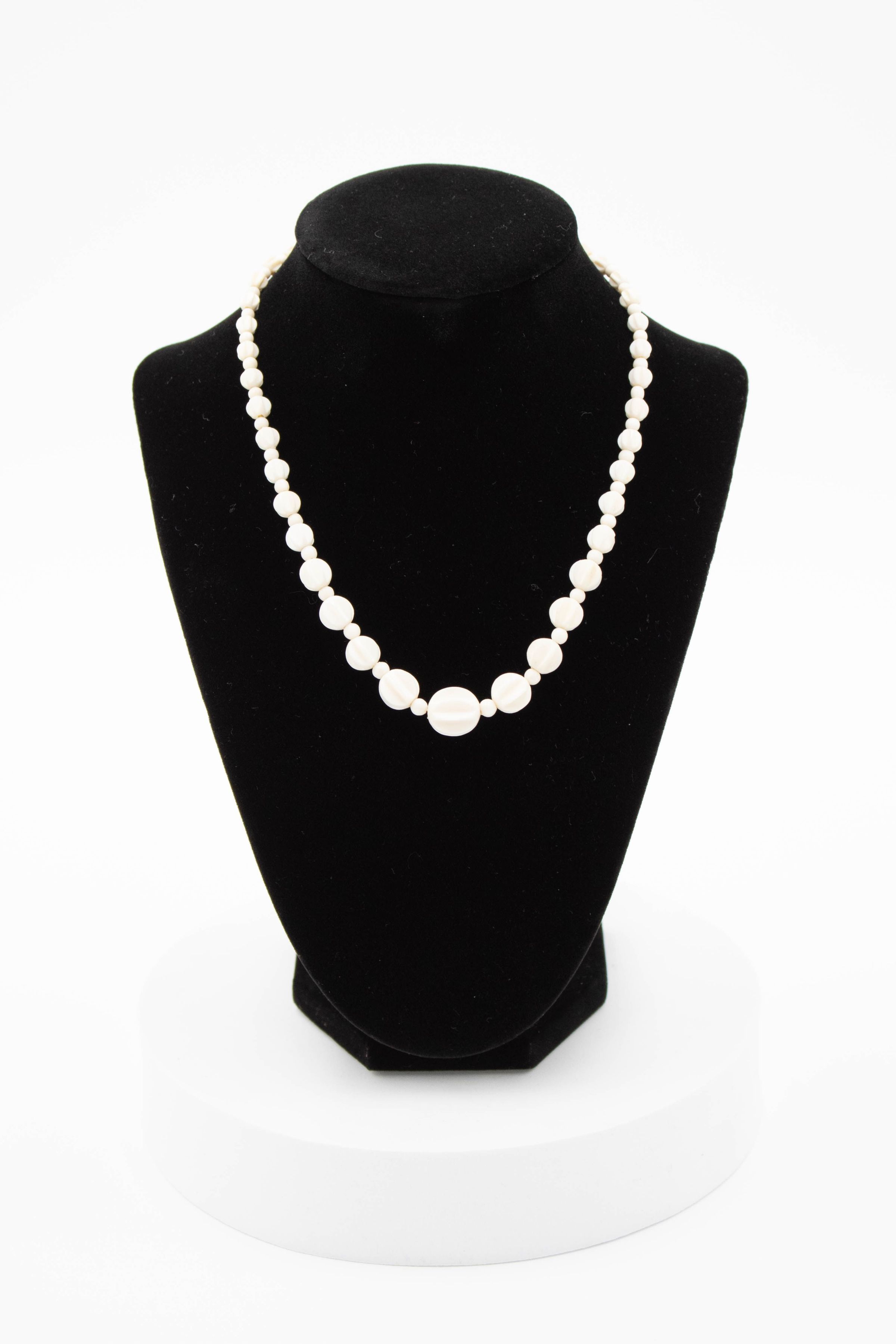 An ivory necklace with round, grooved beads displayed on a black velvet mannequin.