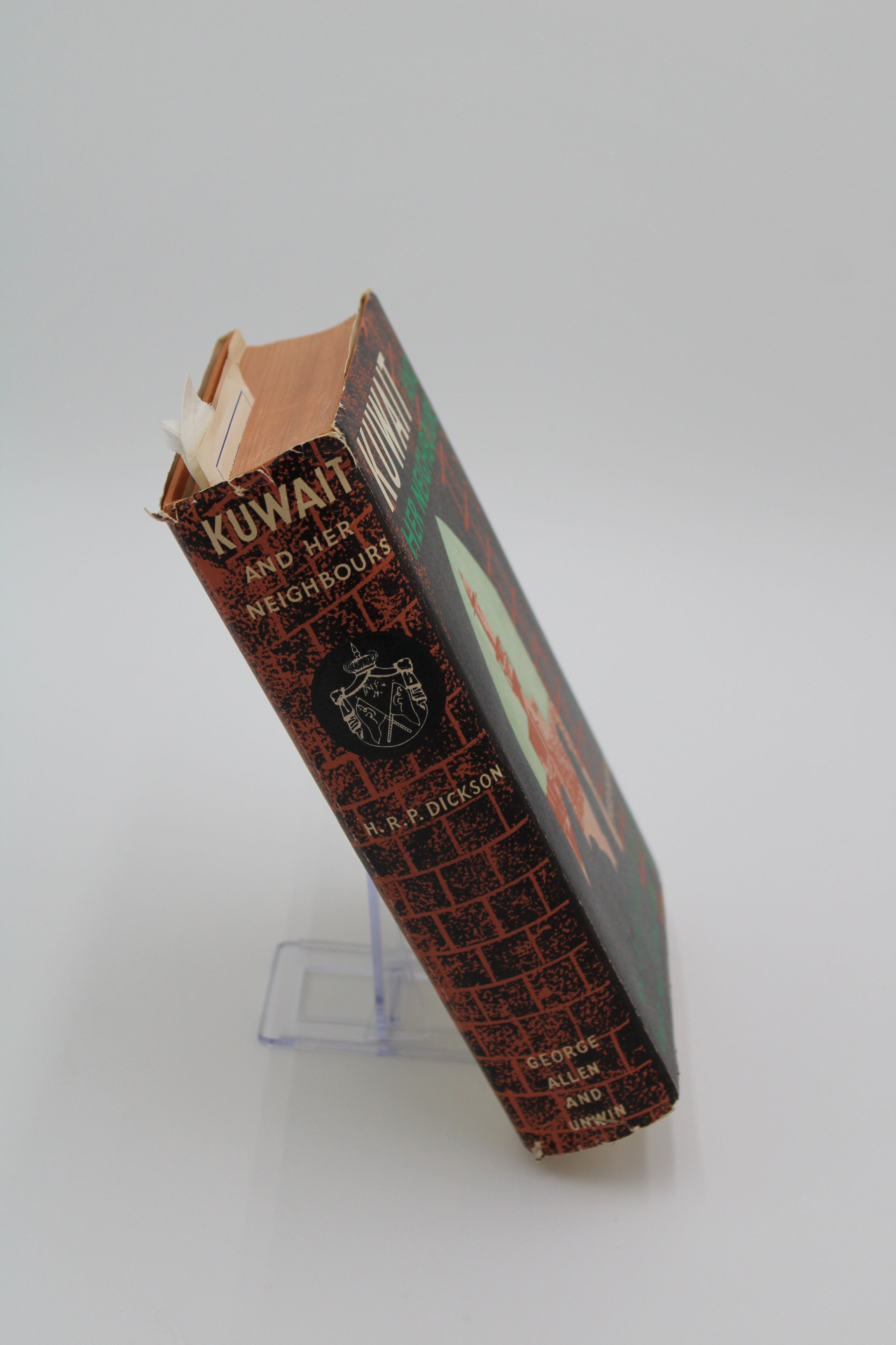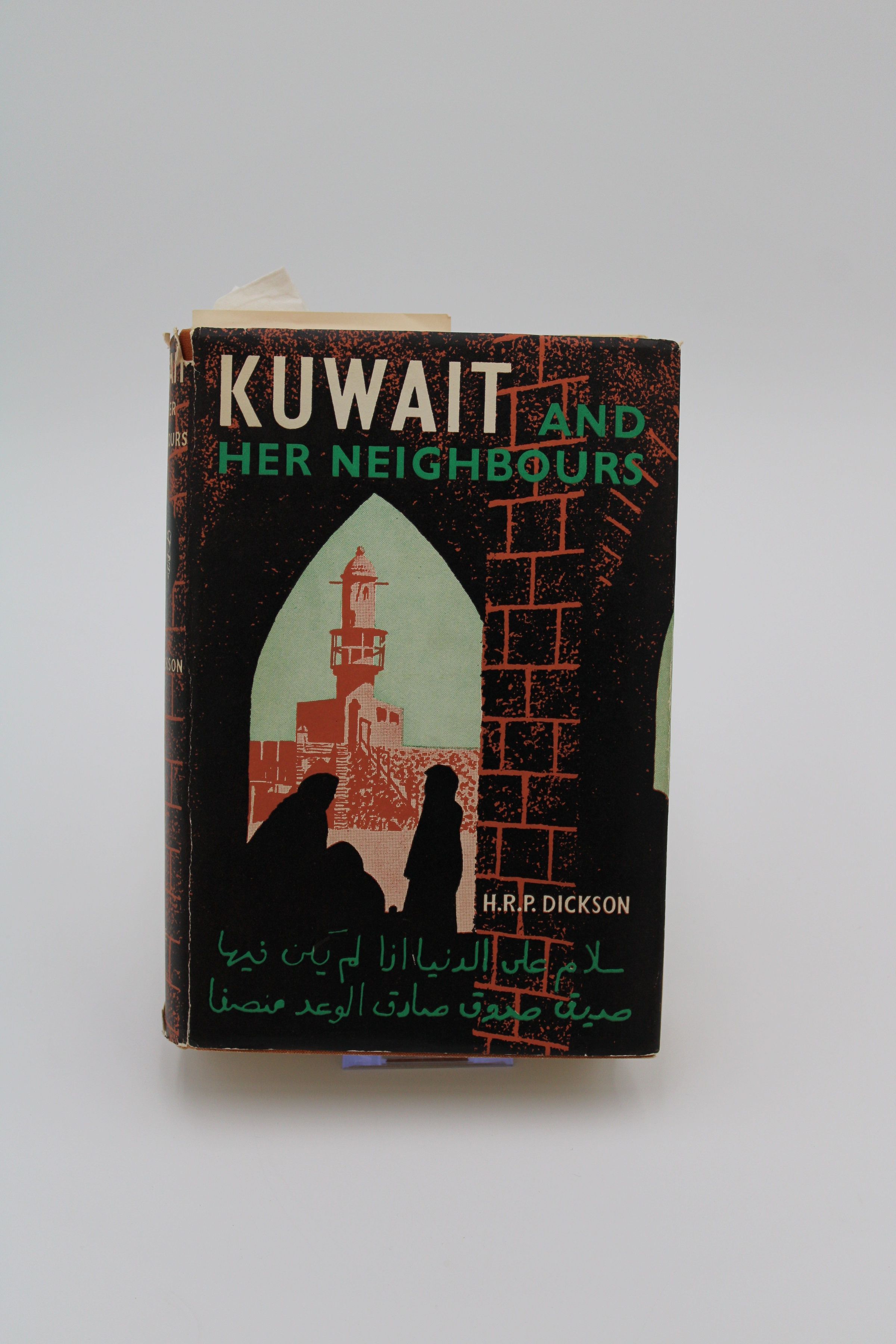The cover has an illustration of Kuwait people and Kuwait landscape in the colors red, black, and green. It features the title, "Kuwait and Her Neighbors," and the Author, "H.R.P. Dickson."
