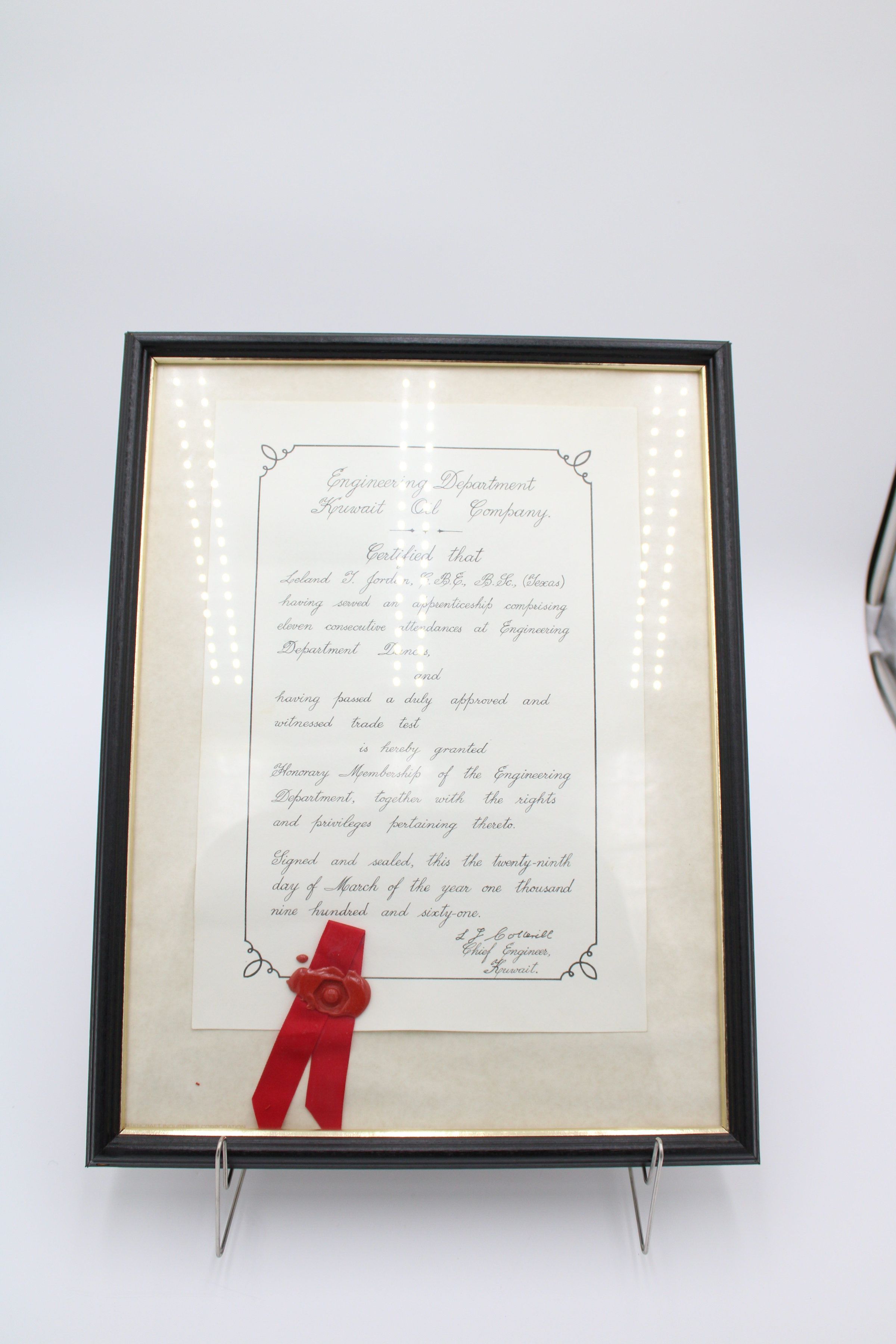 A certificate in a black frame with a red ribbon and wax seal. The certificate granted L.T. Jordan honorary membership in the Engineering Department in the Kuwait Oil Company. It is dated March 29, 1961.