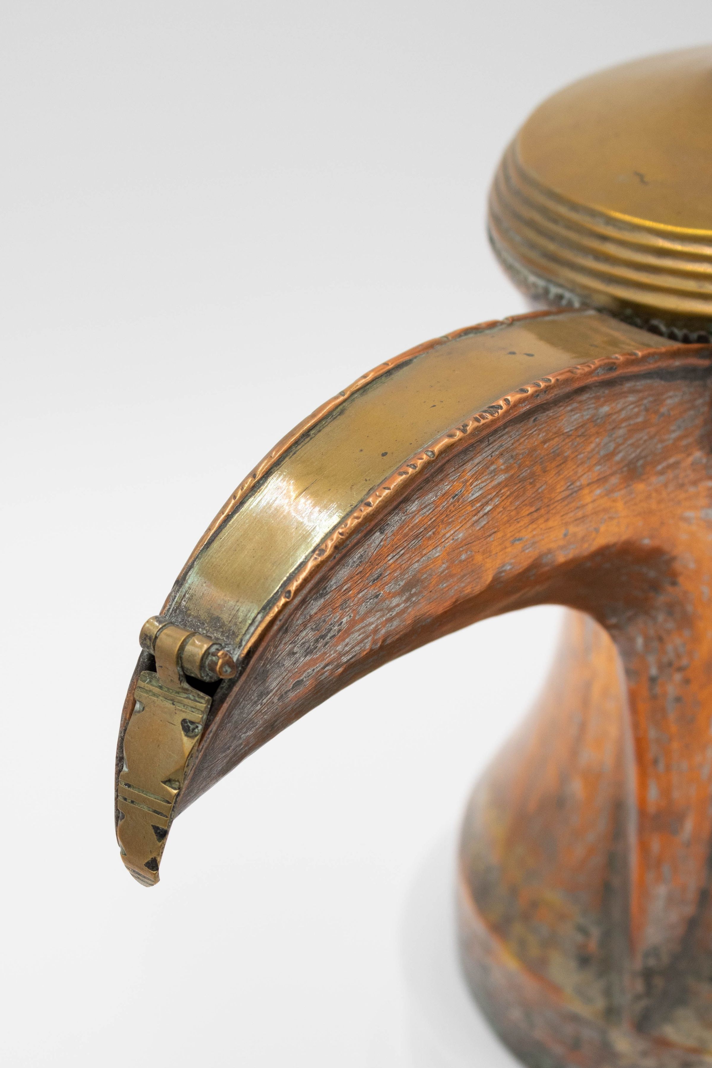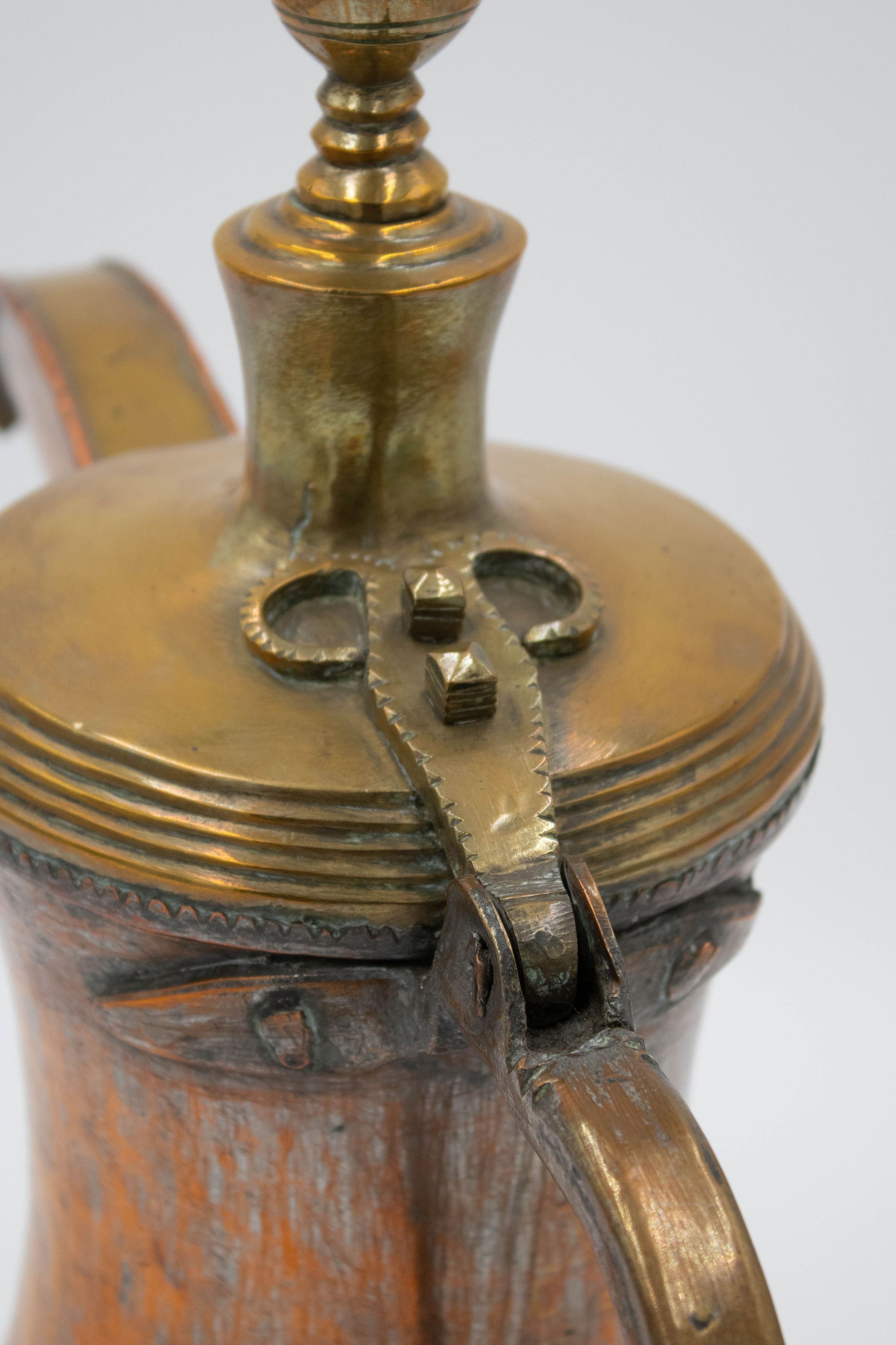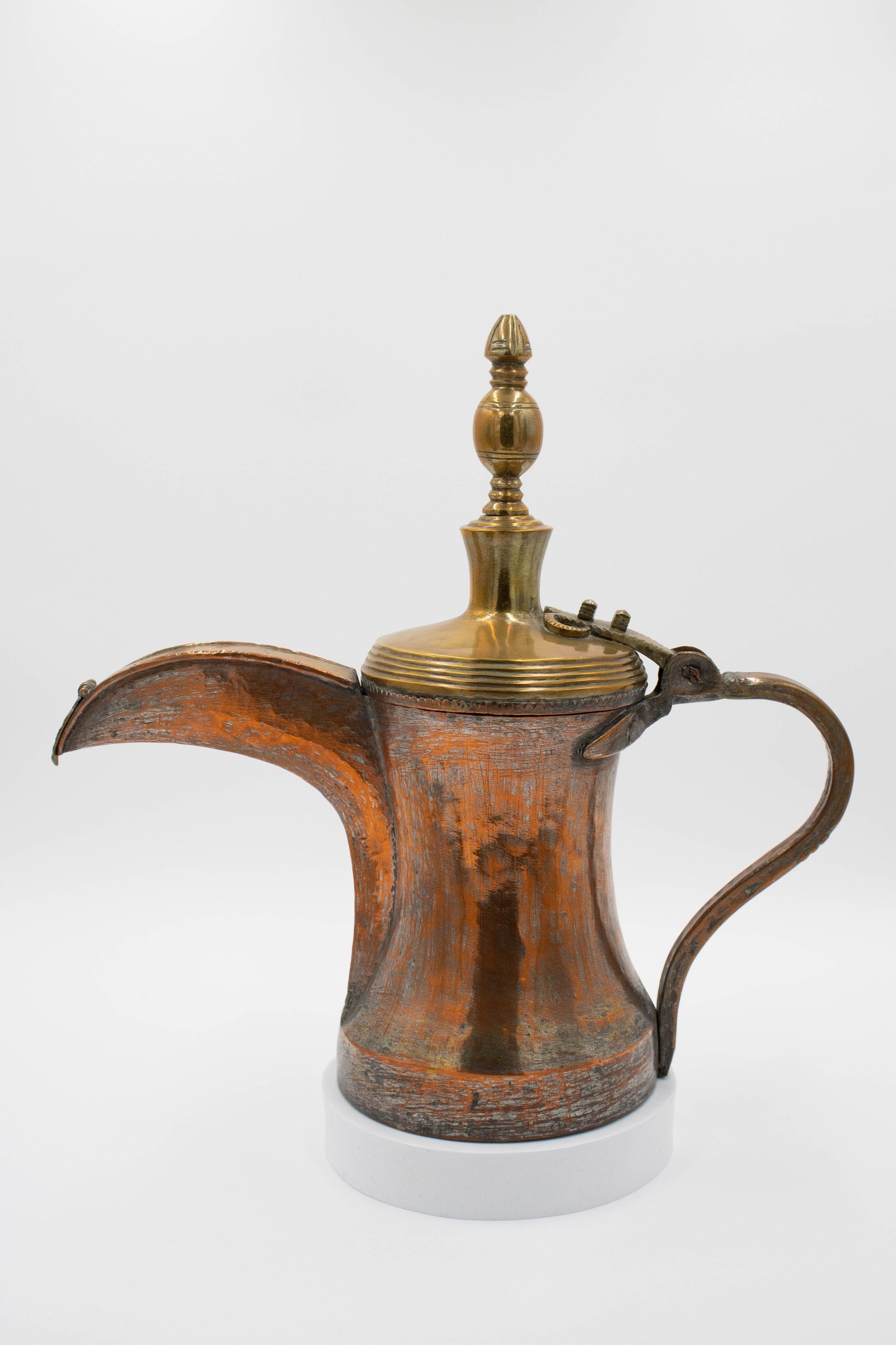 The image shows a large, vintage brass coffee pot with a curved spout. Its body has a worn appearance, adding character to its design. The pot has a single arched handle.