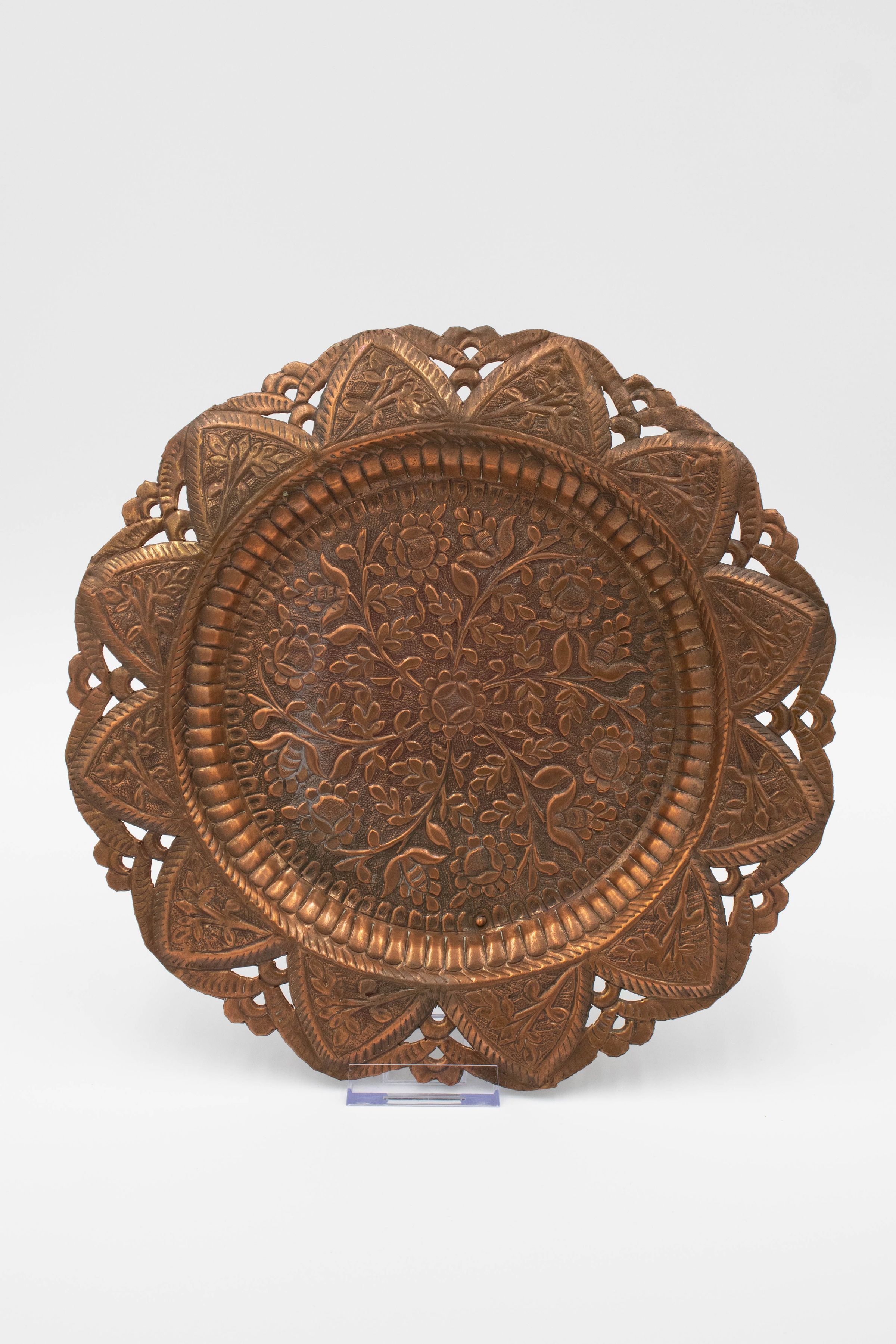 The image showcases a large brass plate intricately designed with an elaborate flower motif, featuring ornate floral patterns and decorative edges.