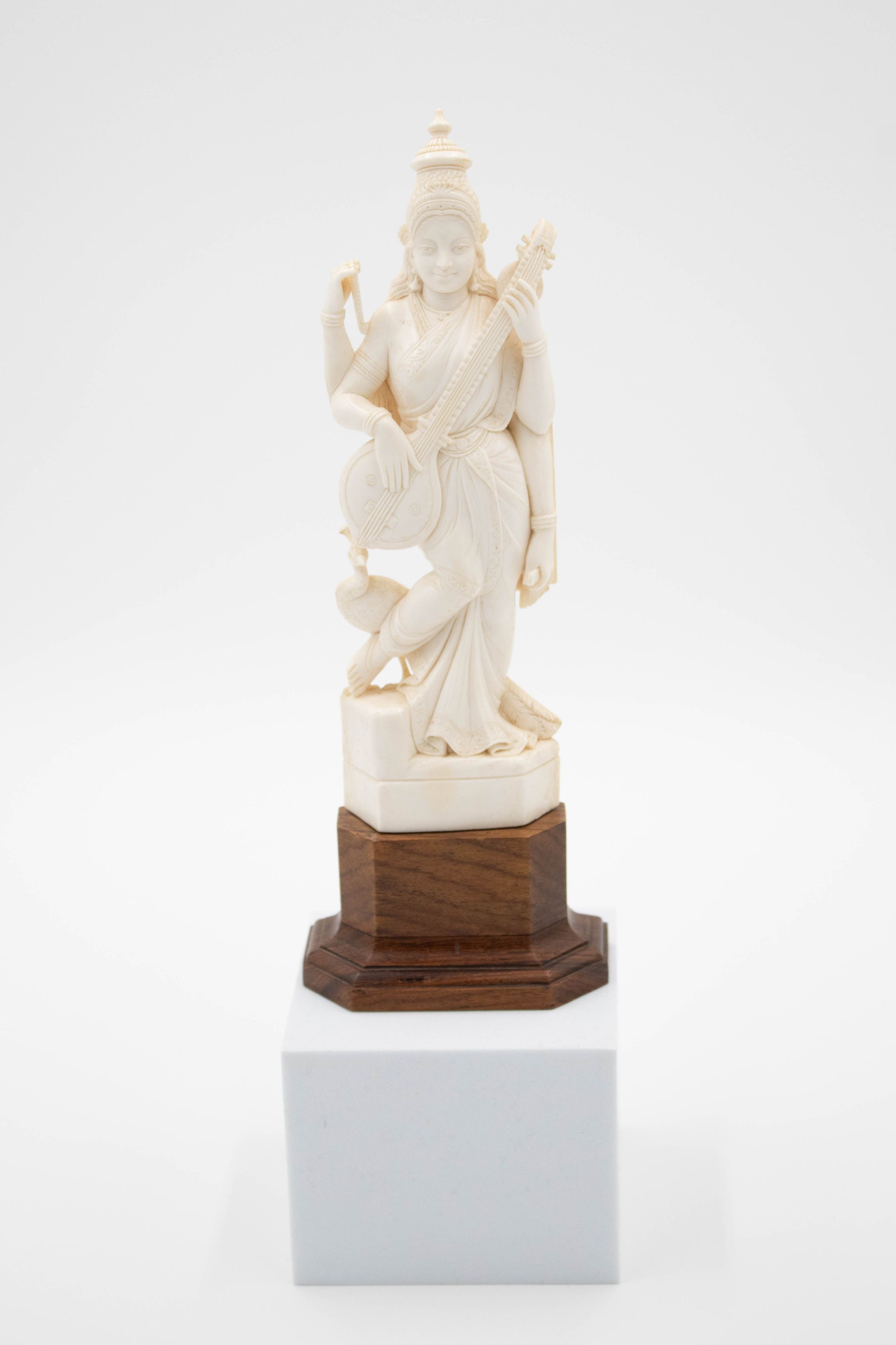 Carved ivory figure of the Hindu goddess Saraswati, mounted on a wooden base. She is playing a vina and has a peacock at her feet. It was made in the late 19th-early 20th century in India. Saraswati is a prominent Hindu goddess revered as the goddess of knowledge, learning, music, arts, and speech. She is often depicted with four arms.Context