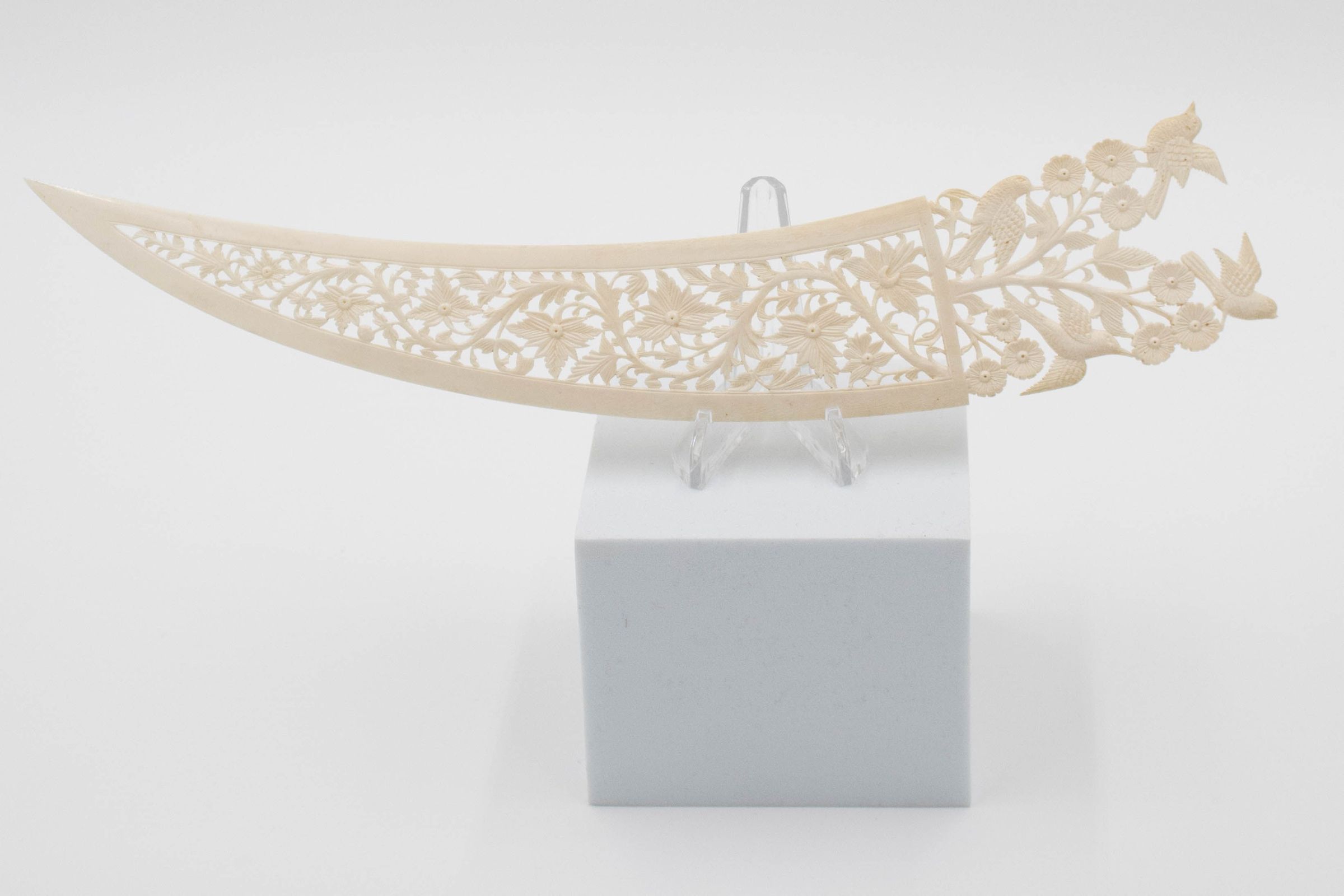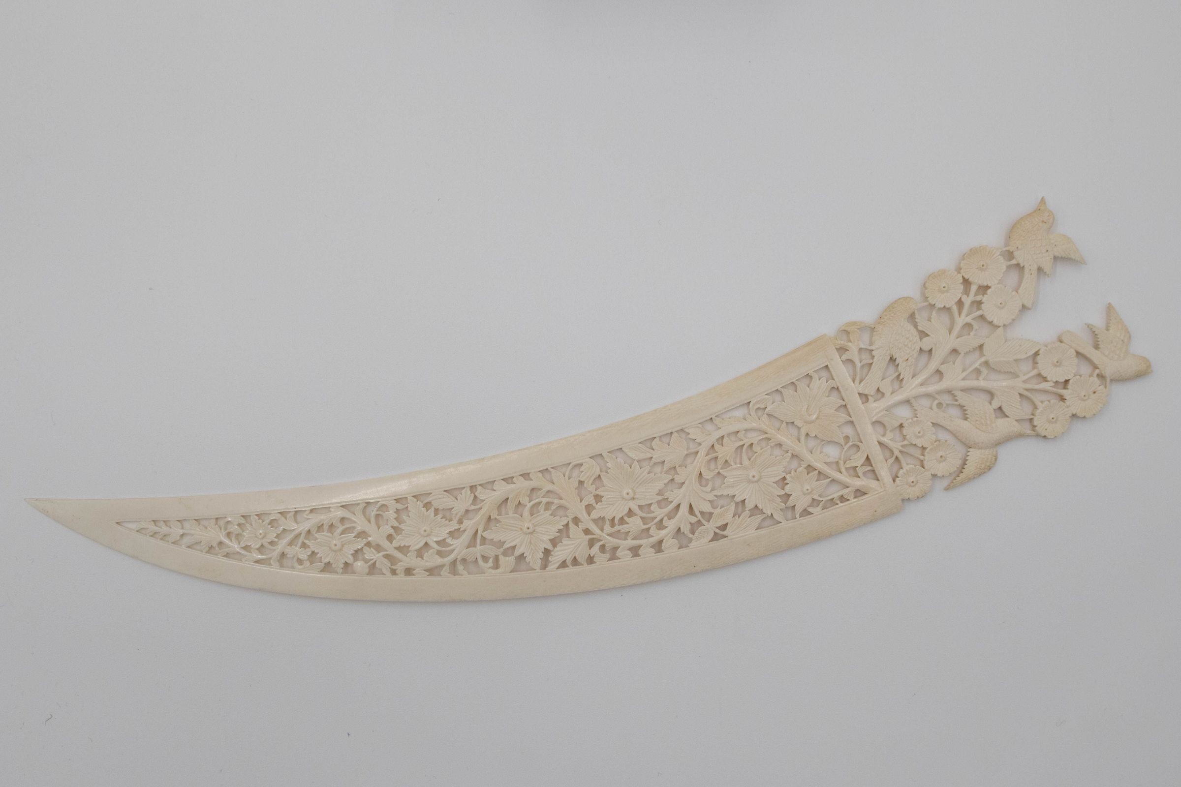 Large carved ivory letter opener with birds on handle.Context
