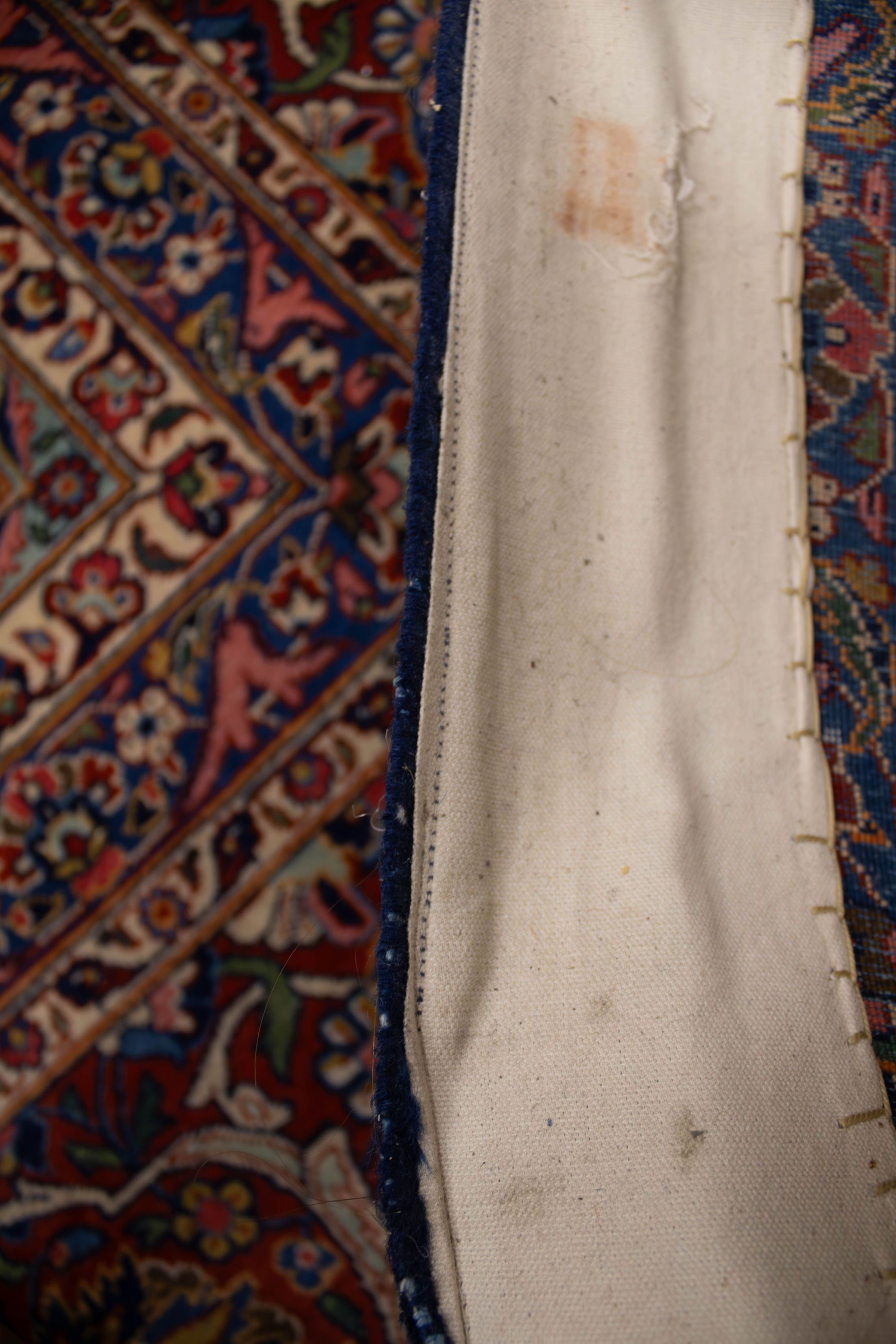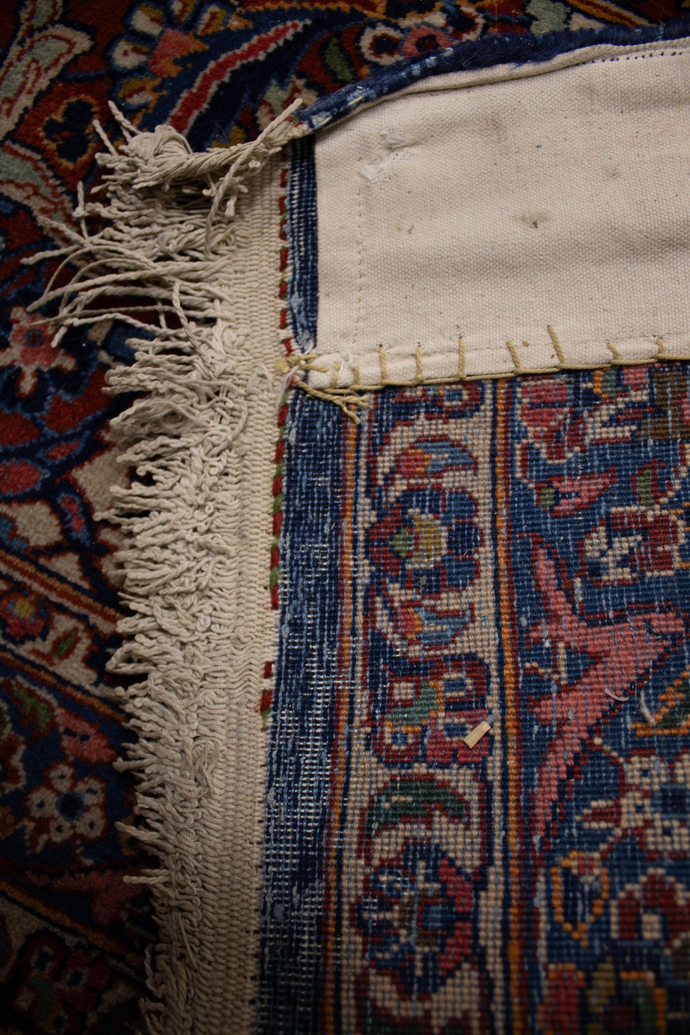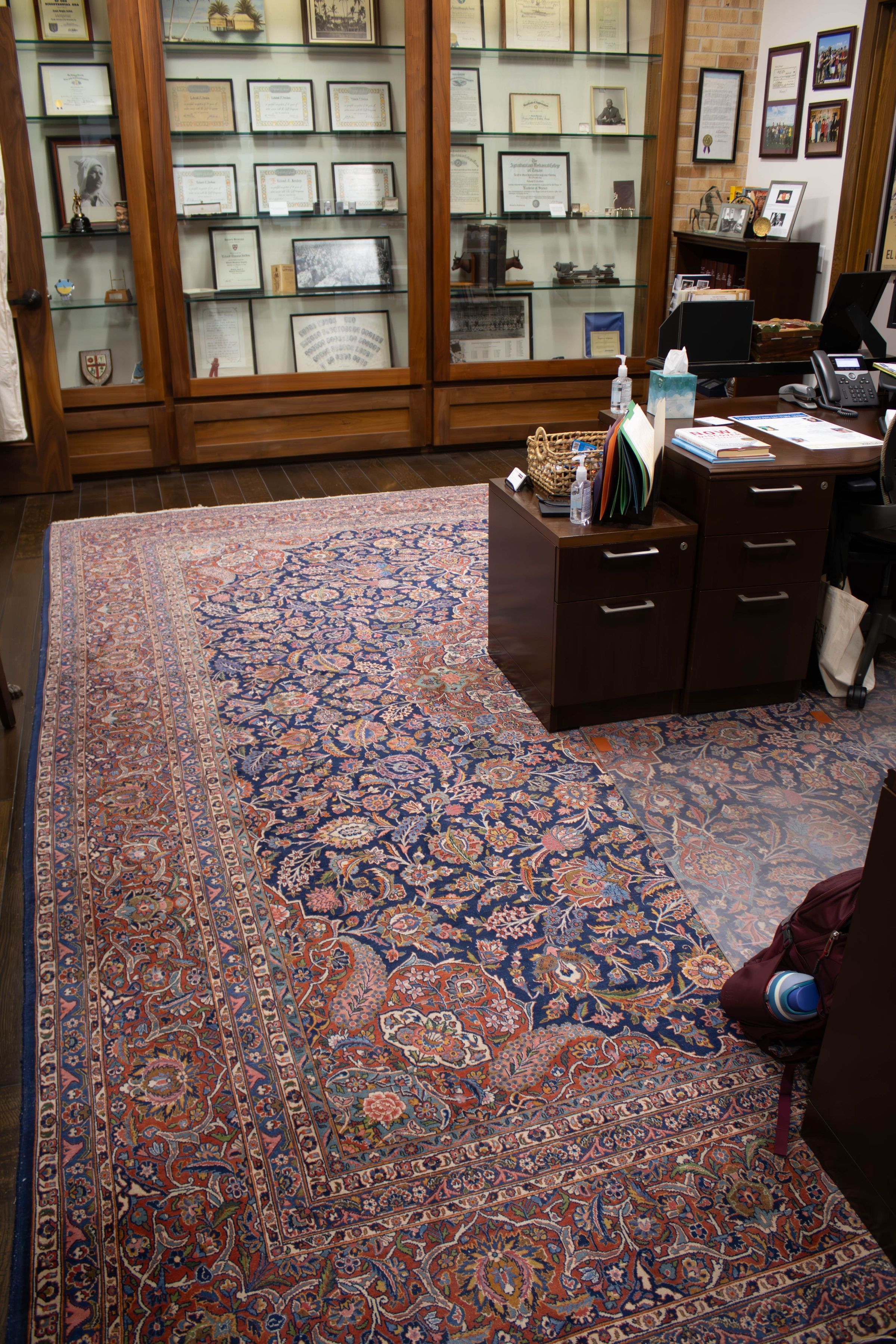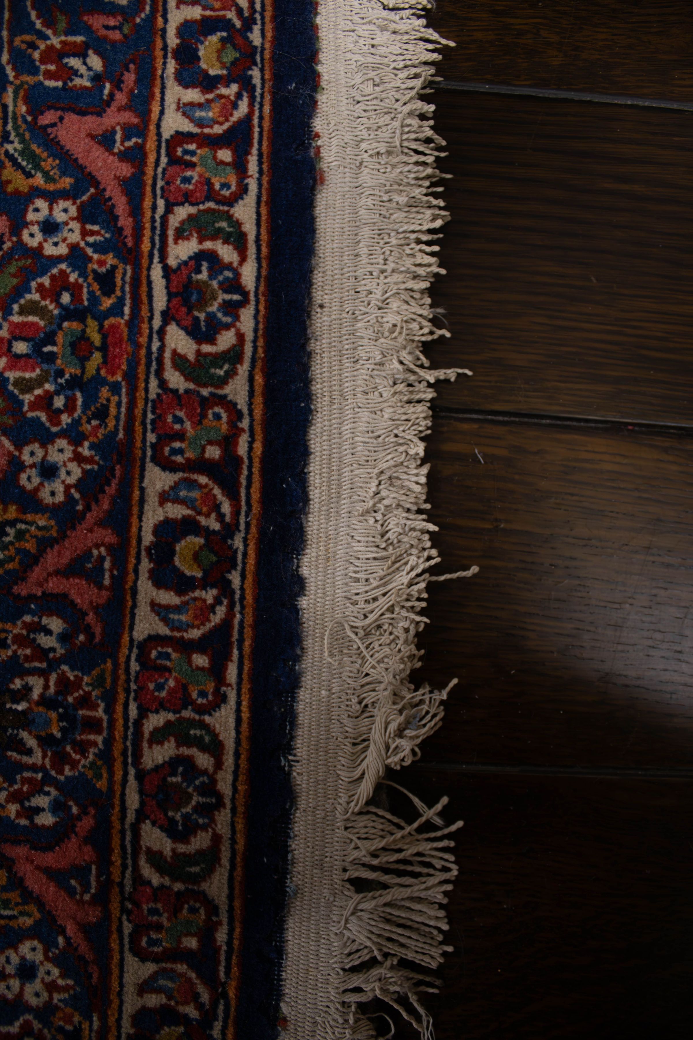A large area rug with blue and red details.