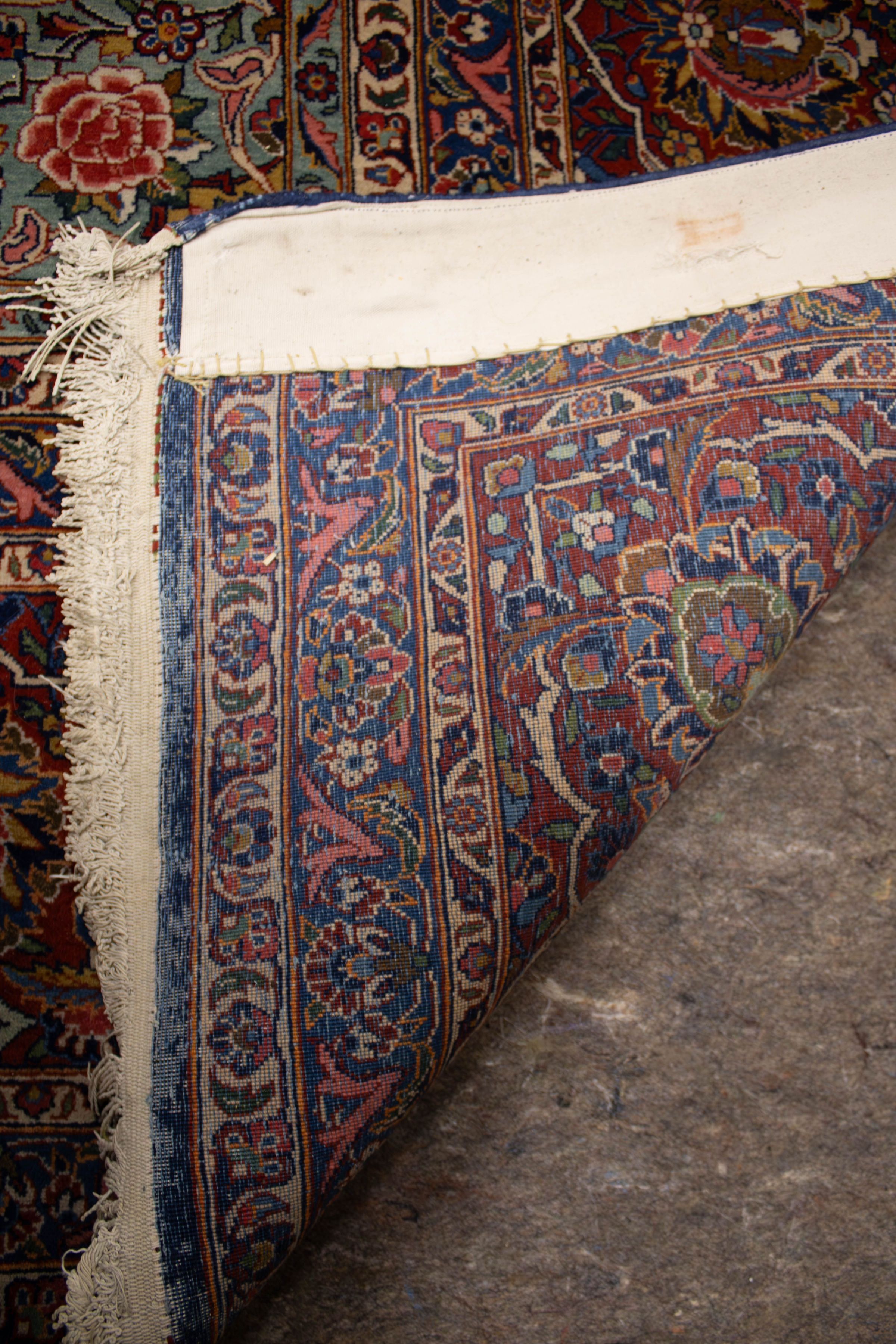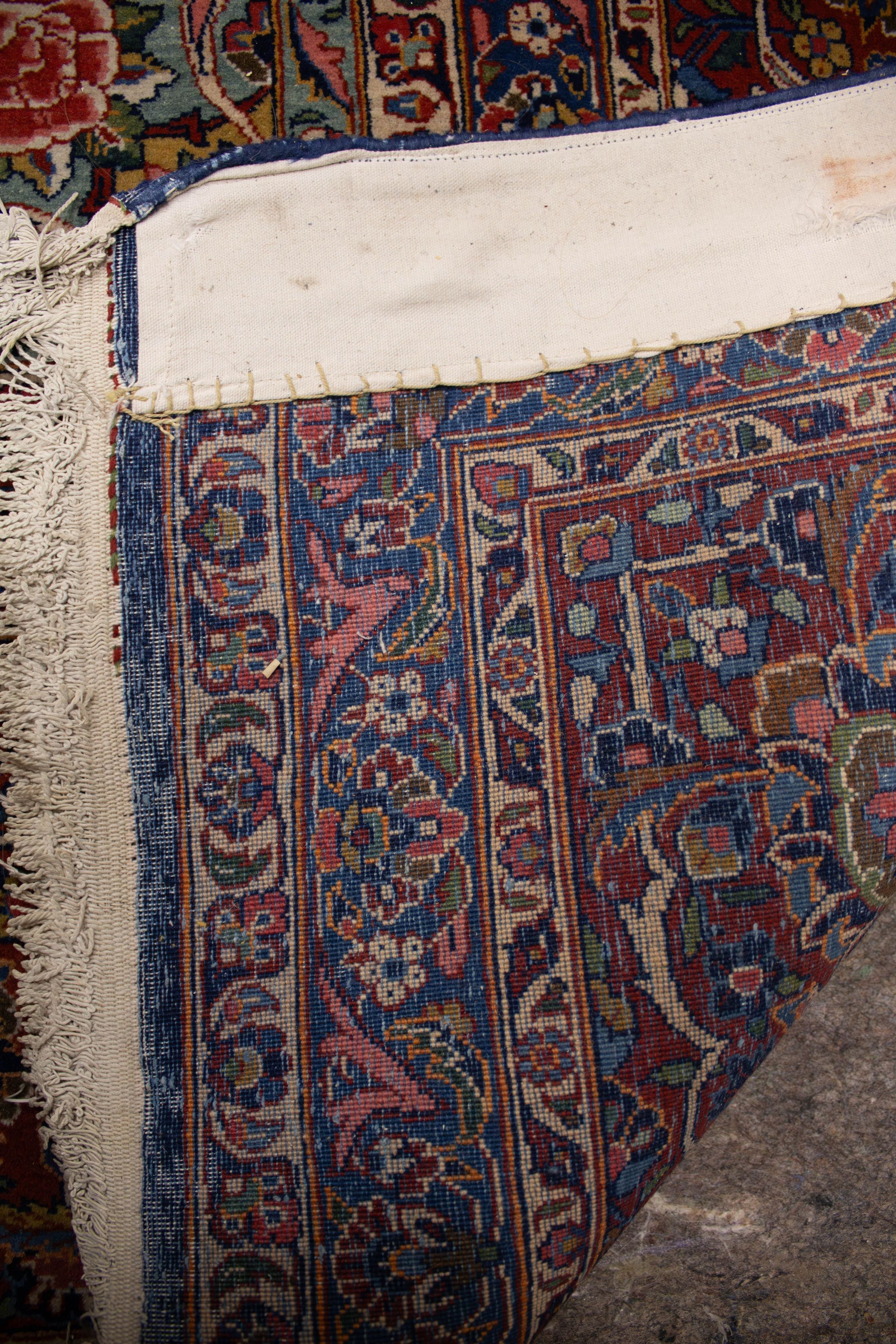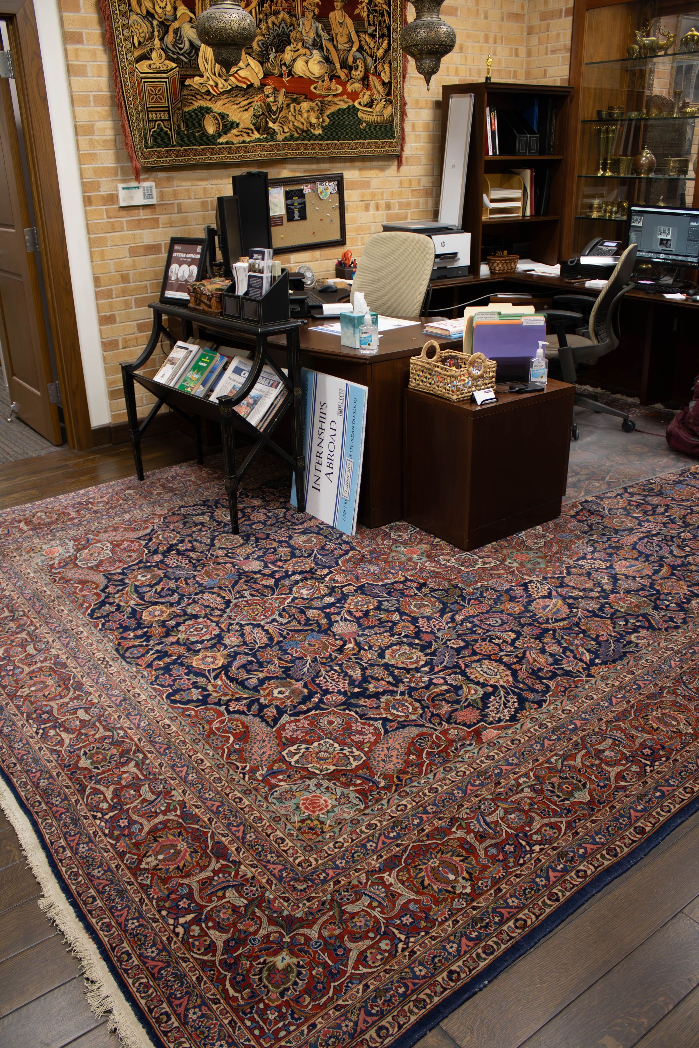 The room features a large, intricately patterned red and blue area rug with teal inner corners.